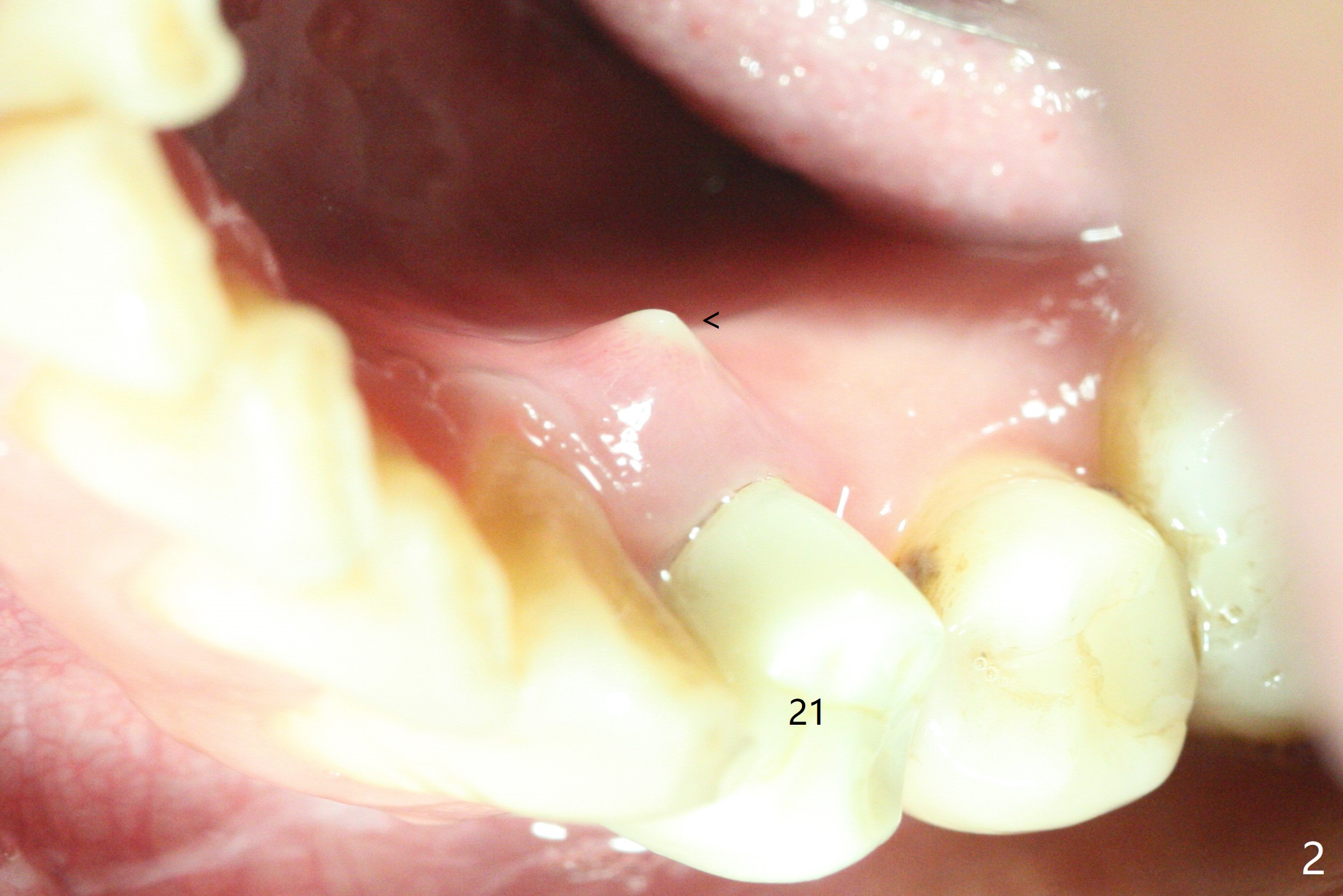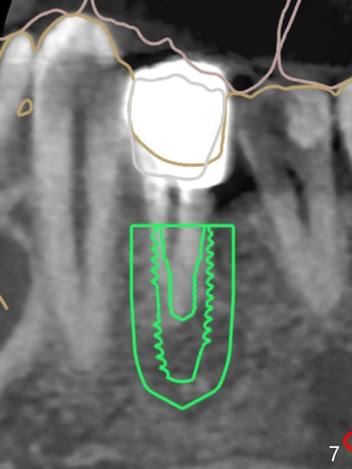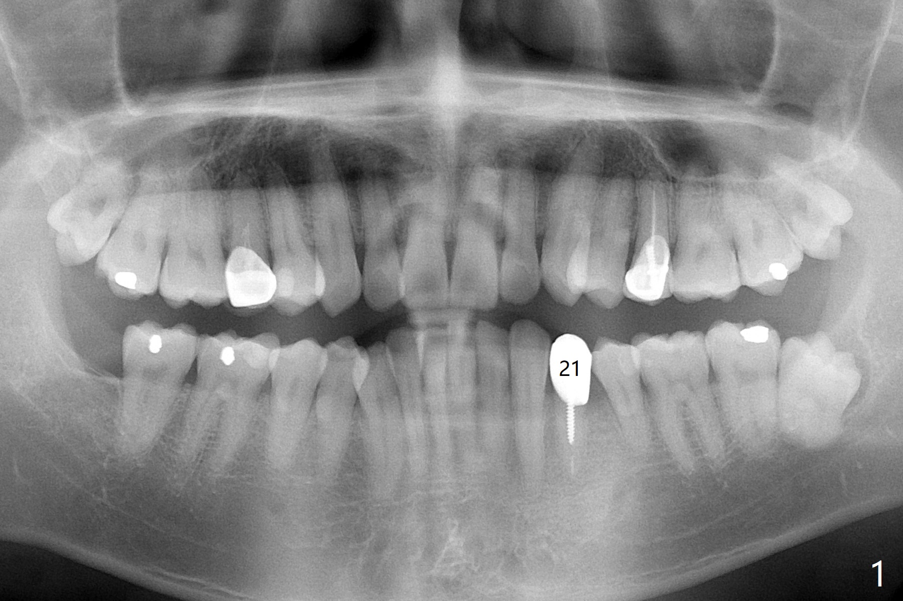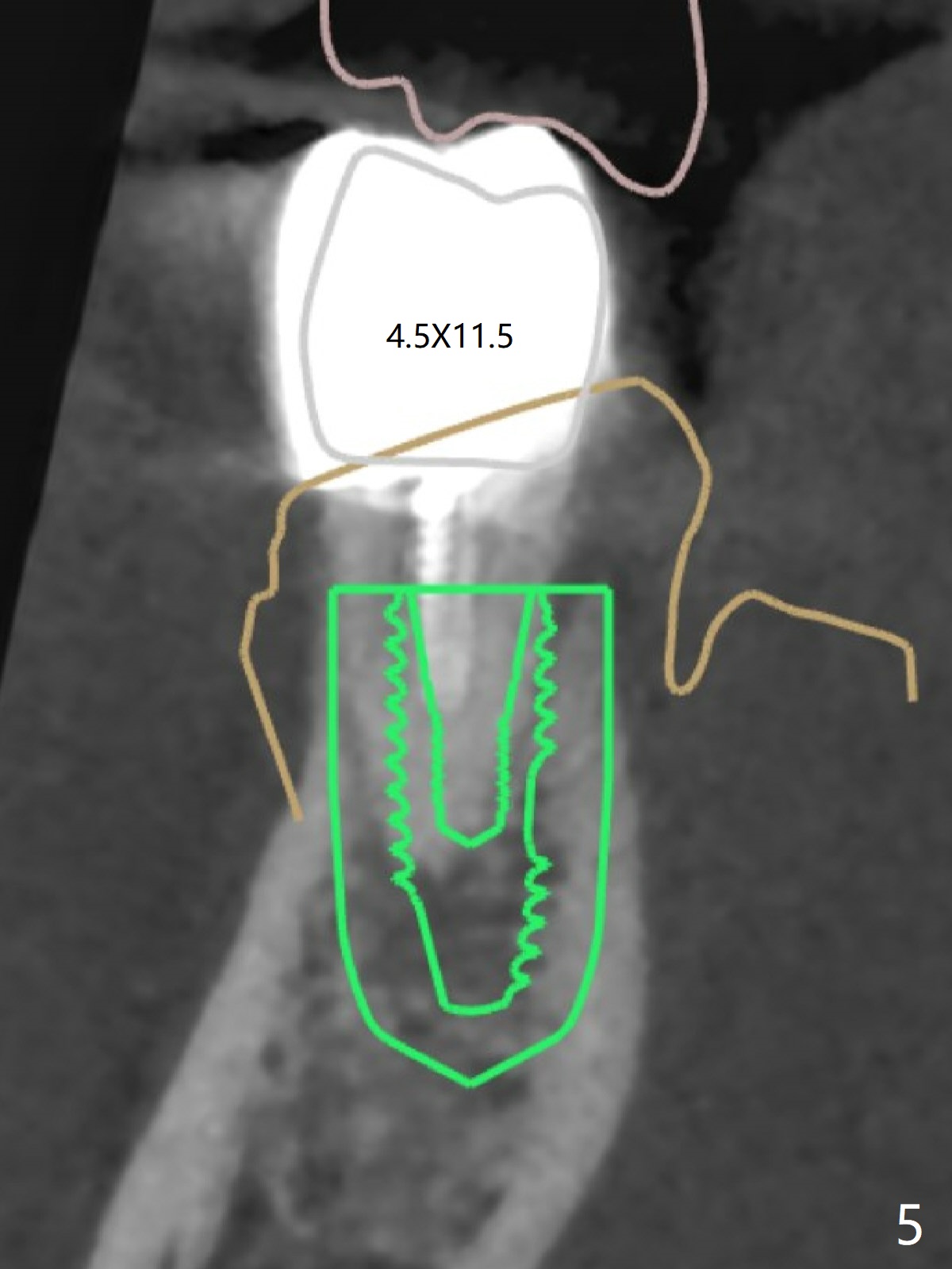 A 42-year-old man has been our patient for 3-4 years (Fig.1). An asymptomatic fistula develops lingual to the tooth #21 (Fig.2). An oblique fracture line appears to be next to a post (Fig.3 ^). A 3.5x11.5 mm implant seems to be able to be placed immediately lingual to the thick lingual plate with guide (Fig.4 L). No buccal deviation will occur with sufficient buccal gap. Design of an immediate implant at #21 (coronal section, Fig.5). In fact the root remains in place first (i.e., extract the crown first, Fig.5'). When osteotomy is done with the last drill 4x11.5 mm, there will be no deviation because of even counteraction between the buccal root and the lingual plate (Fig.6'). Then the root will be removed. But the 4.5x11.5 mm implant may be deviated buccal because of implant engagement into the lingual plate without buccal counteraction. Therefore, a 4x13 mm implant will be placed following 3.5x13 mm (last) drill. The implant is placed between the mesial and distal walls (Fig.7 sagittal section).