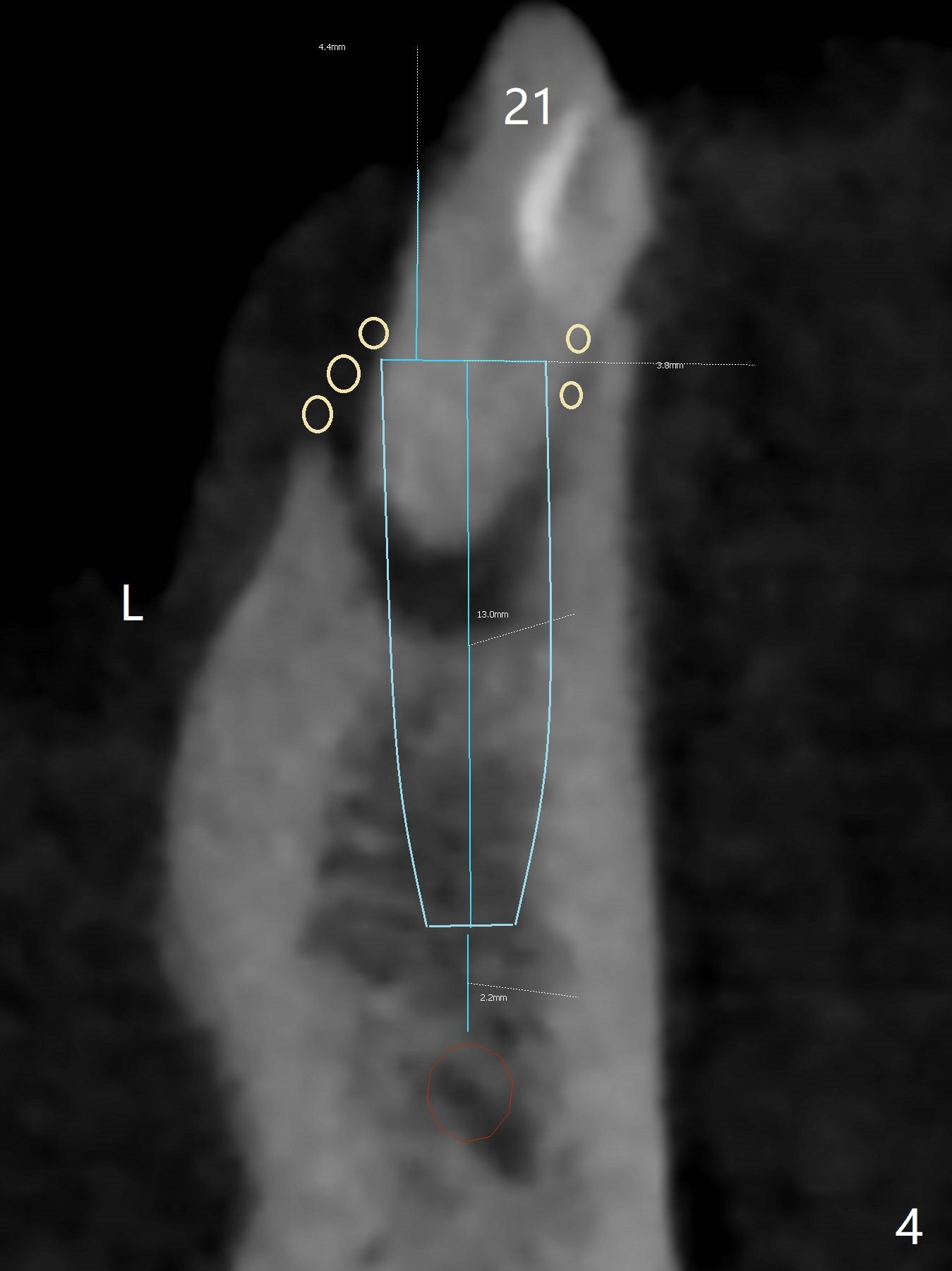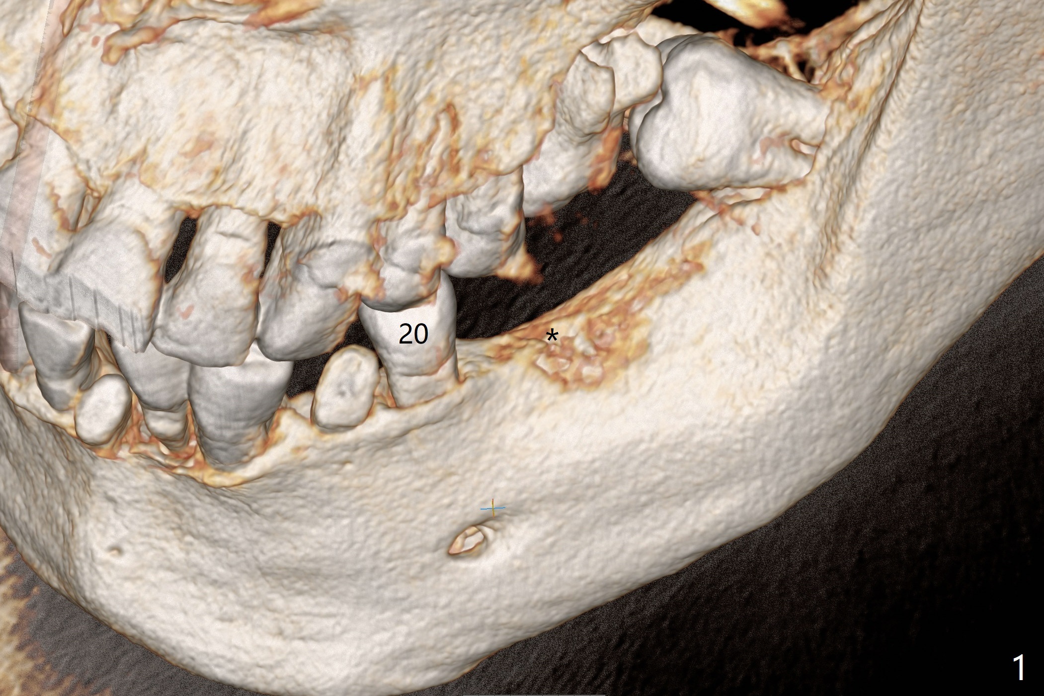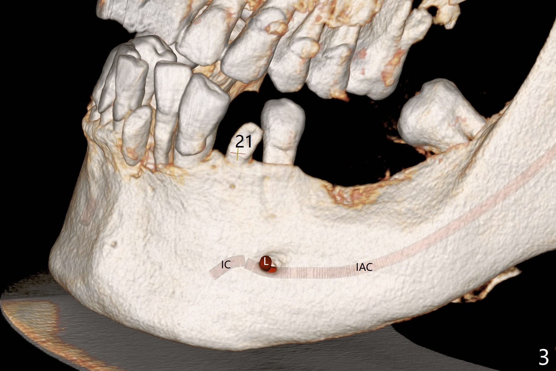 A 54-year-old man has poor dentition, including missing tooth of #19 and residual root at #20 (Fig.1). The lingual crest (Fig.2 (lingual view), Fig.4 (L)) is lower than the buccal one. The Inferior Alveolar Canal (Fig.3 IAC) becomes the Incisive Canal (IC, Fig.4 red circle) after the Mental Loop (Foramen). An implant at #21 will be placed at the level between the buccal and lingual crests (Fig.4) with osteotomy initiated in the middle of the socket. Bone graft is to be placed around the coronal end of the implant (yellow circles).
