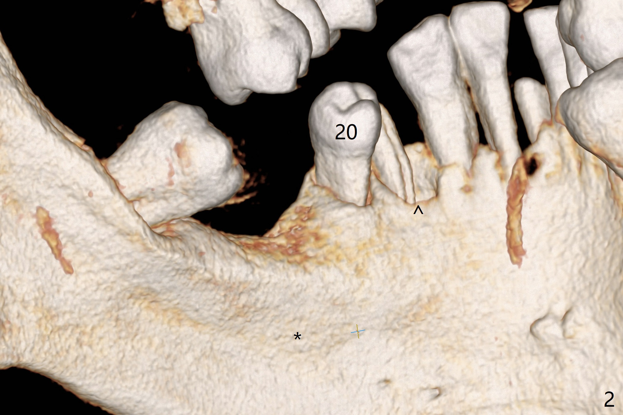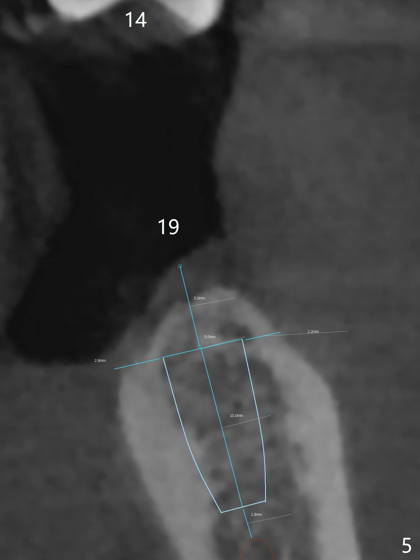 The socket at #19 appears to have not completely ossified (Fig.1 *, Fig.5). Use Magic Split and Magic Expanders to expand the ridge top so that an implant will be placed higher for favorable crown/implant ratio (reduce abutment screw loosening). Note the concavity at the site of #19 while osteotomy (Fig.2 *).