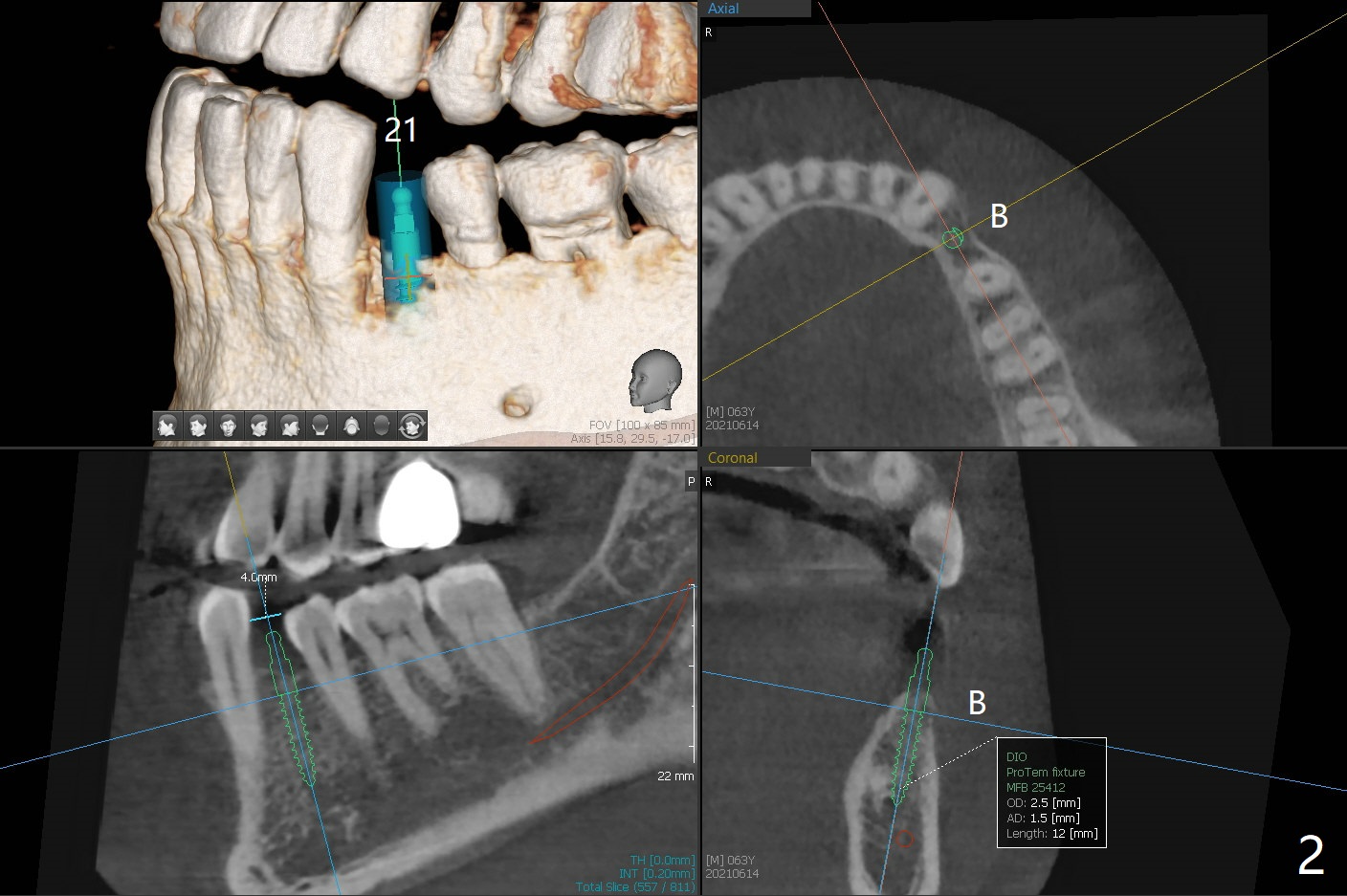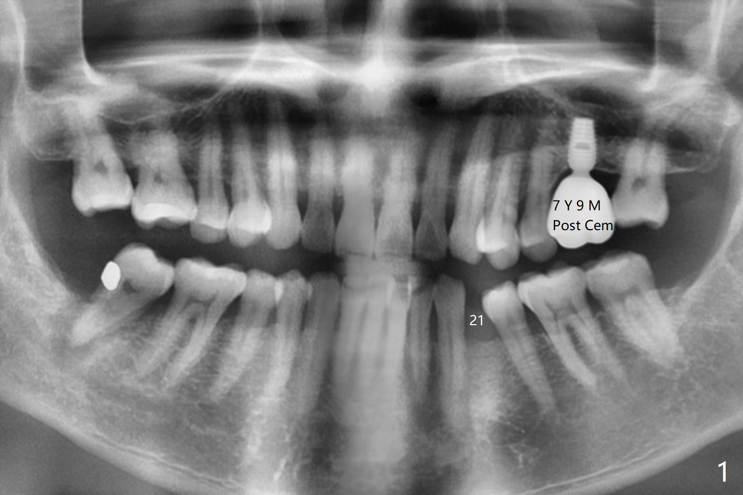 63岁男左上第一磨牙种植牙冠粘固后7年9月,终于同意在21号牙种植(图一),好像近远中间隙突然变小到不得不做牙齿矫正,其实下前牙拥挤(图二),可以关闭第一前磨牙间隙,或者推第二前磨牙和两个磨牙远中增加空间。缺牙间隙大约4毫米,能单纯植入2.5毫米一段式植体吗?而两旁牙齿邻面稍加修改来解决空间问题?