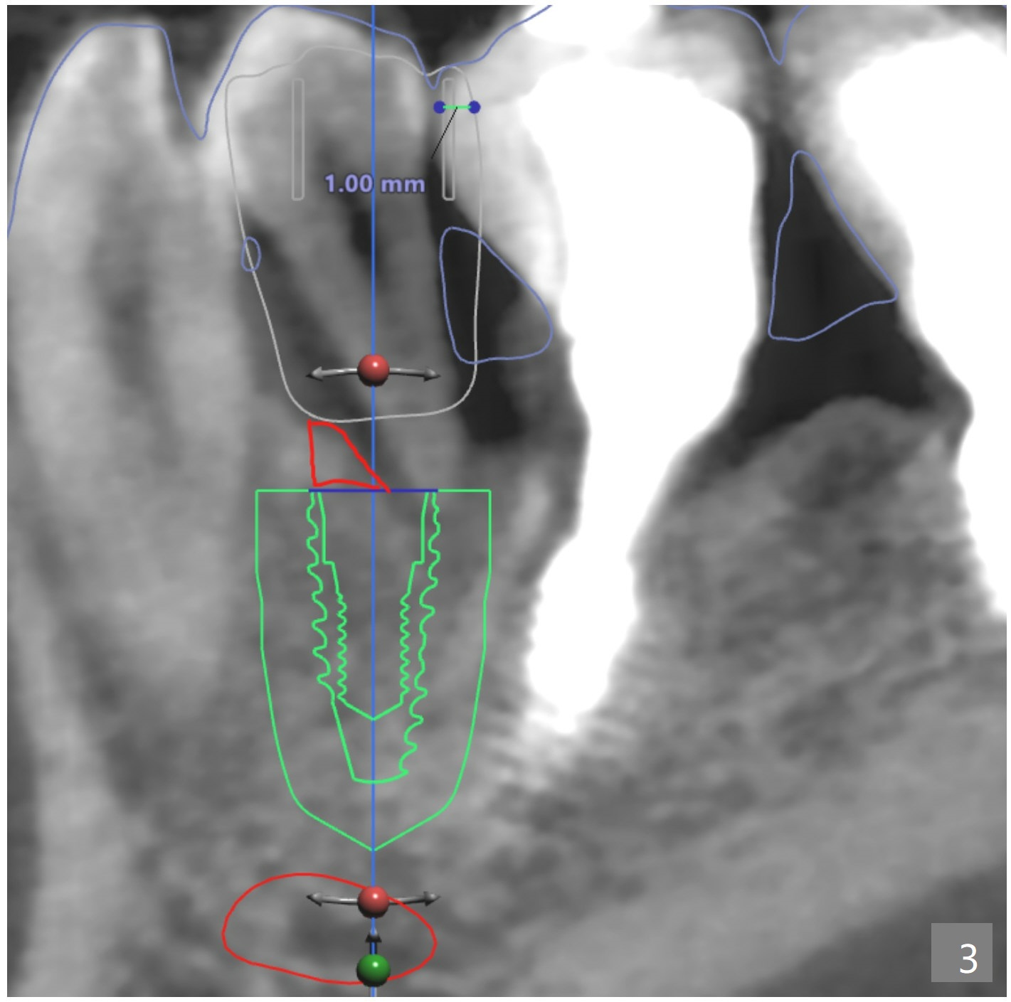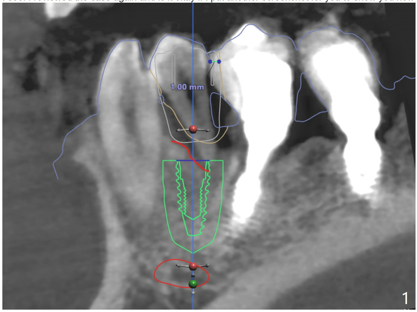 I am guessing the reason of the deviation would be the slanted surface of the bone. And when you see the red marked site (Fig.3), that shows white color (which also means dense bone). If there was more space, we could've used a regular metal sleeve and plan for a bone trimmer prior to the initial drilling, but this case, we couldn't do that. Narrow metal sleeve was used with 12mm of max offset. So, in this kind of case, I am sorry to tell you but we might have to manually remove the excessive bone to flatten the bone surface for osteotomy before implant placement when the regular bone trimmer can not be used.