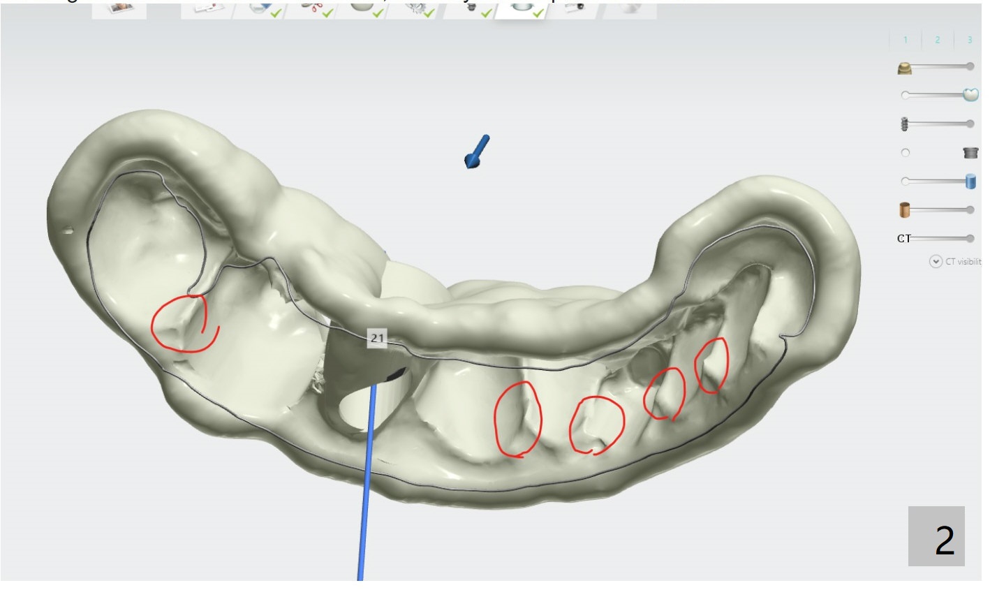 Q: To place an implant at #21 (narrow space), you advises me to trim the mesial surface of the tooth #20 (see the 1st attachment). I did, but I do not know how much to trim. As a matter of fact, deviation occurs (2nd attachment), although immediate restoration is just fine. Ever time we need to make trimming, deviation occurs. In the future, I have to trim before CT and impression. Right? What else can we do? Thanks.And the reason of implant deviation towards distal is not because of we planned to adjust the mesial contact of #20. Adjusting the contact is only for guide insertion. Due to insufficient space for narrow metal sleeve, adjusting the mesial contact of #20 was suggested. When you look at the inner part of the surgical guide, those inner parts of interproximal are holding the guide steady during the osteotomy (Fig.2). Again, adjusting the contact does not mean that the whole guide will be shifted to that side, but only for the path of insertion.