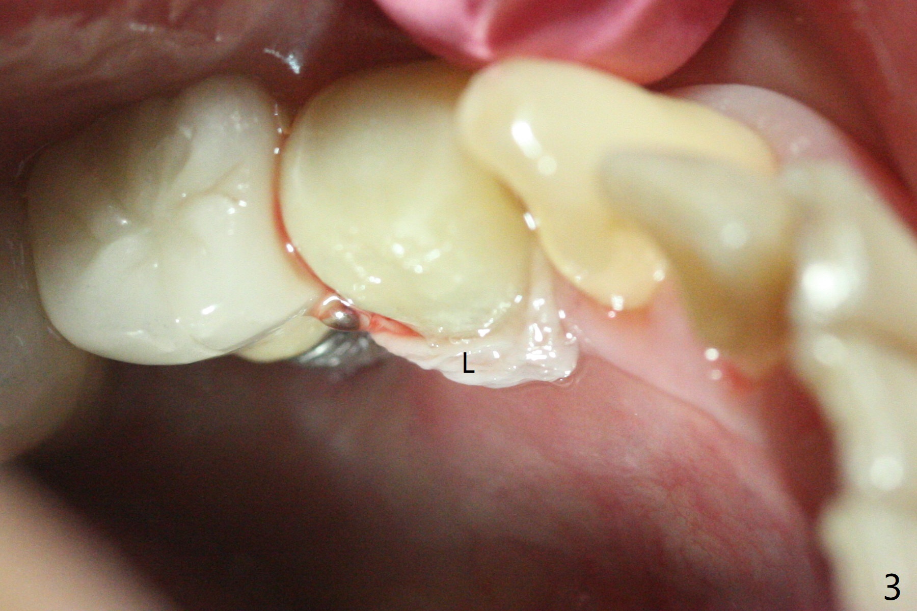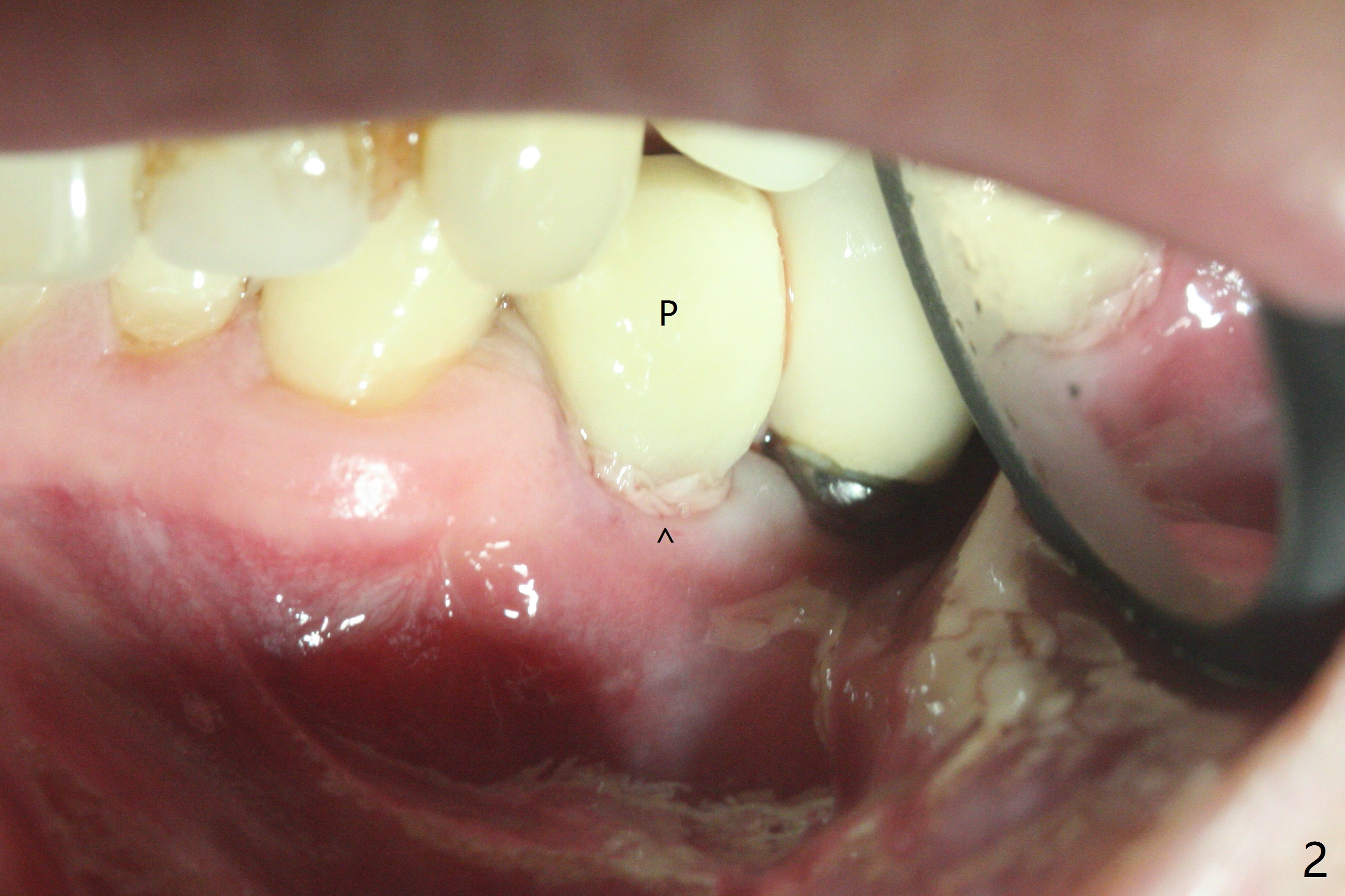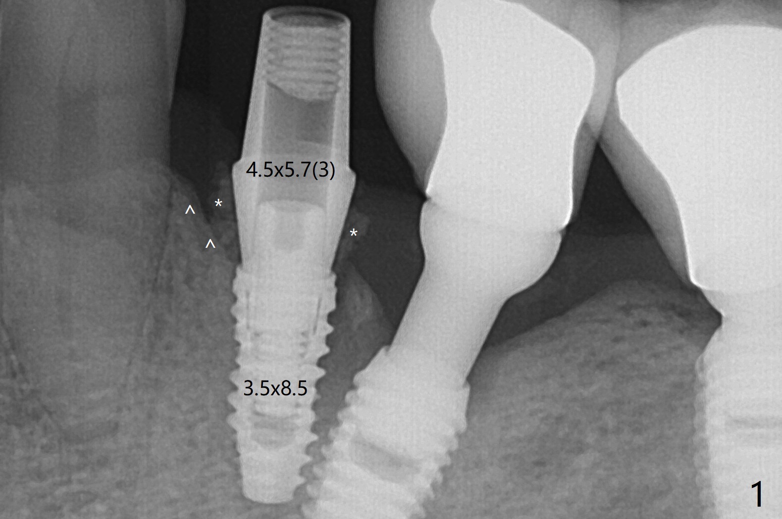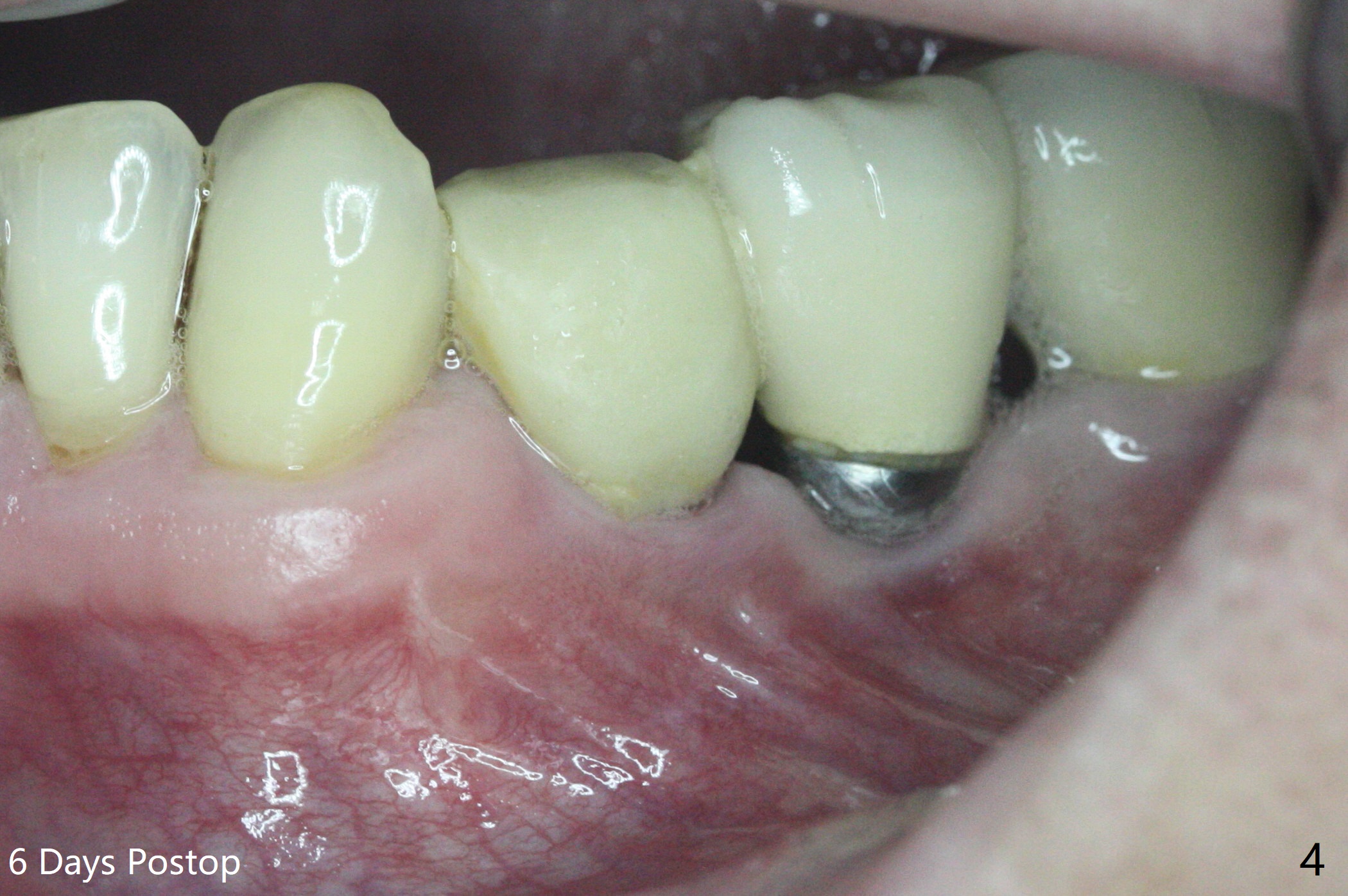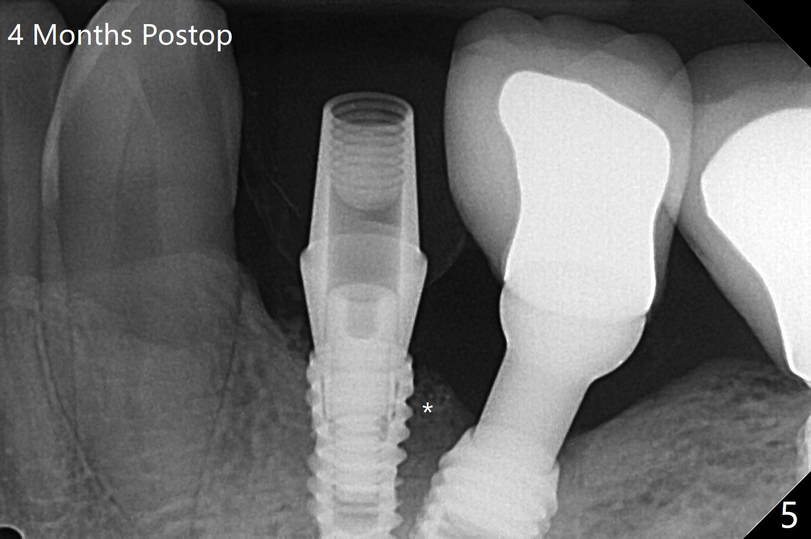 尽管使用导板,钻洞也不快,左下4植体仍旧偏移远中(图一)和颊侧(颊侧间隙比预计小),原因:斜面(图一:箭头),骨质硬,周围牙冠射线折射,导板就位前必须磨第二前磨牙近中面(今后遇到这些情景,选择徒手种植)。庆幸的是牙槽嵴水平两个植体还不是最接近(与根尖相比),粘性植骨(图一:*)但愿能缓解术后骨质吸收。制作临时牙冠后(图二:P),将PRF(图二:^;三:L(舌侧))插入牙冠和骨粉之间。术后六天软组织愈合正常(图四)。术后4个月远中牙槽嵴稍微下降(图五:*)。由于基台偏向远中,为了防止牙冠基台重新插入困难,基台不取出,先拧紧(20Ncm),牙冠口内粘固。