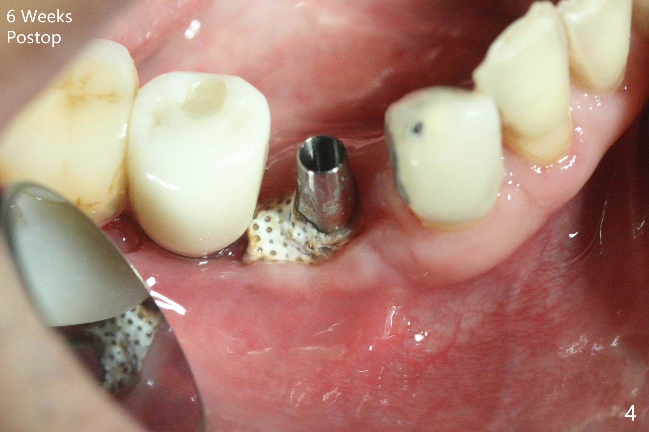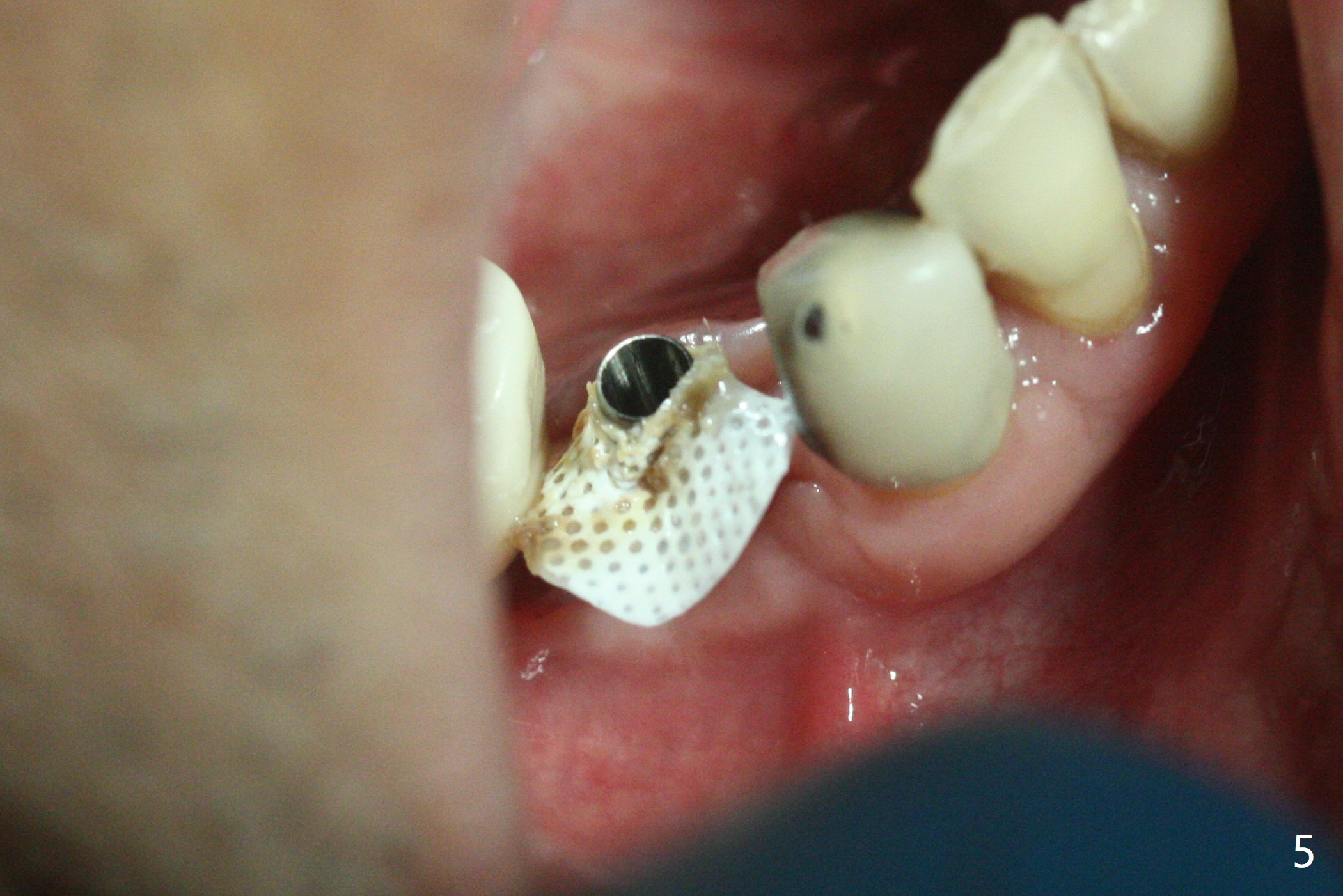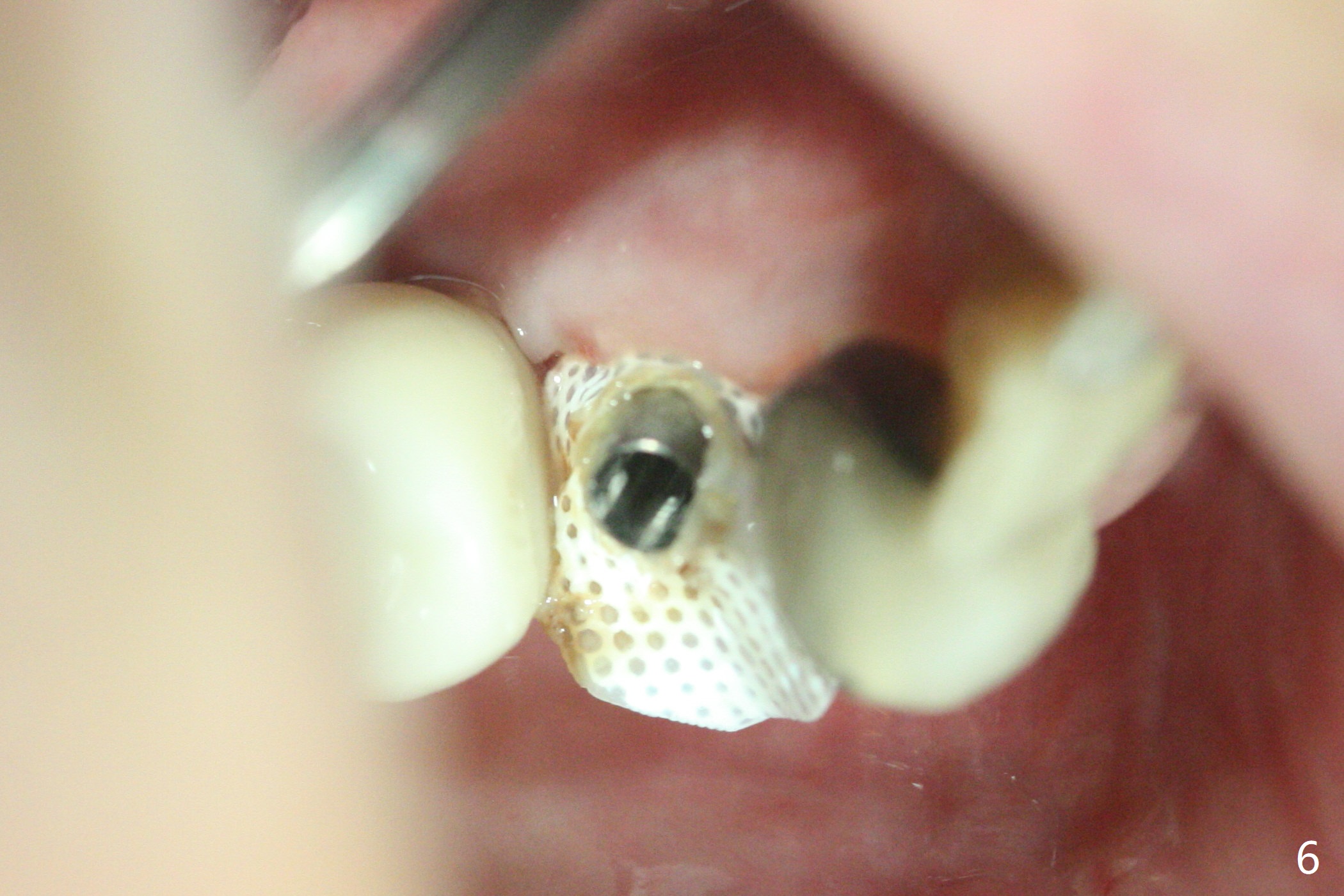 28牙位3.5x8.5毫米植体导板植入后,颊侧远中螺纹暴露,为了植骨,附近骨壁钻洞创造出血点以及放置基台(图一:5x7.5(3)毫米)。放置粘性骨粉后(图二:*),覆盖薄层PRF,后者可能很快吸收,为了防止骨粉暴露,放置不可吸收膜(图三:*),当中打洞,穿过基台固定,表面缝合。术后六周不可吸收膜部分暴露(图四)。图五,六显示在取出时膜当中固定用的洞,下面伤口愈合正常(图七)。