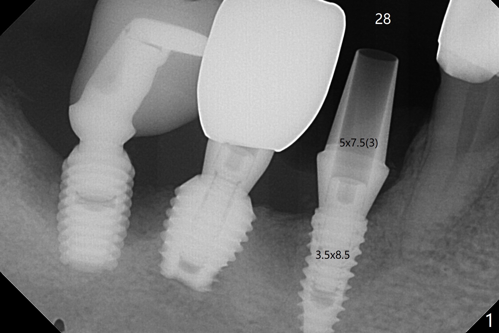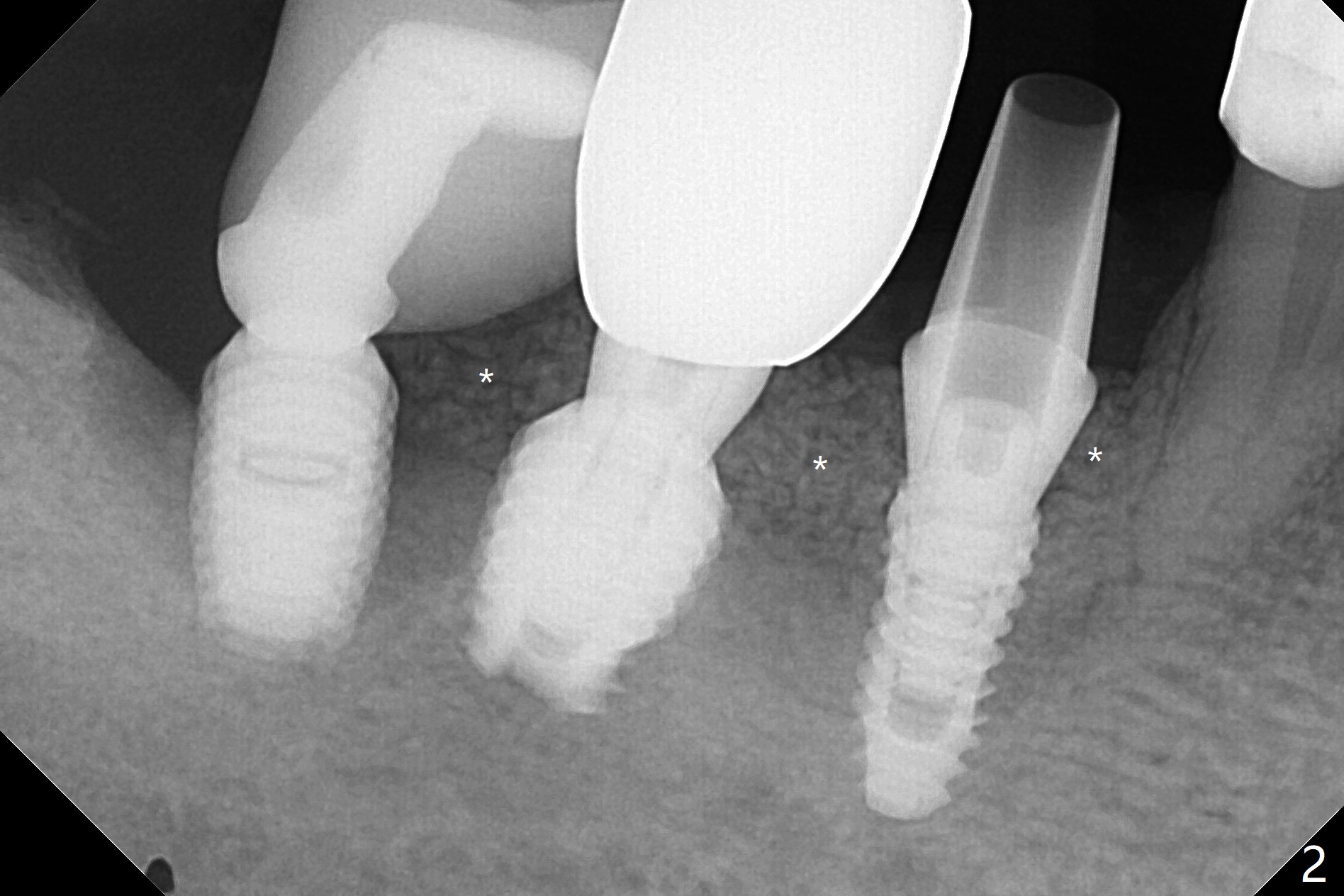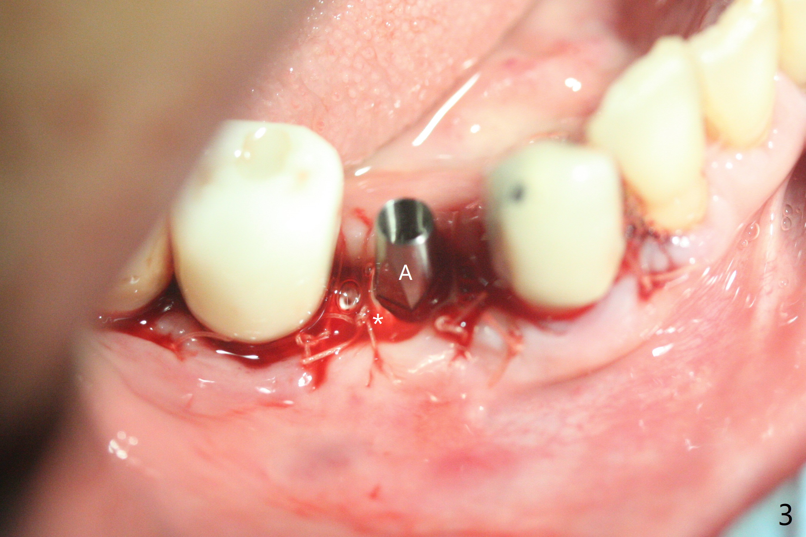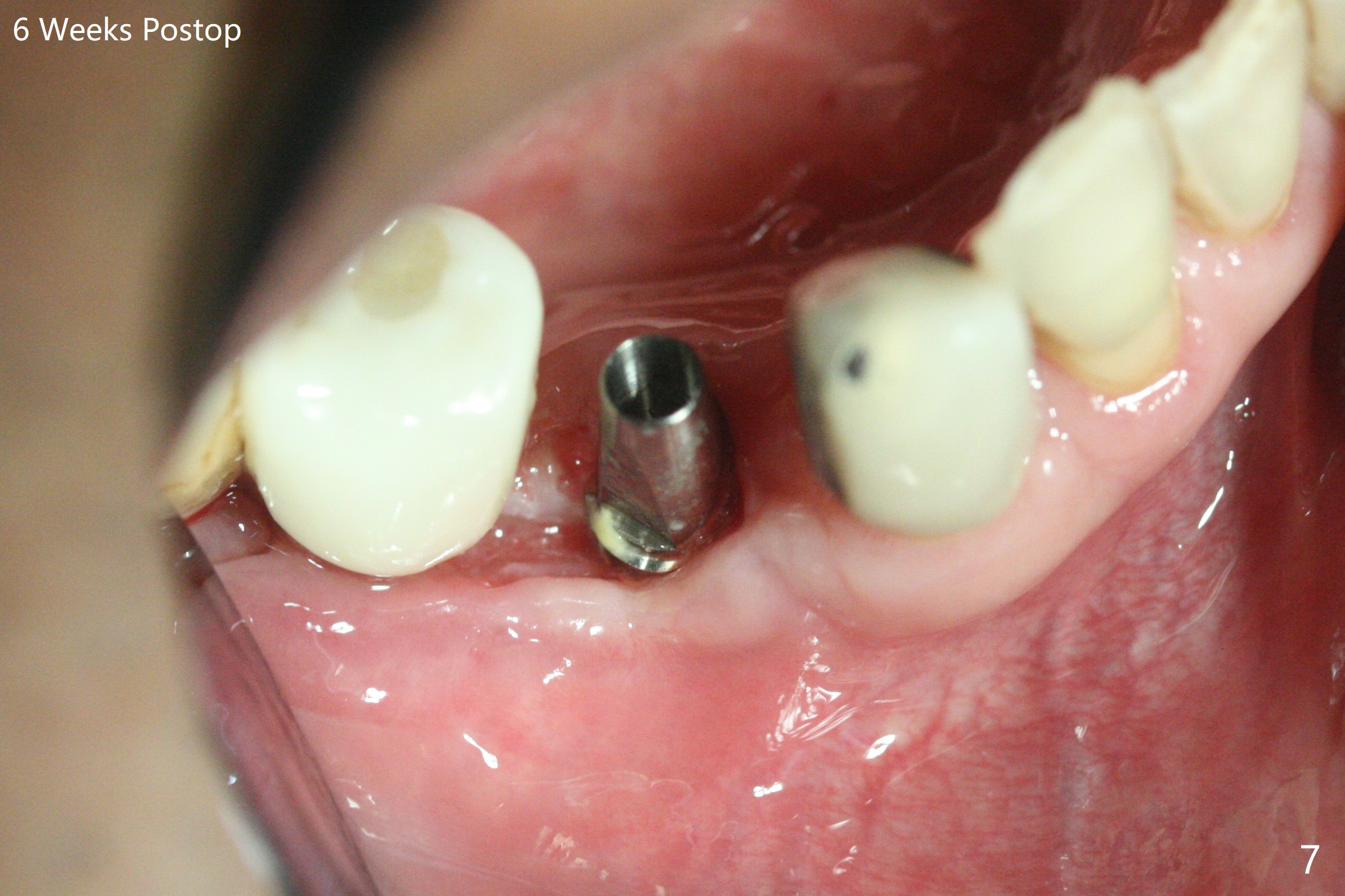 28牙位3.5x8.5毫米植体导板植入后,颊侧远中螺纹暴露,为了植骨,附近骨壁钻洞创造出血点以及放置基台(图一:5x7.5(3)毫米)。放置粘性骨粉后(图二:*),覆盖薄层PRF,后者可能很快吸收,为了防止骨粉暴露,放置不可吸收膜(图三:*),当中打洞,穿过基台固定,表面缝合。术后六周不可吸收膜部分暴露(图四)。图五,六显示在取出时膜当中固定用的洞,下面伤口愈合正常(图七)。