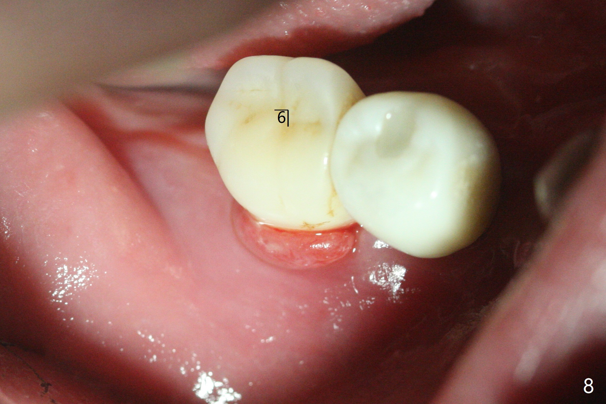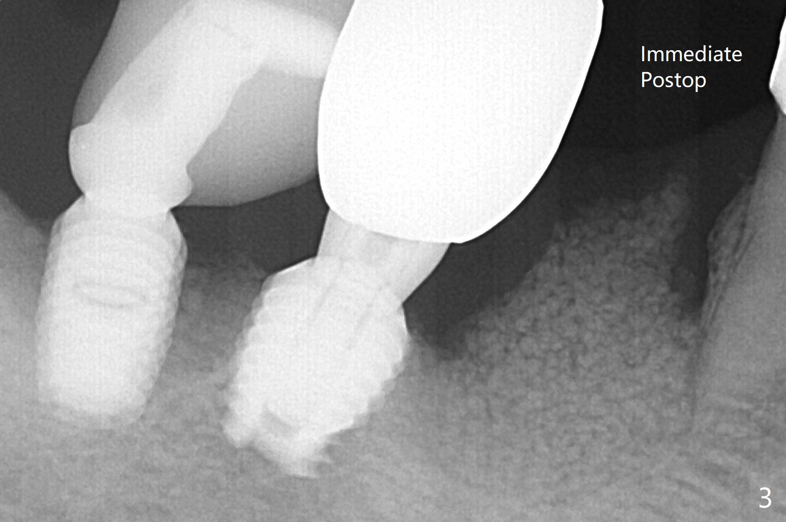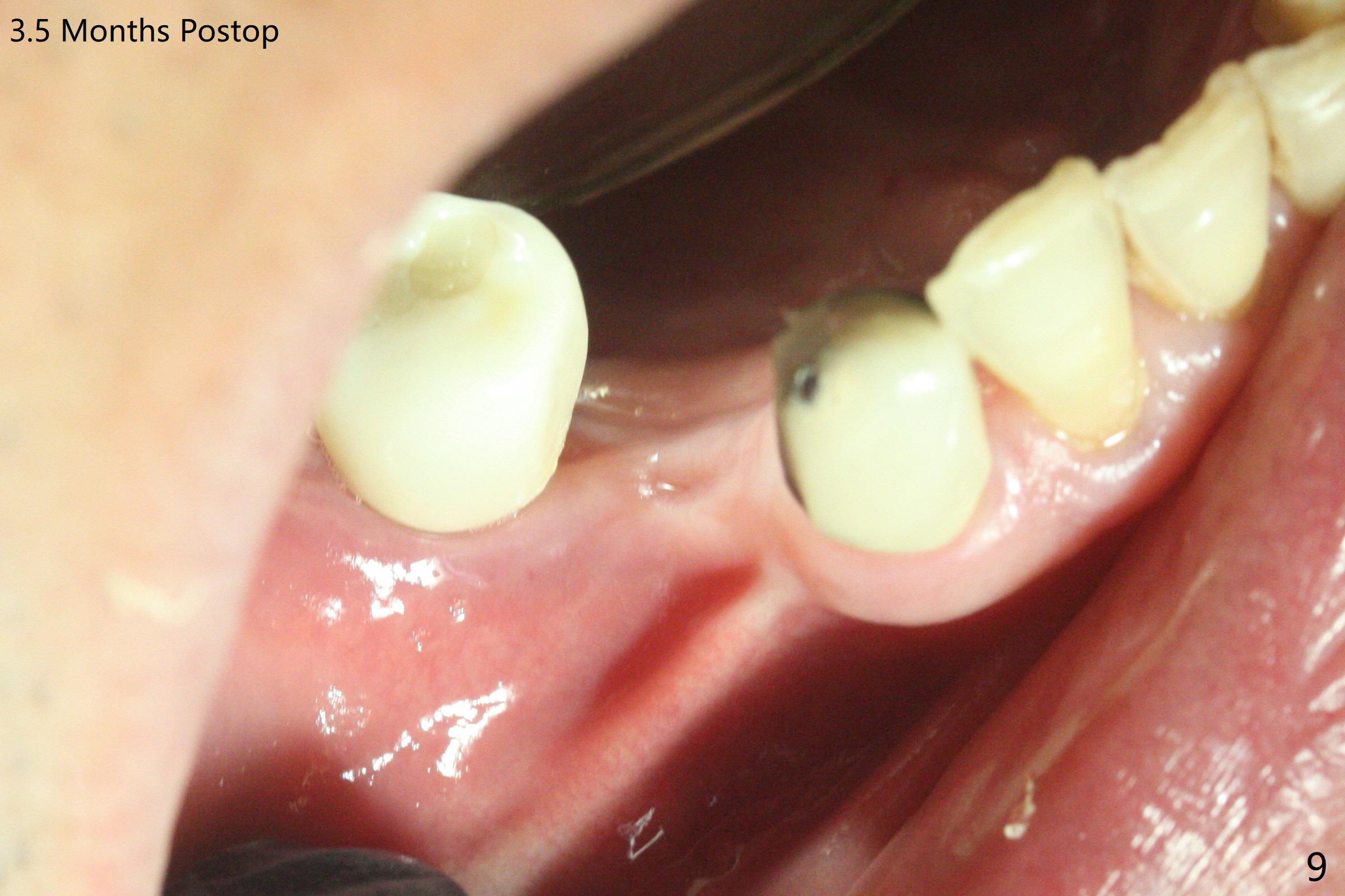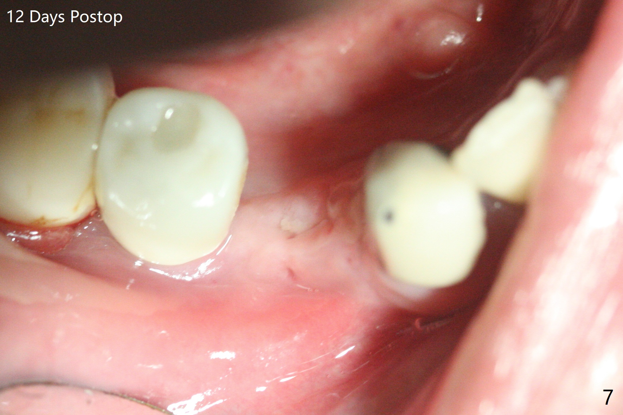 52岁男右下4植体脱落三天回到诊所(图一),植牙创尚未闭锁,顺着开口去除肉芽组织,冲洗,充填皮质骨骨粉(图二,三),颊侧骨板外形恢复(图四,五:*)。重新植入UF植体(5)颊侧还有薄颊侧骨板(图五:>),而6植体周围骨质吸收(图六),植骨好像有希望,植体还在牙槽骨范围,也有利于5植体生存。术后12天伤口愈合(图七)。尽管使用水枪,仍有6植体周围炎,需要治疗(图八)。由于右侧手术,病人不得不用左侧咀嚼,他认为左下4松动,无法挽救。术后3.5个月牙槽嵴和角化龈缩小(图九),需要切开使用导板。术后3.5个月骨粉高度明显下降(图十)。只能植入4x8.5毫米植体(图十一)。