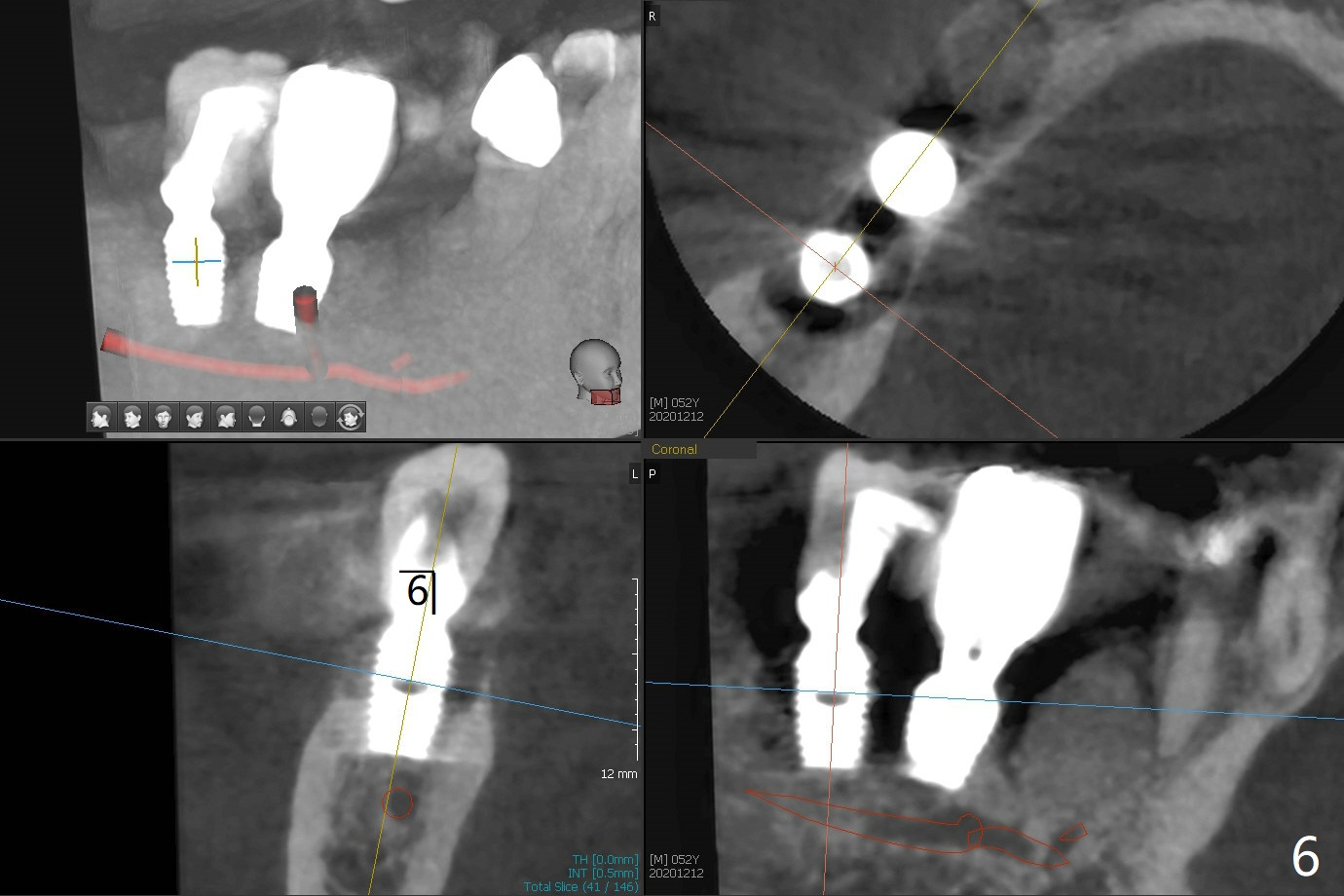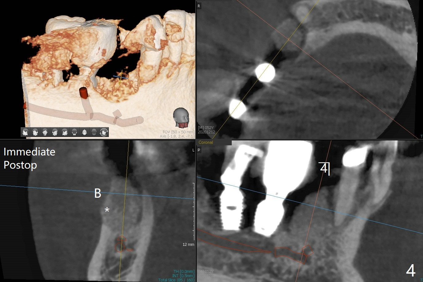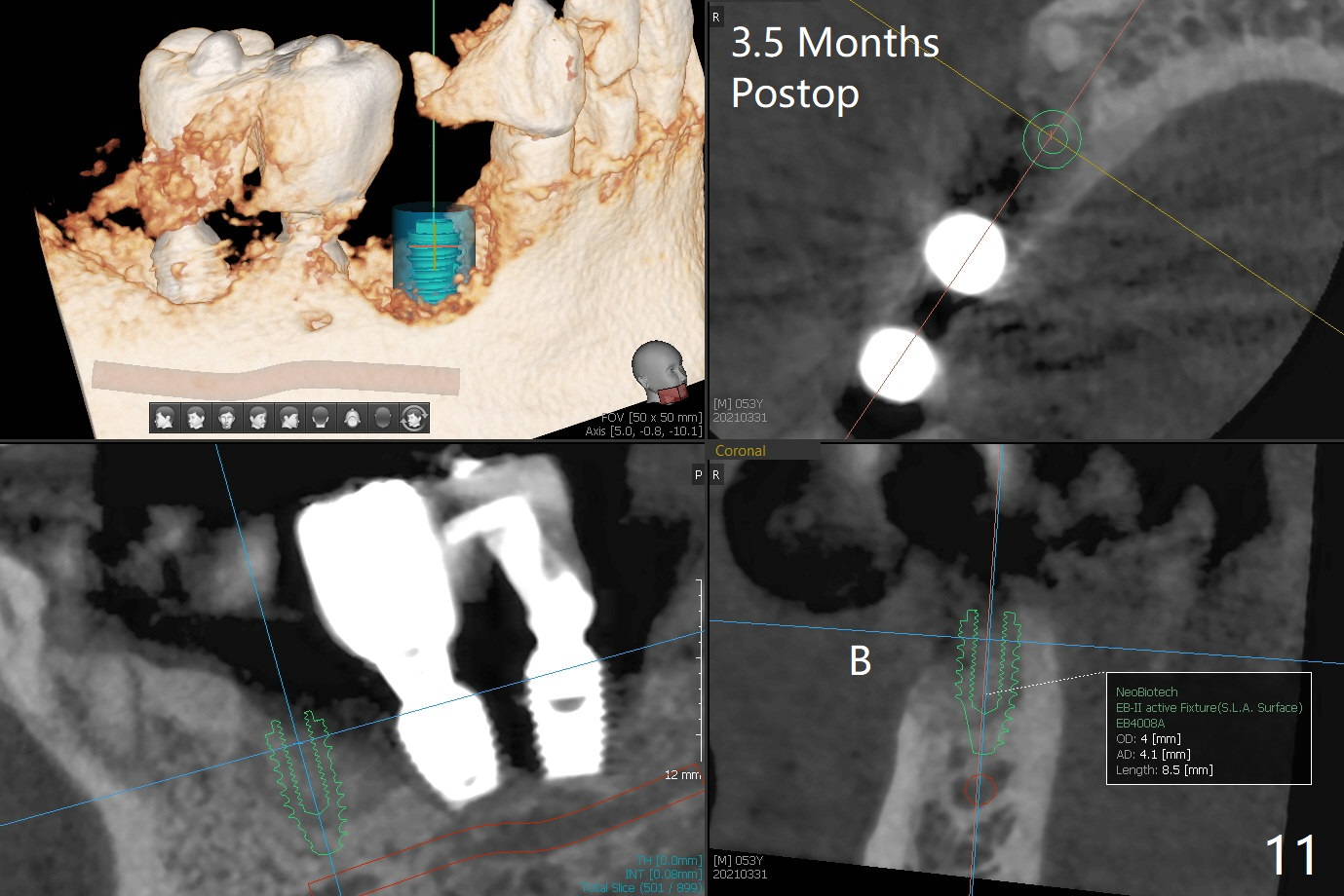 52岁男右下4植体脱落三天回到诊所(图一),植牙创尚未闭锁,顺着开口去除肉芽组织,冲洗,充填皮质骨骨粉(图二,三),颊侧骨板外形恢复(图四,五:*)。重新植入UF植体(5)颊侧还有薄颊侧骨板(图五:>),而6植体周围骨质吸收(图六),植骨好像有希望,植体还在牙槽骨范围,也有利于5植体生存。术后12天伤口愈合(图七)。尽管使用水枪,仍有6植体周围炎,需要治疗(图八)。由于右侧手术,病人不得不用左侧咀嚼,他认为左下4松动,无法挽救。术后3.5个月牙槽嵴和角化龈缩小(图九),需要切开使用导板。术后3.5个月骨粉高度明显下降(图十)。只能植入4x8.5毫米植体(图十一)。