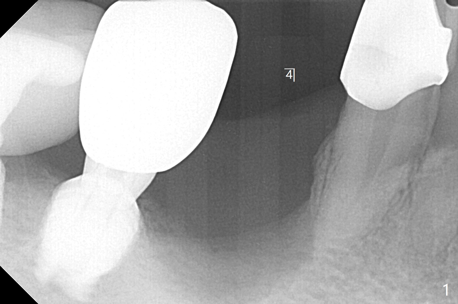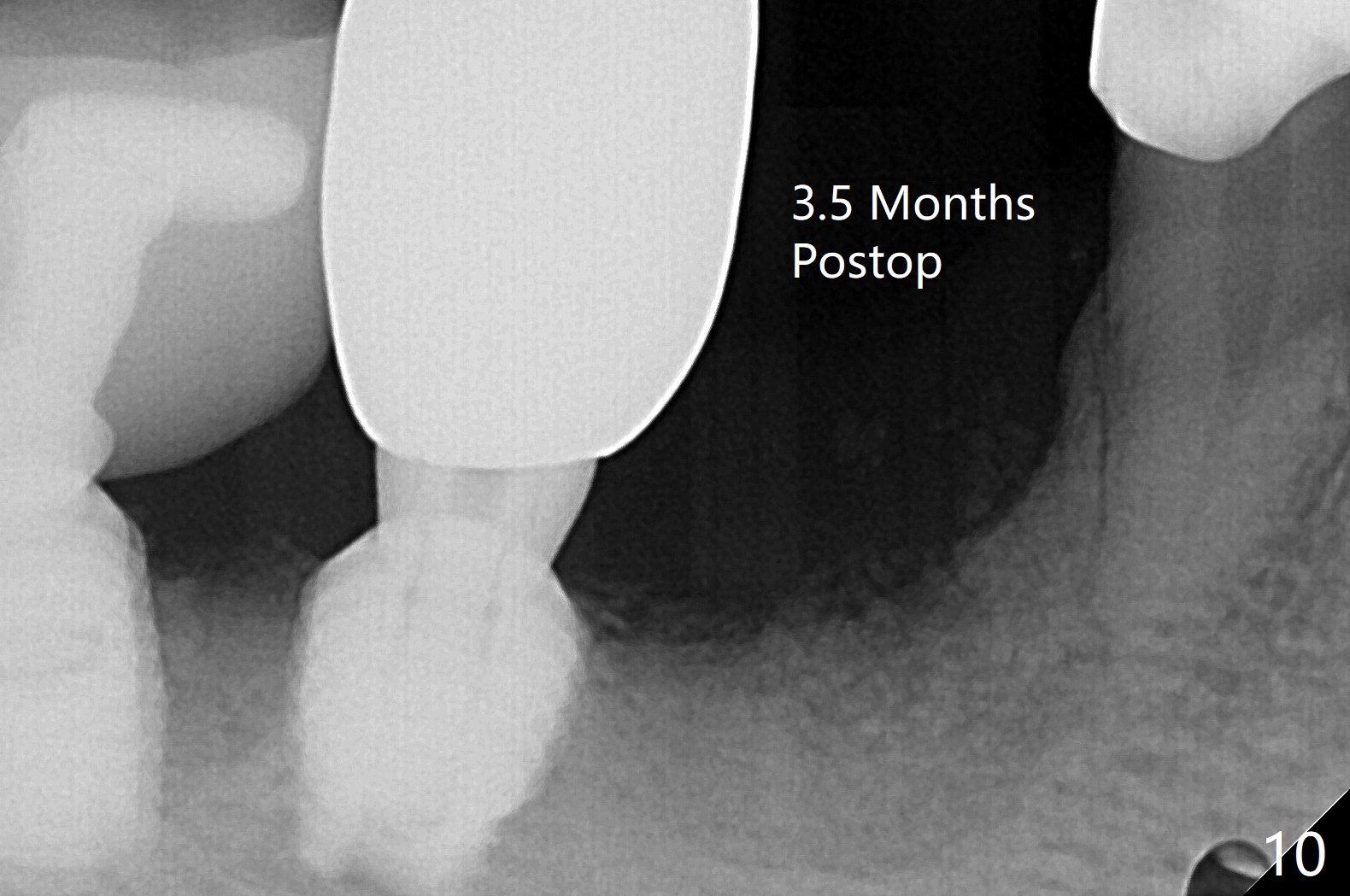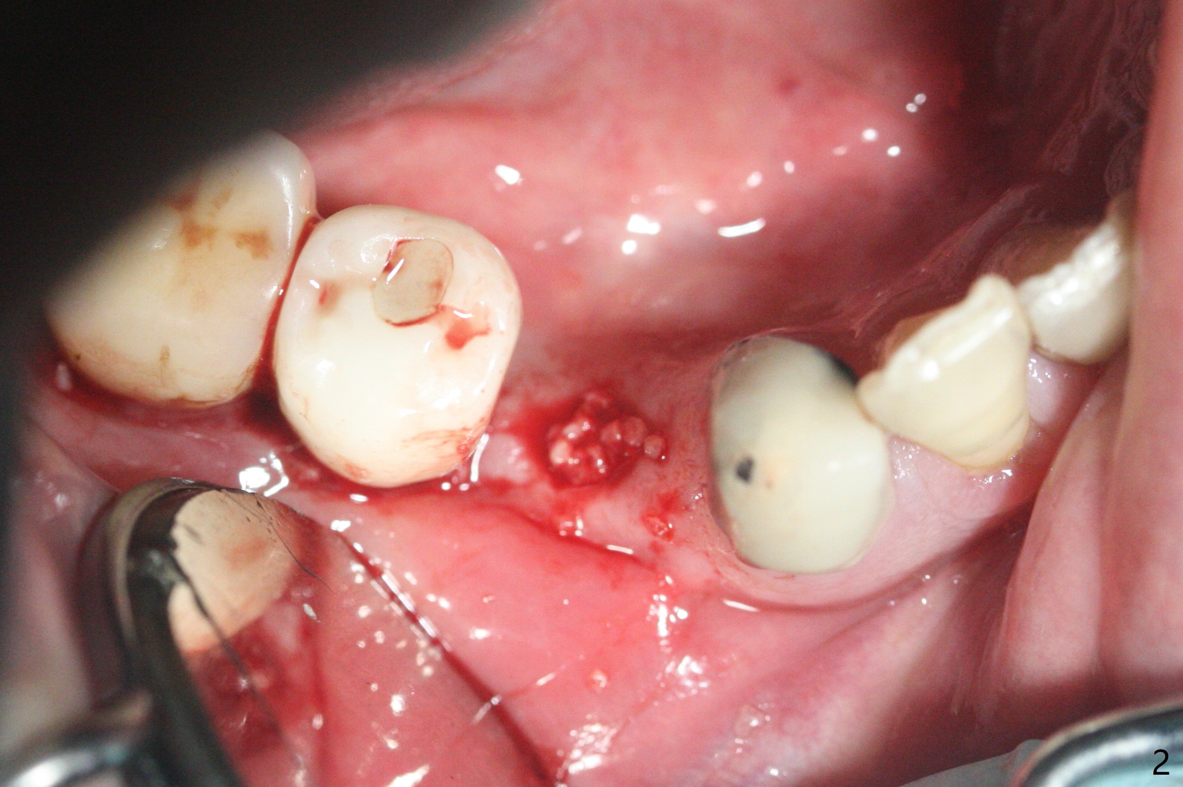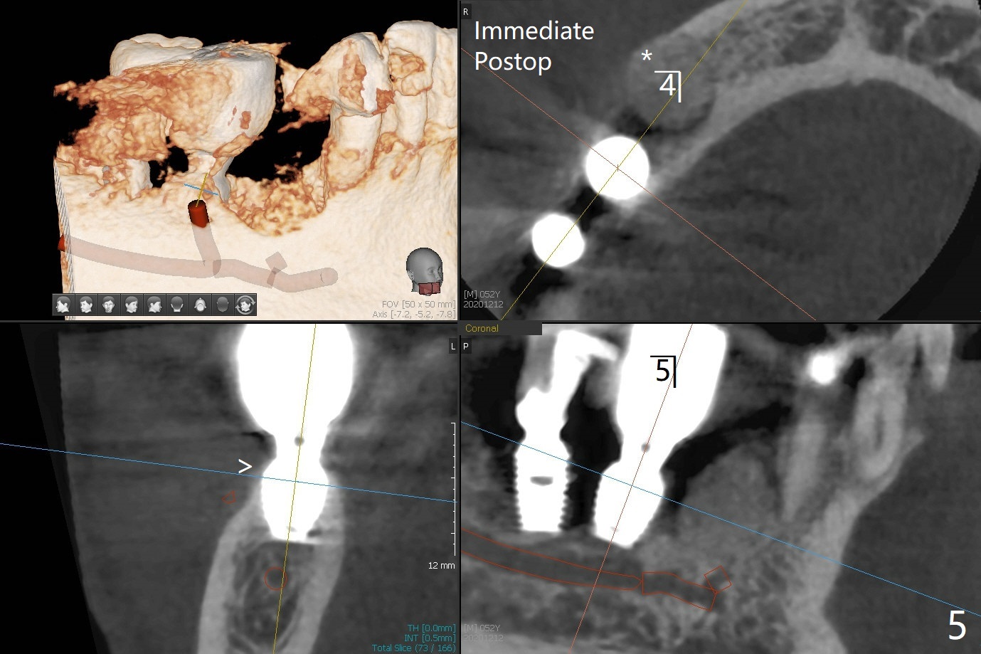 52岁男右下4植体脱落三天回到诊所(图一),植牙创尚未闭锁,顺着开口去除肉芽组织,冲洗,充填皮质骨骨粉(图二,三),颊侧骨板外形恢复(图四,五:*)。重新植入UF植体(5)颊侧还有薄颊侧骨板(图五:>),而6植体周围骨质吸收(图六),植骨好像有希望,植体还在牙槽骨范围,也有利于5植体生存。术后12天伤口愈合(图七)。尽管使用水枪,仍有6植体周围炎,需要治疗(图八)。由于右侧手术,病人不得不用左侧咀嚼,他认为左下4松动,无法挽救。术后3.5个月牙槽嵴和角化龈缩小(图九),需要切开使用导板。术后3.5个月骨粉高度明显下降(图十)。只能植入4x8.5毫米植体(图十一)。