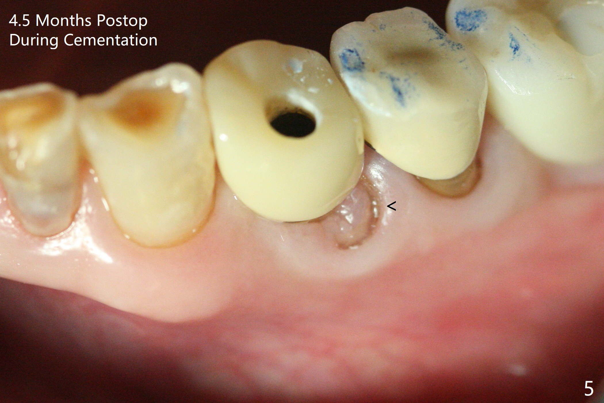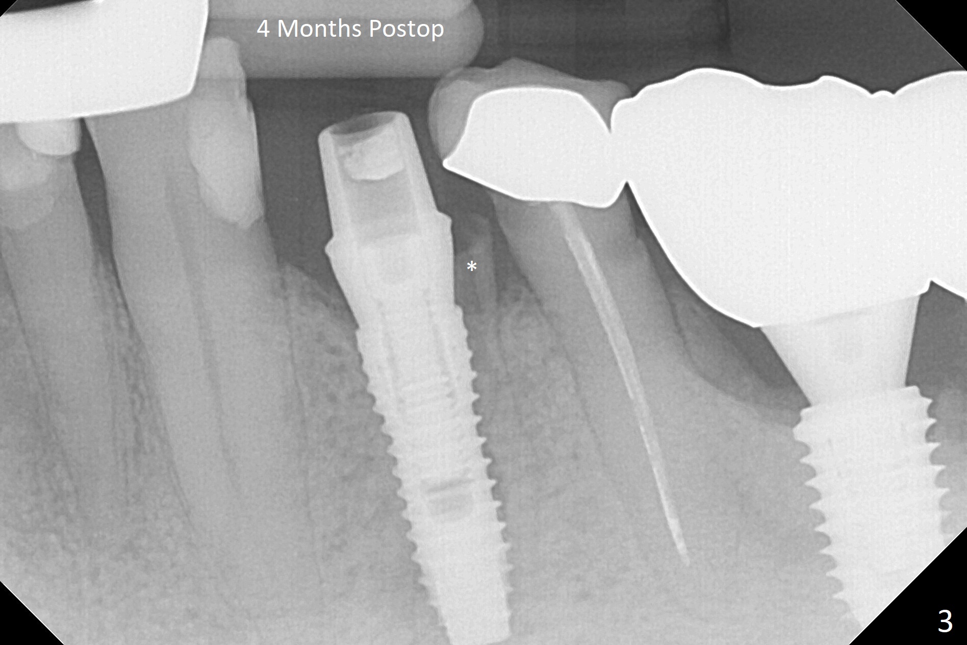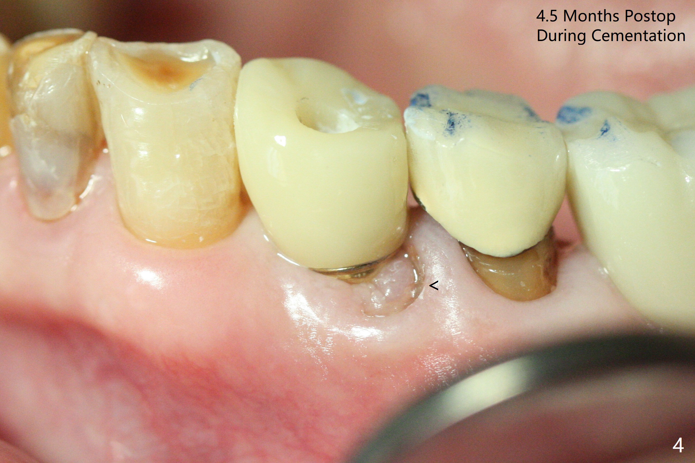 Extraction of the fractured tooth at #21 is as difficult as #19 (requiring incision). Because of the long root and hemorrhage, the apex of the tooth (Fig.1 black *) and a thin layer of the buccal shield (white *) remain when osteotomy is initiated. Due to hard bone, a 3.8x11.5 mm implant achieves insertion torque of ~35 Ncm (Fig.2); with placement of a 4.5x4(3) mm abutment, an immediate provisional is fabricated. There is limited remaining space for bone graft. The patient will return for final restoration 4 months postop; the buccal plate will be expected to have not collapsed! The implant seems to be osteointegrated, while the root piece (socket shield *) is exposed 4 months postop (Fig.3). The socket shield seems to be harmless, difficult to trim without local anesthesia and associated with no buccal plate concavity (Fig.4,5 <). With socket shield at #21, the crown looks normal, whereas the one at #19 without socket shield looks long, suggesting vertical bone loss early postop (before restoration, Fig.6).没有牙根处,角化龈少(图七,与术前(图八)对比)。