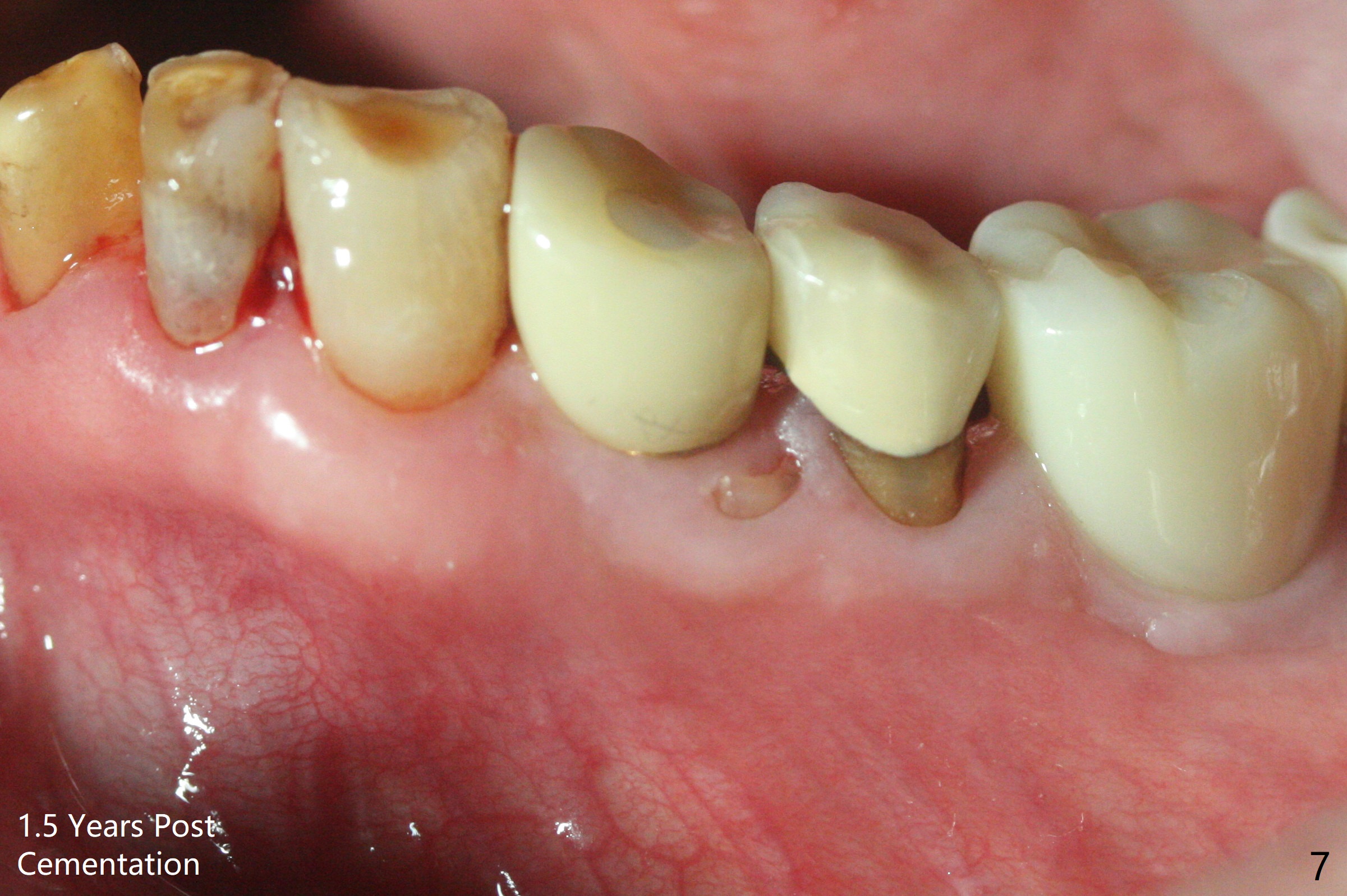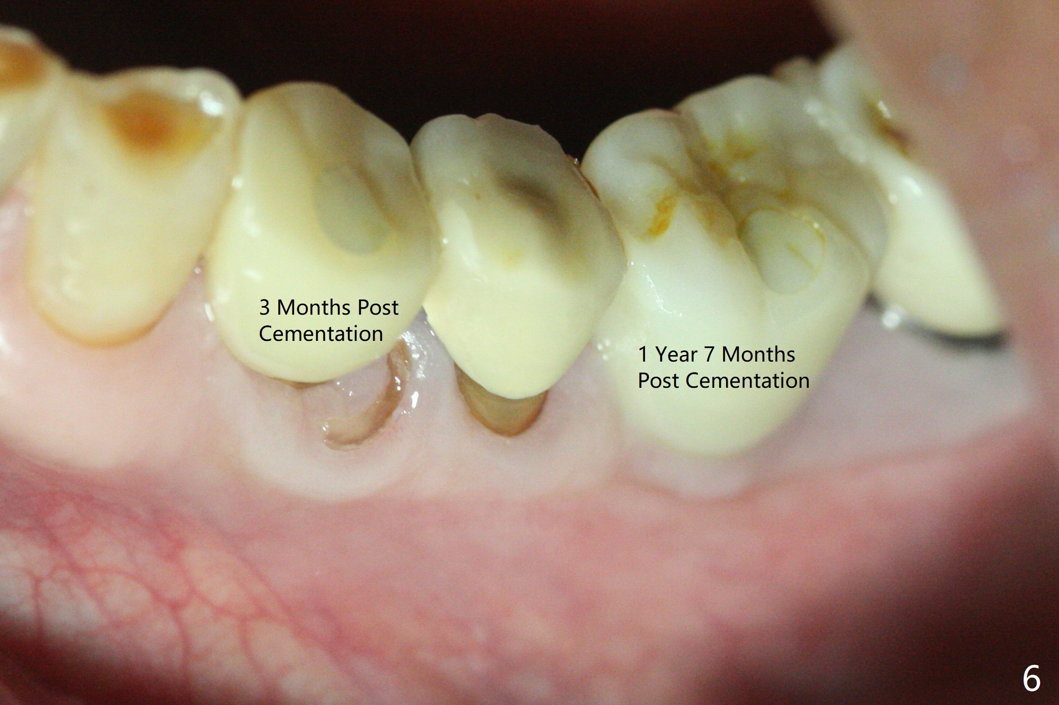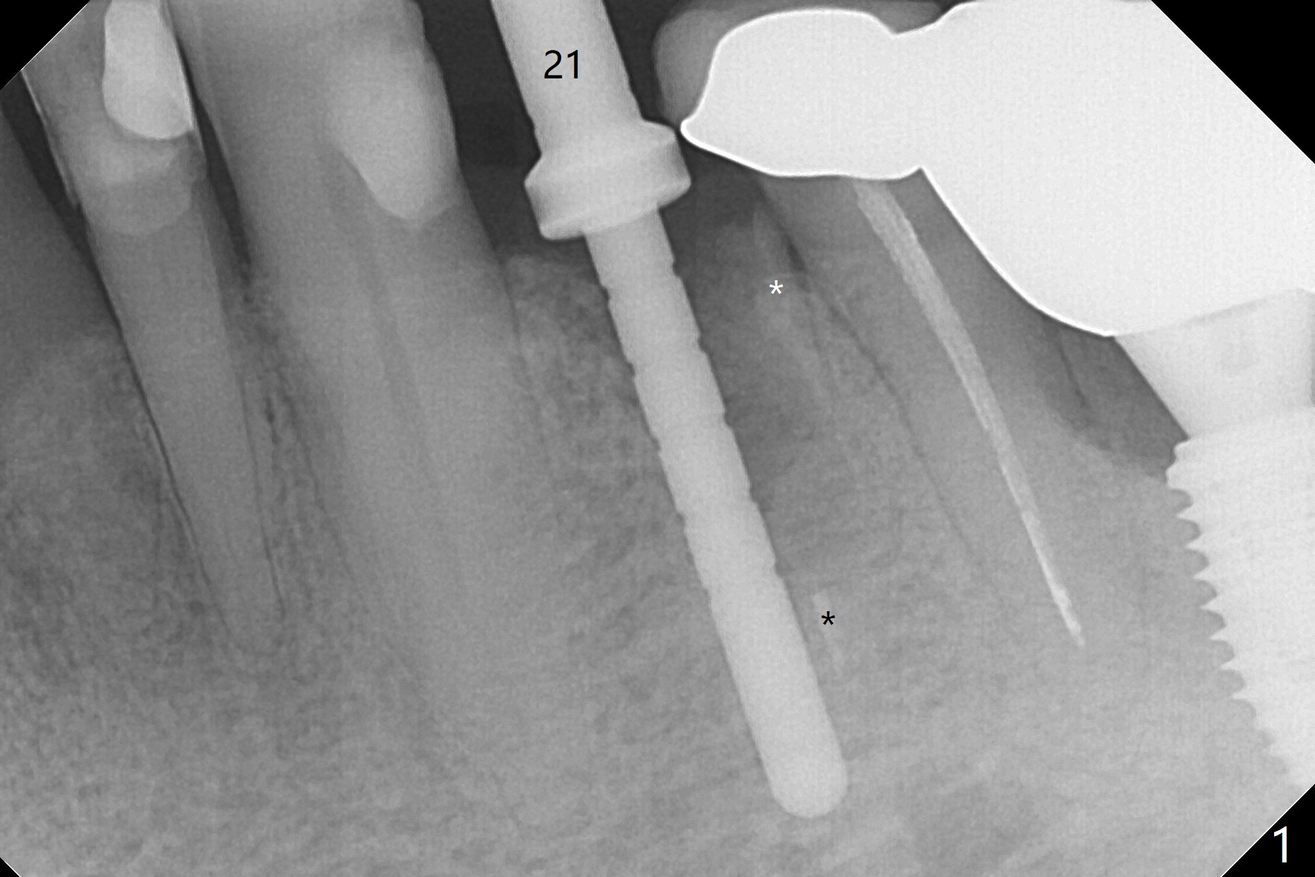 Extraction of the fractured tooth at #21 is as difficult as #19 (requiring incision). Because of the long root and hemorrhage, the apex of the tooth (Fig.1 black *) and a thin layer of the buccal shield (white *) remain when osteotomy is initiated. Due to hard bone, a 3.8x11.5 mm implant achieves insertion torque of ~35 Ncm (Fig.2); with placement of a 4.5x4(3) mm abutment, an immediate provisional is fabricated. There is limited remaining space for bone graft. The patient will return for final restoration 4 months postop; the buccal plate will be expected to have not collapsed! The implant seems to be osteointegrated, while the root piece (socket shield *) is exposed 4 months postop (Fig.3). The socket shield seems to be harmless, difficult to trim without local anesthesia and associated with no buccal plate concavity (Fig.4,5 <). With socket shield at #21, the crown looks normal, whereas the one at #19 without socket shield looks long, suggesting vertical bone loss early postop (before restoration, Fig.6).没有牙根处,角化龈少(图七,与术前(图八)对比)。