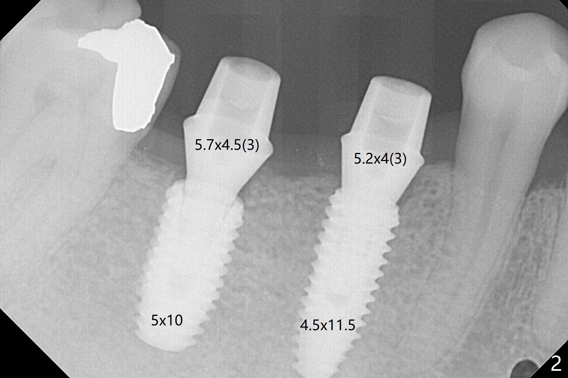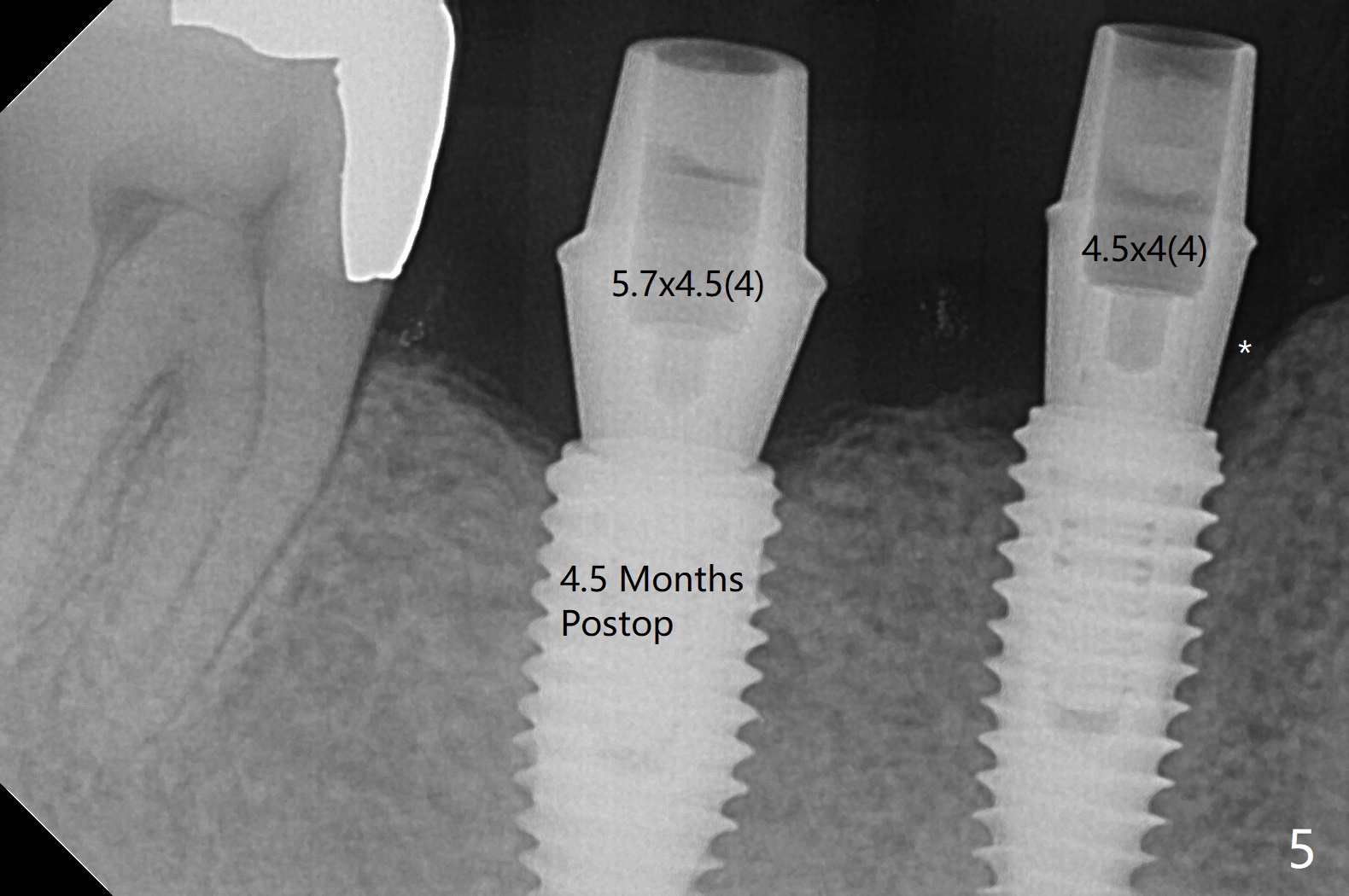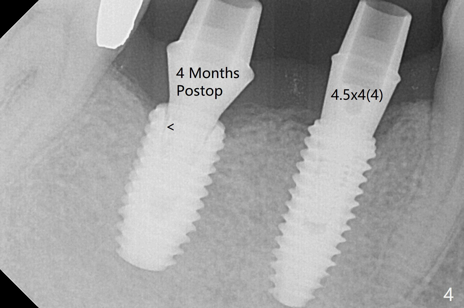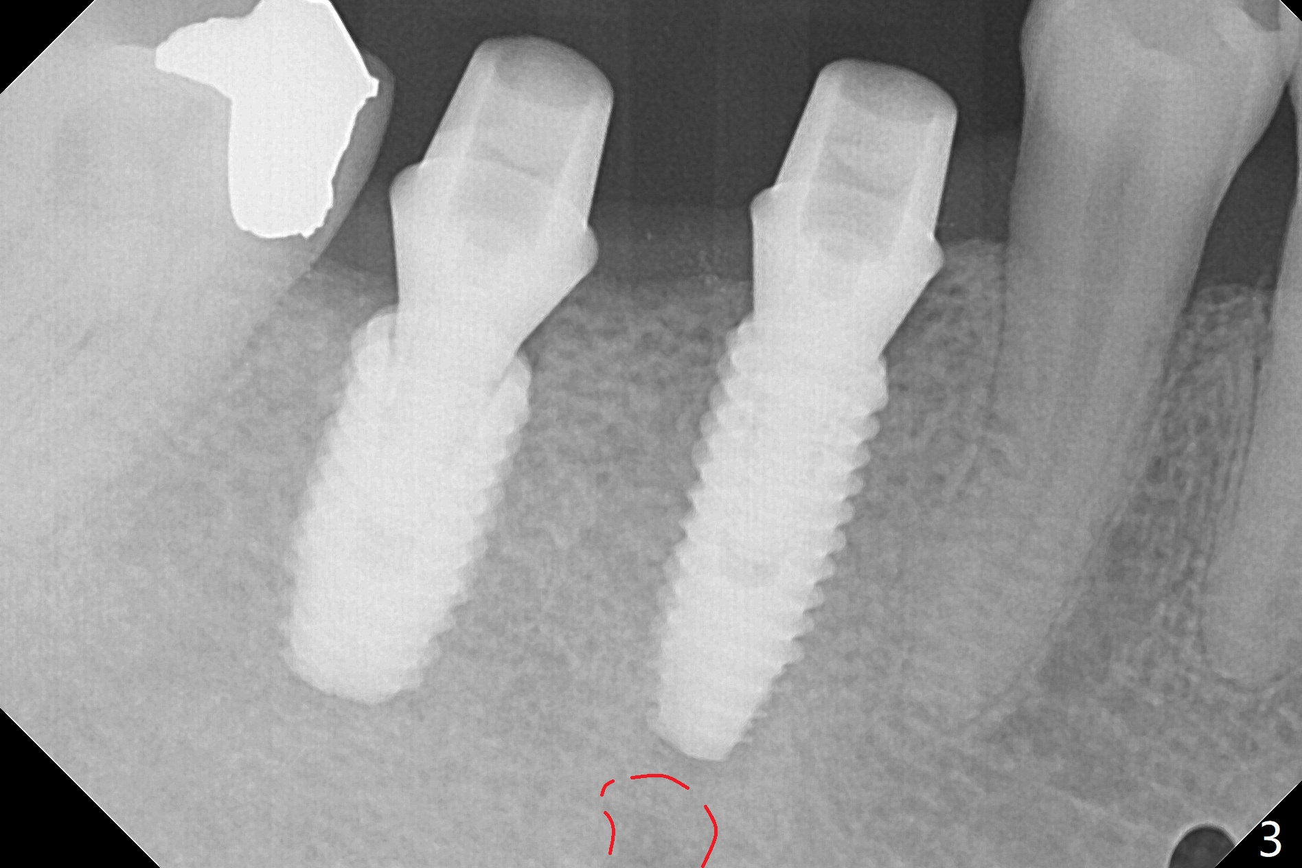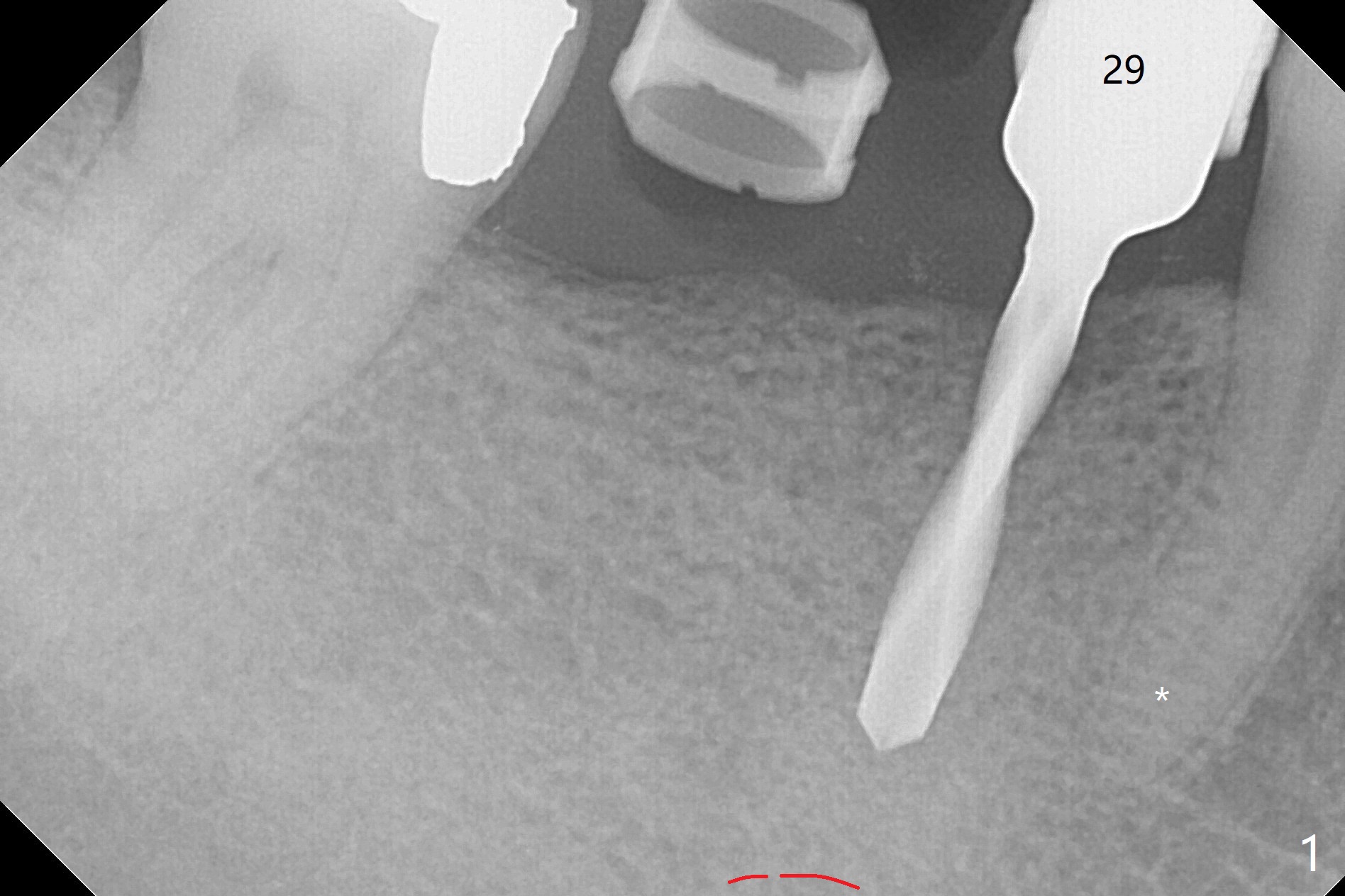PA is taken after a 2.2 mm drill reaches depth of 11.5 mm with 10.5 mm offset at #29 to confirm that the curved apex of the neighboring tooth is not violated (Fig1 * (red line: Mental Loop)). The rest of the procedure is smooth except that the abutment at #29 is later changed to 4.5x4(4) mm (Fig.2,3 (red dashed line: Mental Loop)). The latter is easier for immediate splinted provisional and also has clearance from the crestal bone (Fig.5 *). Bone resorption seems to be minimal 4 months postop (Fig.4). The change in the abutment in cuff length (from 5.7x4.5(3) to (4) mm) at #30 eliminates the gag between the implant and abutment (Fig.4 <, as compared to Fig.5) before impression.