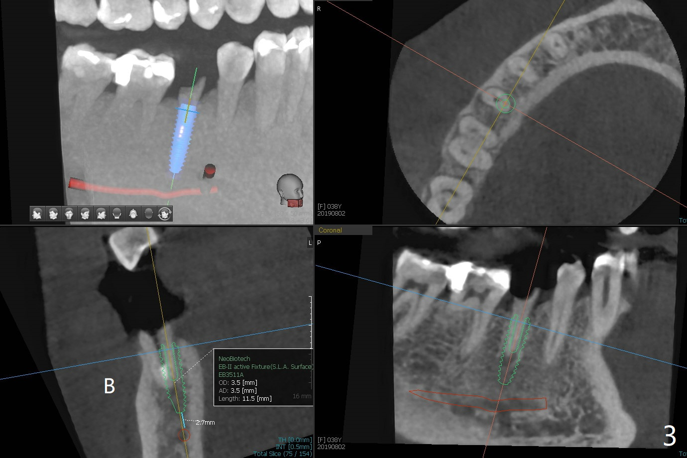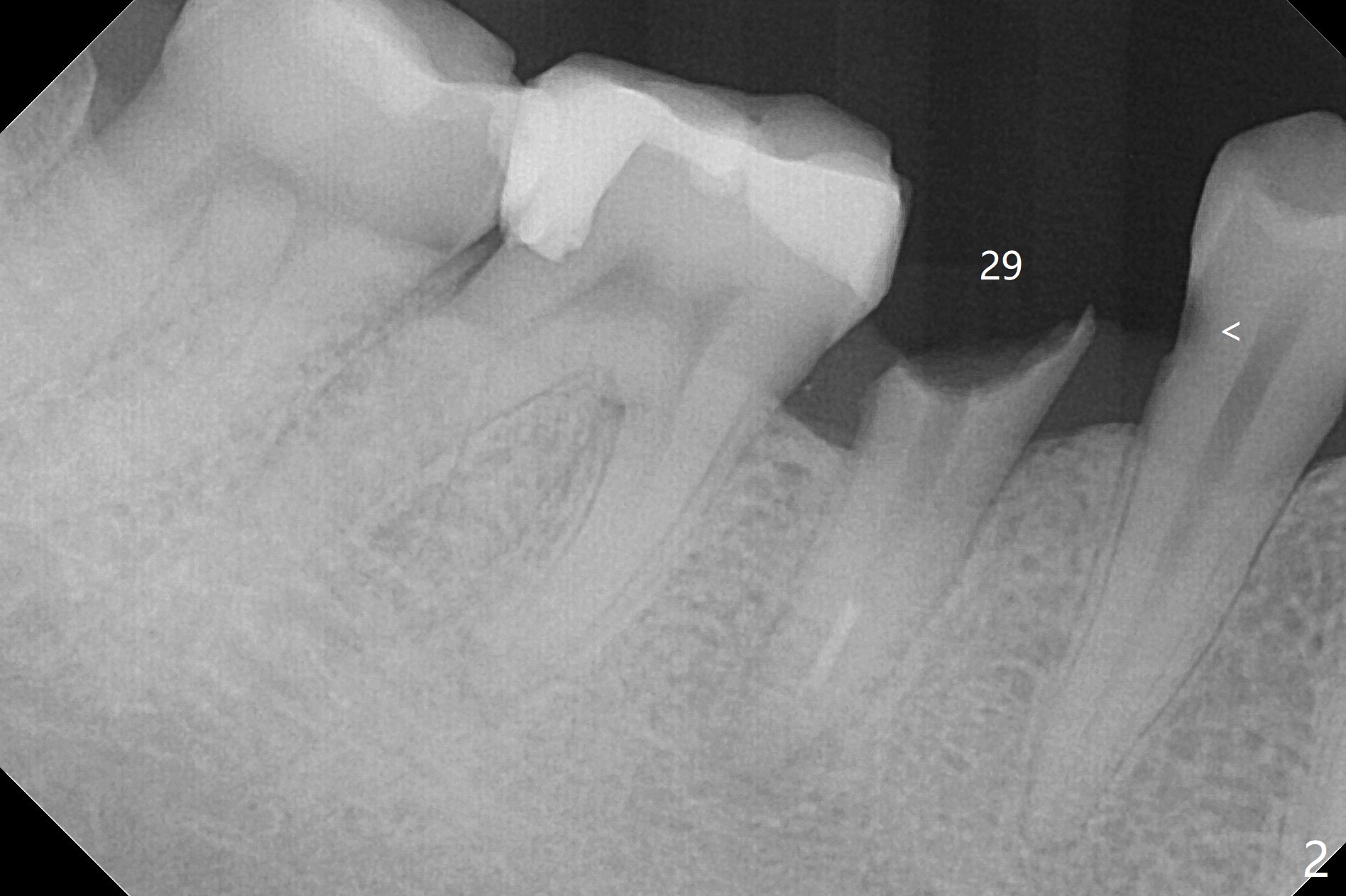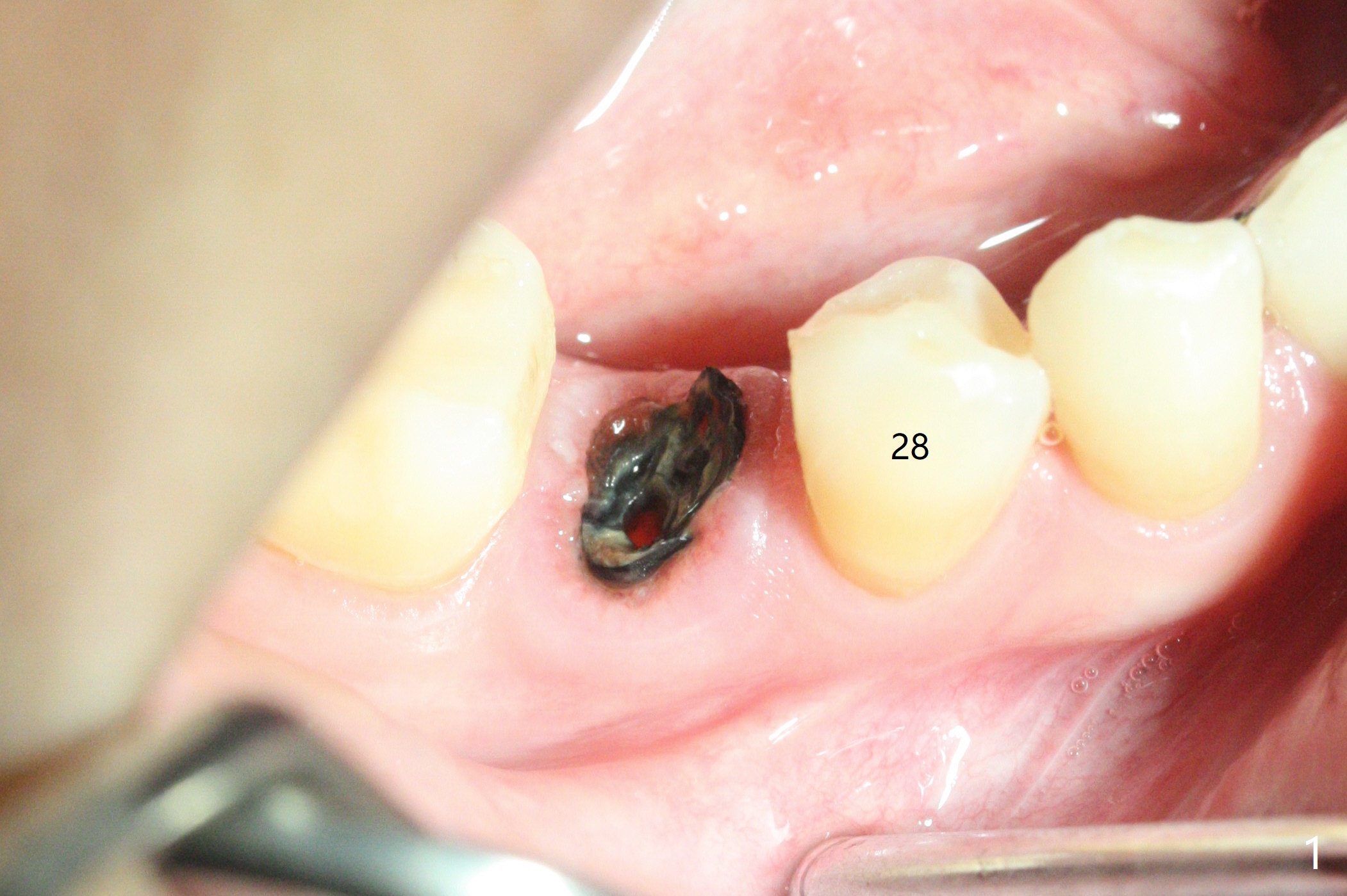 A 38-year-old woman dislodged the crown and post of #29 with equigingival root (Fig.1) and incomplete RCT probably related to the curved and obliterated root tip (Fig.2). For restoration, it is the best to initiate osteotomy in the lingual slope of the socket (Fig.3). A 4 mm implant may be more appropriate than 3.5 mm one. Are we ready for free hand placement? Prepare gingival retraction cord for #28 distal cervical caries before surgery (Fig.2 <).