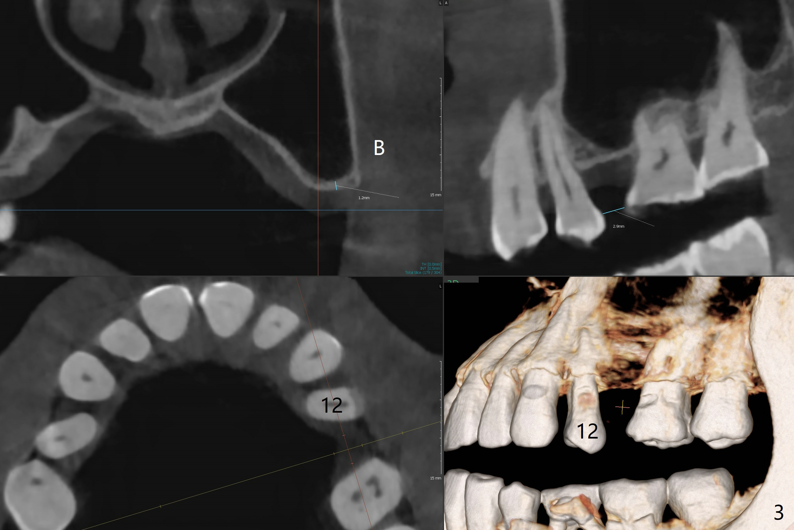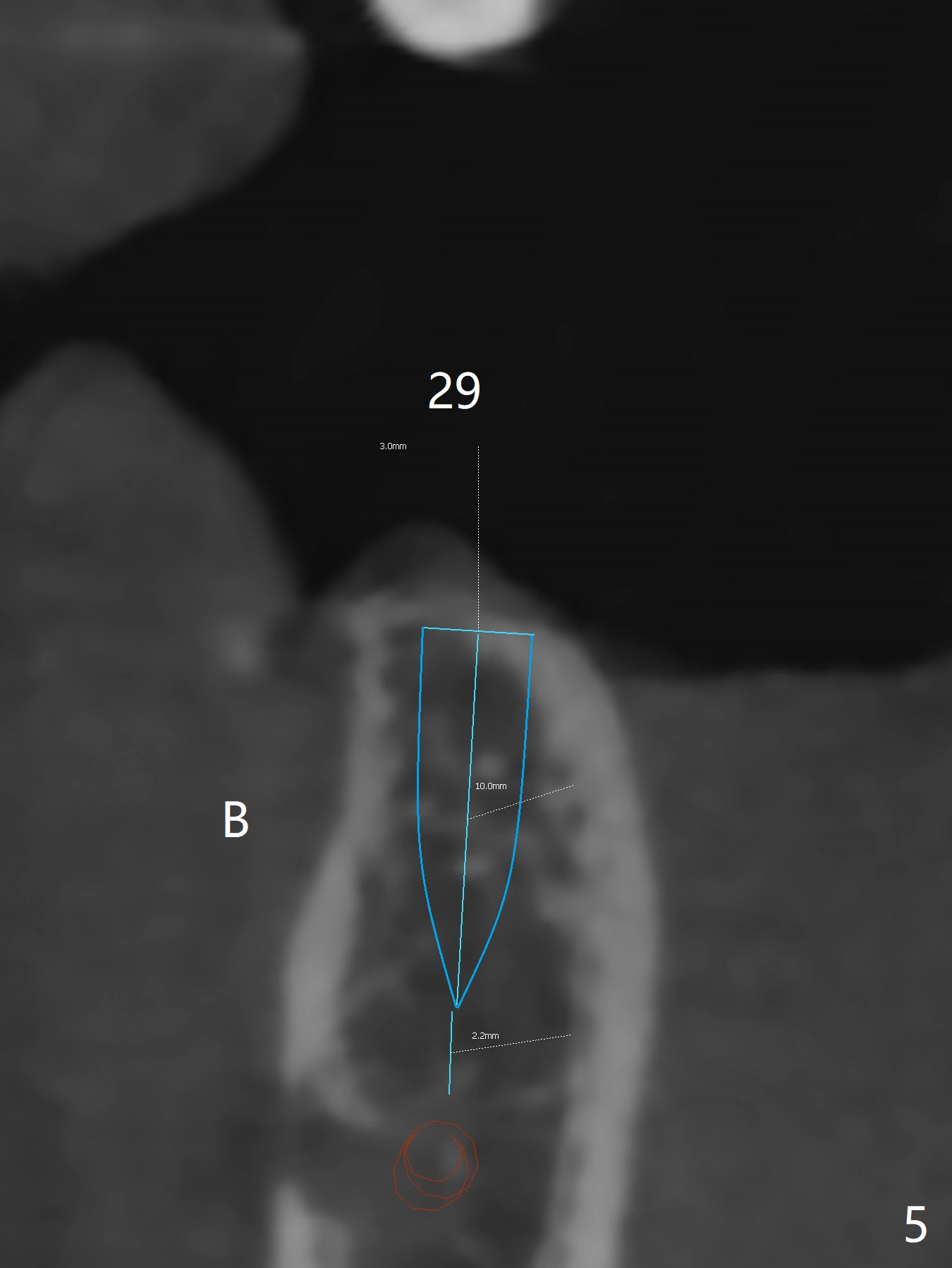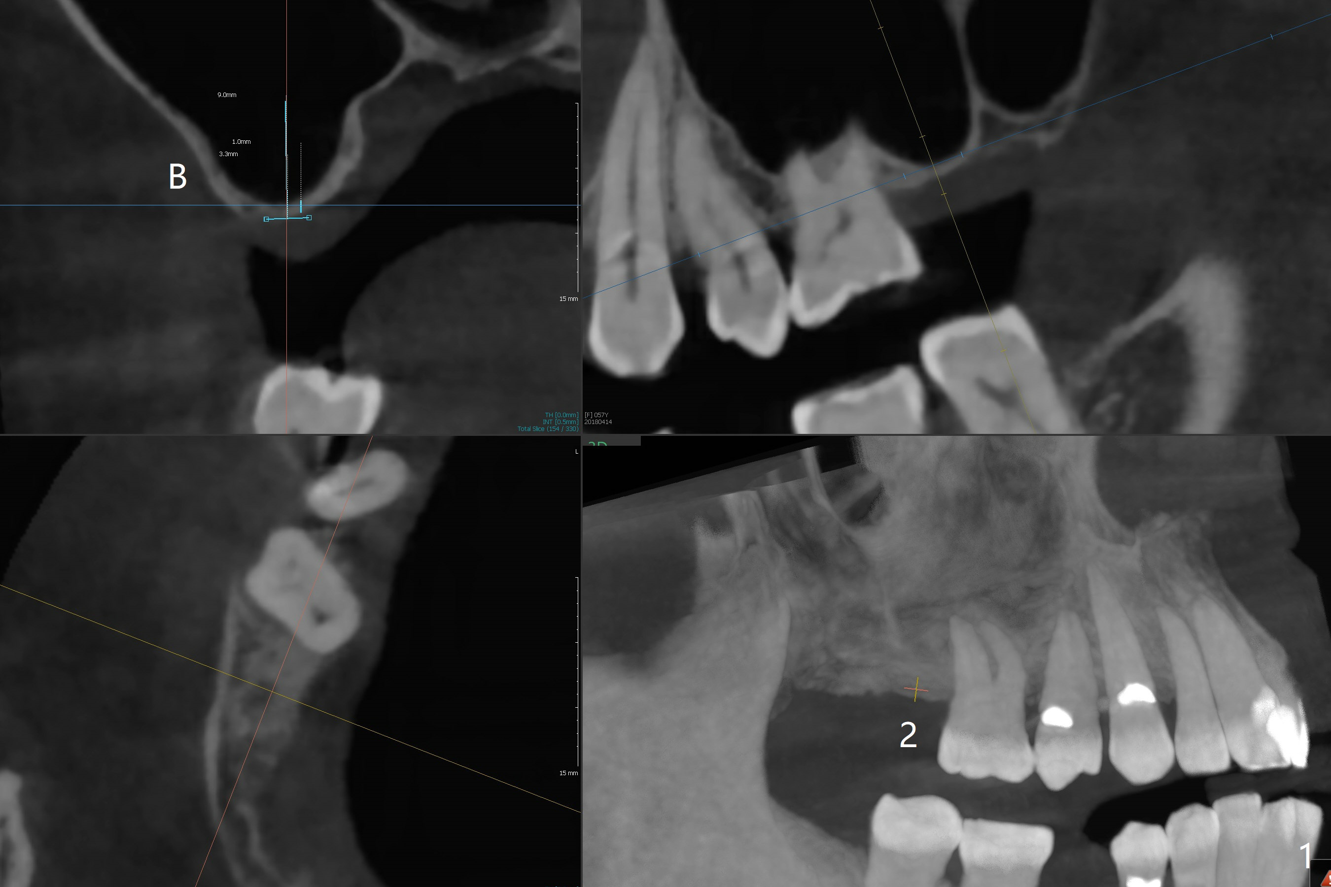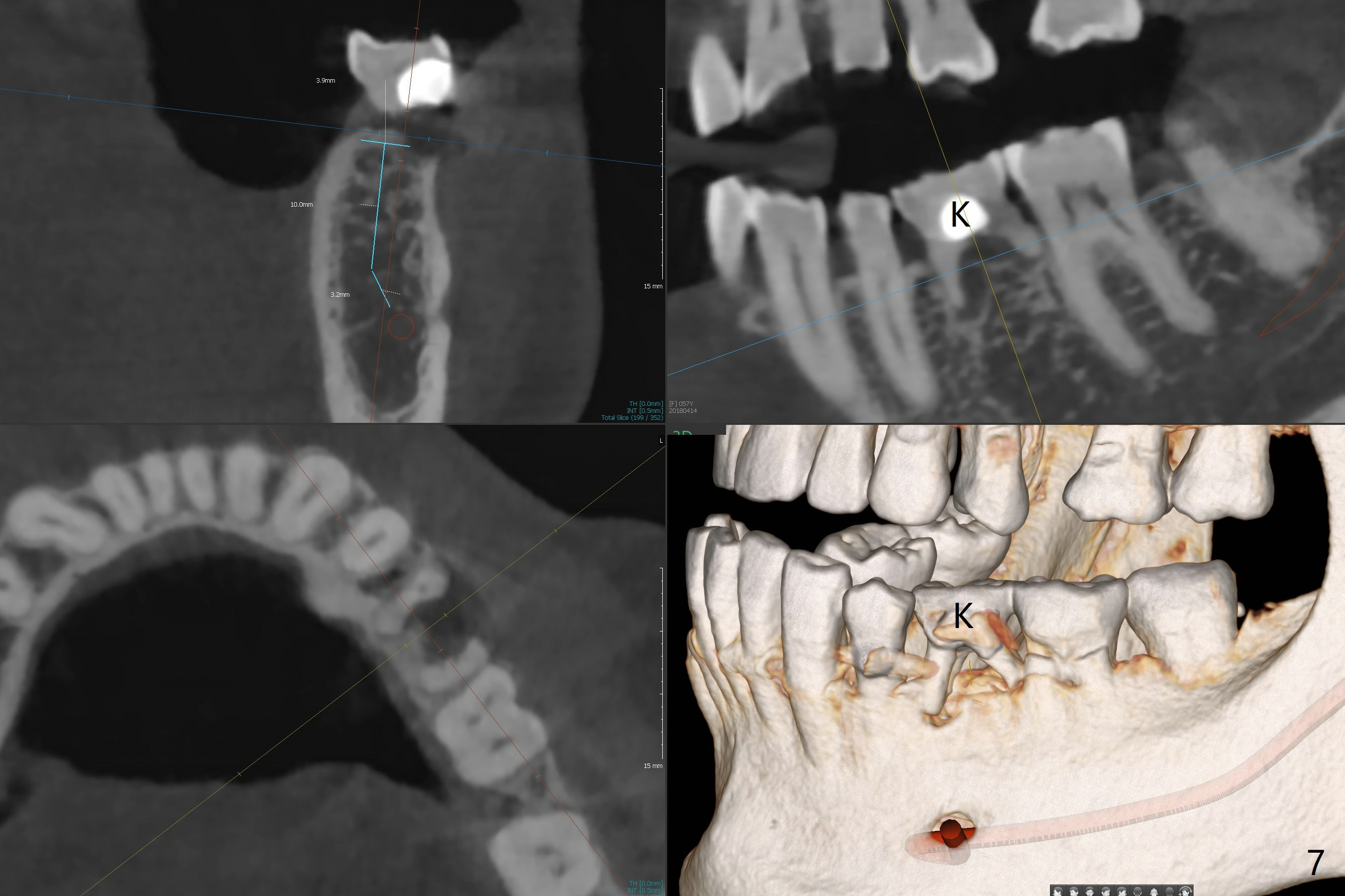 A 57-year-old woman has 3 missing teeth (#2 (Fig.1,2), 13 (Fig.3) and 29 (or T, Fig.4,5)) and a retained primary molar (K, Fig.6,7). Four implants are expected. The patient requests one at #29 first. The ridge top seems to be soft from 3-D image at Fig.4. As compared to K (Fig.6), the bone density at #29 is low (Fig.5). After incision, DIO bone expanders will be used for a 3.5 or 4.0 mm IS implant. Also prepare 1-piece one.