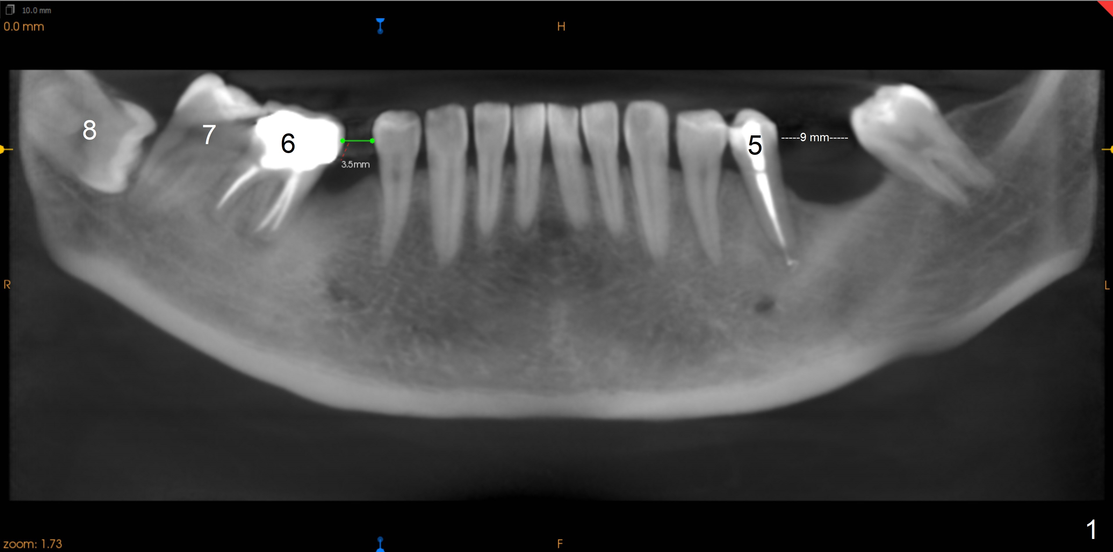 This panoramic X-ray is reconstructed from 3 D image (taken on 04/04/2018, Fig.1). Uprighting LR6,7 involves extraction of LR8. LL5 periapical lesion has been treated. LL7 will be distalized 1-2 mm.