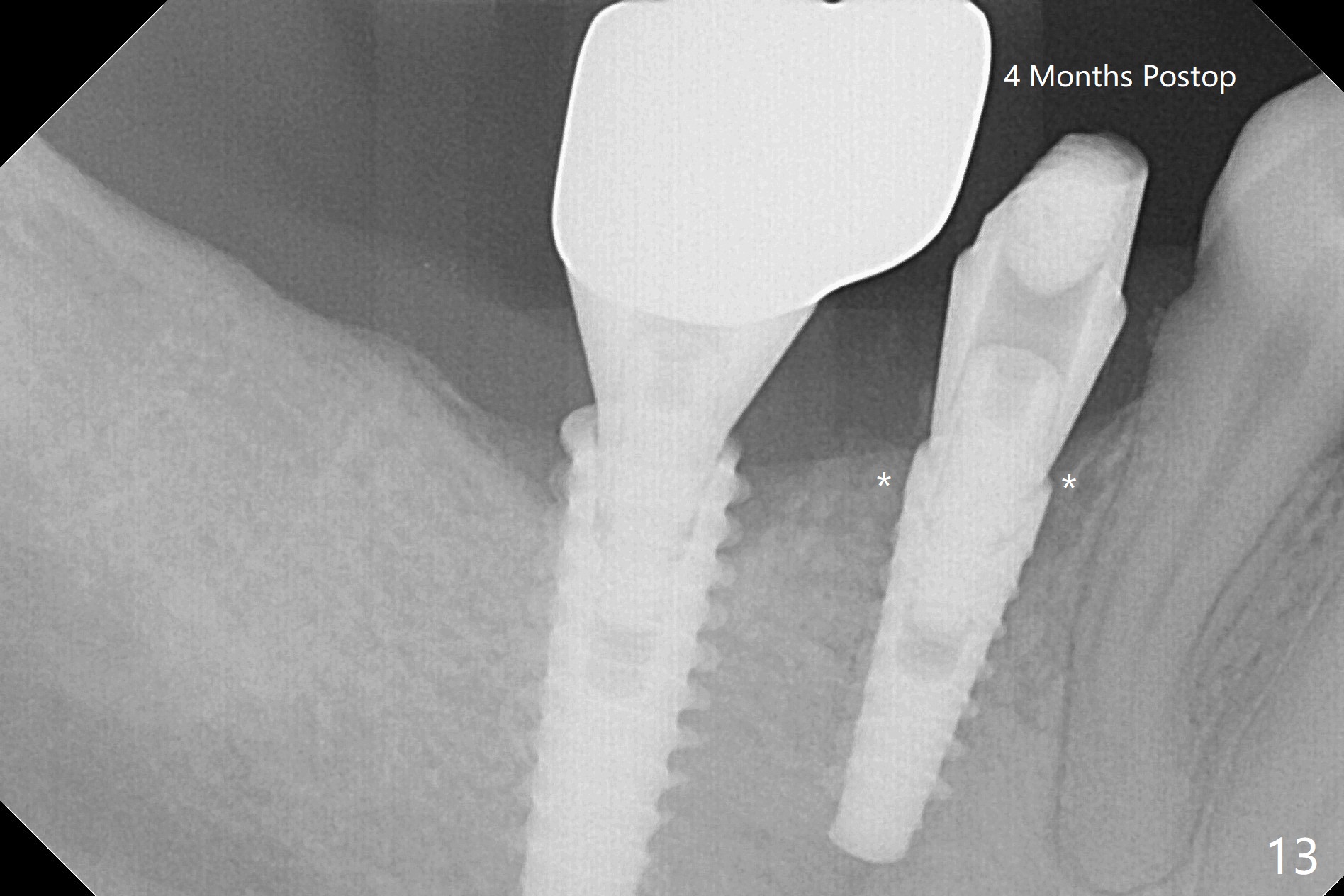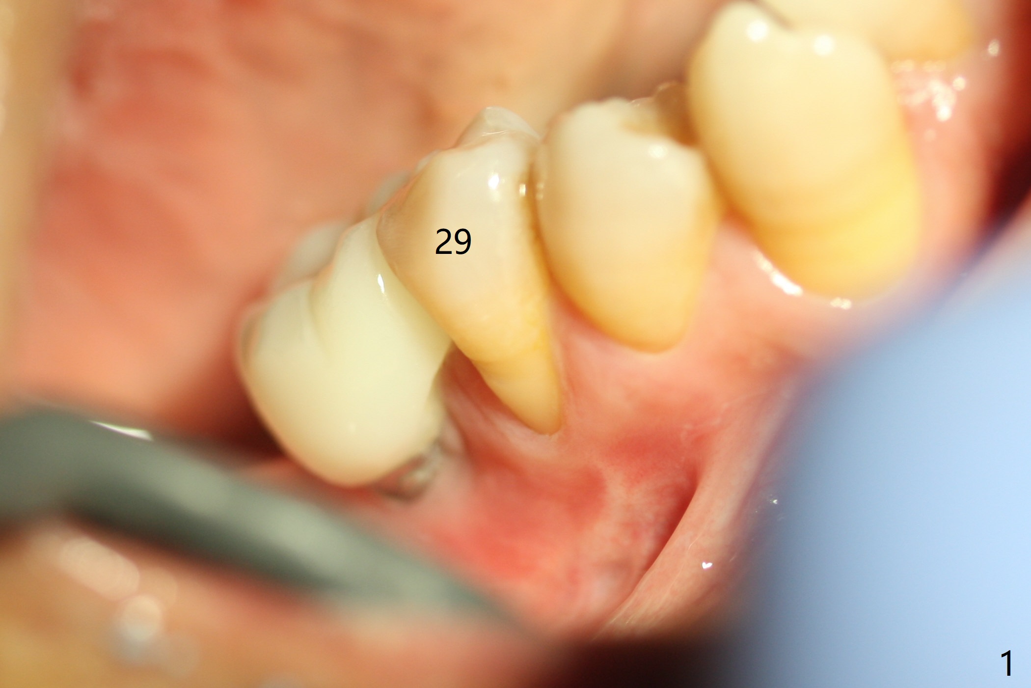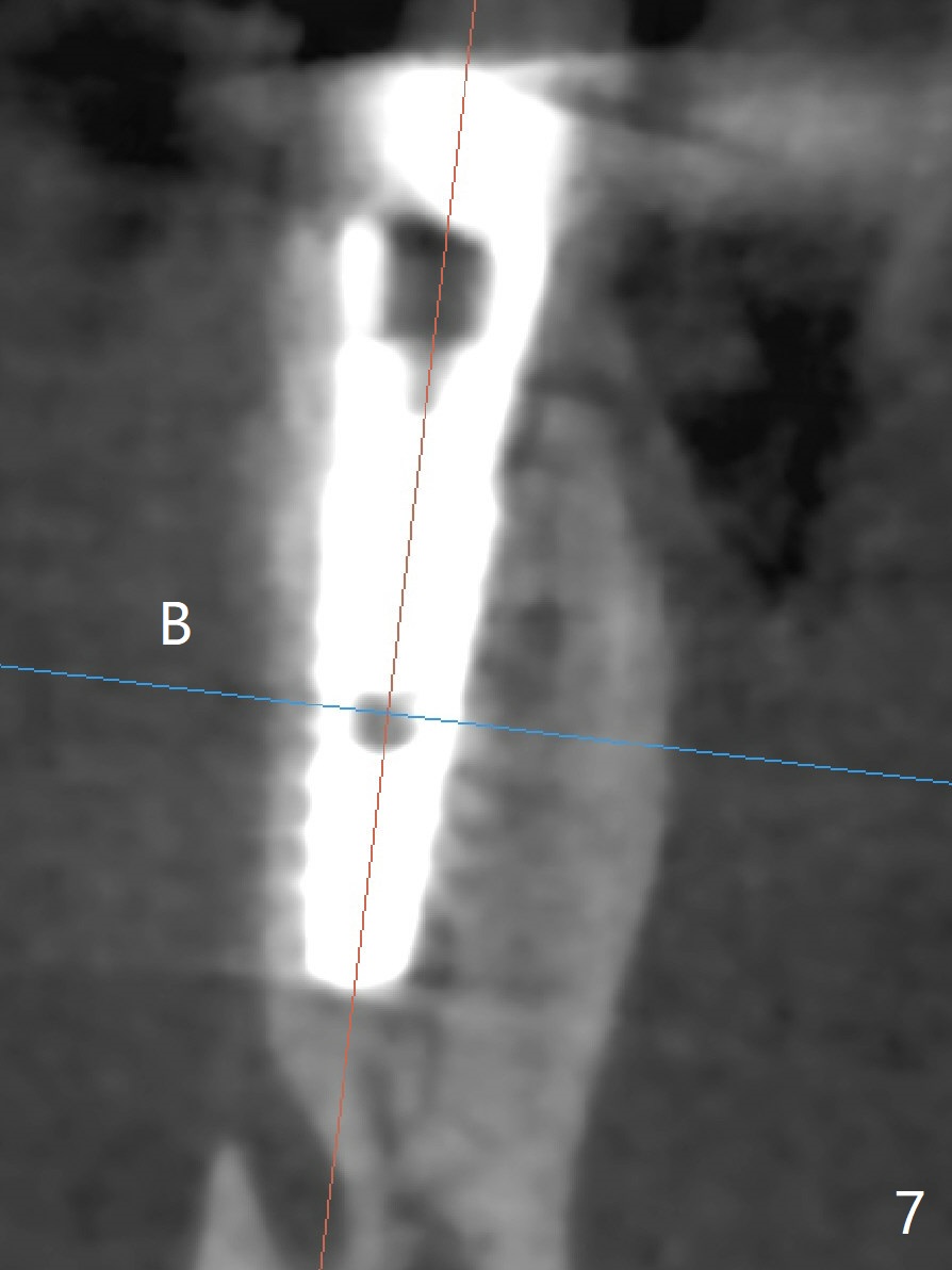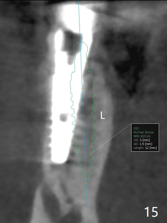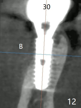 The tooth #29 has mild persistent pain radiating to the temple with mild percussion and mobility I 4.5 months post apicoectomy; the buccal recession is noticeable (Fig.1). Granulation tissue and bone graft are attached to the resected apex of the extracted tooth (Fig.2 <). The initial osteotomy with 1.5 mm drill is distal (Fig.3). After position adjustment with difficulty because of hard bone, osteotomy is finished with 2.8 and 3.2 mm Magic Drills (Fig.4). Following final drill, a 3.5x11 mm IBS implant is placed with insertion torque of 45 Ncm. With placement of a 4.5x4(4) mm abutment, Vanilla graft is placed in the buccal gap (Fig.5). Immediately postop CT shows that the implant is buccally placed (Fig.6,7 B). In fact after extraction (Fig.8), the initial osteotomy should start obliquely and as coronal and lingual as possible (Fig.9 red line). Following the initial penetration, the osteotomy should be straightened (Fig.10) so that the implant could be placed lingually (Fig11 green) to reduce buccal thread exposure. In fact there is also buccal thread exposure at #30 (Fig.12). The bone loss at #29 and 30 is minimal 4 months postop (#29, Fig.13 *)) and severe with periimplantitis at #29 one year post cementation (Fig.14). Incision will be made to exposure buccal threads of #29 and 30. If threads are within bone boundary, bone graft will be done with sticky bone after Titanium brush. If not, remove implant threads and bone graft. The worst scenario will be handled with implant removal (trephine bur 4/5 mm), either with bone graft or implant being placed lingually (IBS 3x11 mm 2-piece, to be buried, if needed (Fig.15)). Take preop photos to show #29 and 30 buccal recession and gingival erythema.