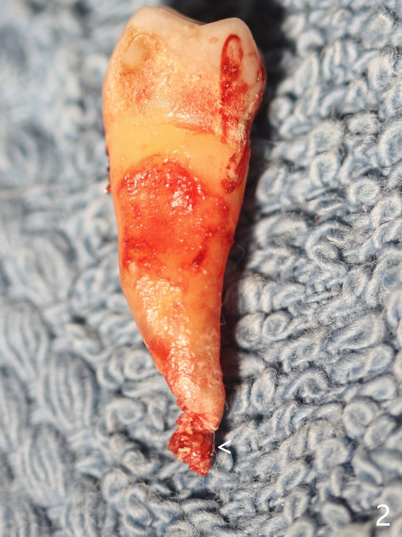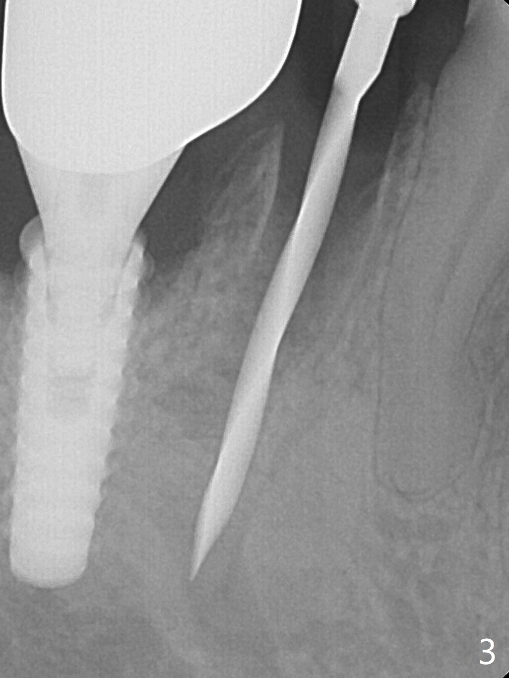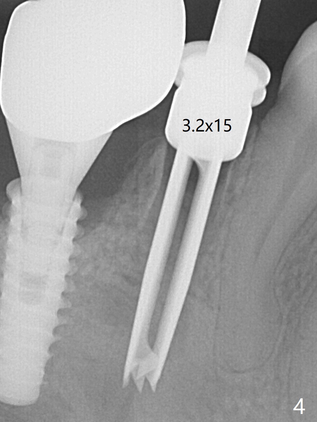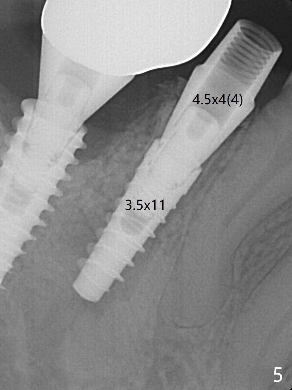 The tooth #29 has mild persistent pain radiating to the temple with mild percussion and mobility I 4.5 months post apicoectomy; the buccal recession is noticeable (Fig.1). Granulation tissue and bone graft are attached to the resected apex of the extracted tooth (Fig.2 <). The initial osteotomy with 1.5 mm drill is distal (Fig.3). After position adjustment with difficulty because of hard bone, osteotomy is finished with 2.8 and 3.2 mm Magic Drills (Fig.4). Following final drill, a 3.5x11 mm IBS implant is placed with insertion torque of 45 Ncm. With placement of a 4.5x4(4) mm abutment, Vanilla graft is placed in the buccal gap (Fig.5). Immediately postop CT shows that the implant is buccally placed (Fig.6,7 B). In fact after extraction (Fig.8), the initial osteotomy should start obliquely and as coronal and lingual as possible (Fig.9 red line). Following the initial penetration, the osteotomy should be straightened (Fig.10) so that the implant could be placed lingually (Fig11 green) to reduce buccal thread exposure. In fact there is also buccal thread exposure at #30 (Fig.12). The bone loss at #29 and 30 is minimal 4 months postop (#29, Fig.13 *)) and severe with periimplantitis at #29 one year post cementation (Fig.14). Incision will be made to exposure buccal threads of #29 and 30. If threads are within bone boundary, bone graft will be done with sticky bone after Titanium brush. If not, remove implant threads and bone graft. The worst scenario will be handled with implant removal (trephine bur 4/5 mm), either with bone graft or implant being placed lingually (IBS 3x11 mm 2-piece, to be buried, if needed (Fig.15)). Take preop photos to show #29 and 30 buccal recession and gingival erythema.