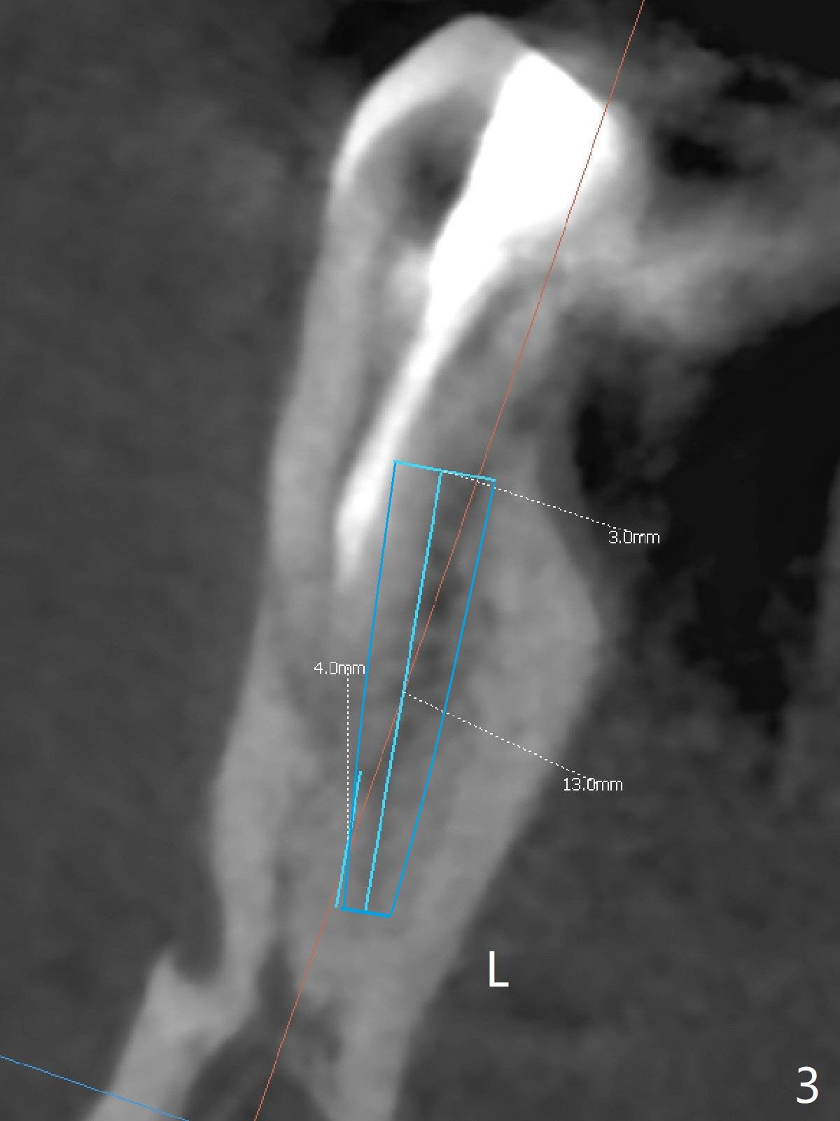 A 48-year-old man has pain 4.5 months post apicoectomy at #29 and requests extraction and immediate implant. Since the mesiodistal bone width is limited, the 1st option is to place a narrow IBS implant (Fig.1). First at all, use 1.6 mm drill to establish osteotomy with correct trajectory. If the effort to change the trajectory and position fails, switch to a 3x14 or 16 1-piece implant to reduce the chance of abutment screw loosening. If intraop PA shows the mesiodistal bone width is not so narrow and stability is not ideal, use a UF implant (Fig.2). CBCT coronal section shows a 15 mm long implant may perforate the lingual plate (Fig.3 L). To place an implant lingually, the coronal end of the lingual plate should be removed (*).