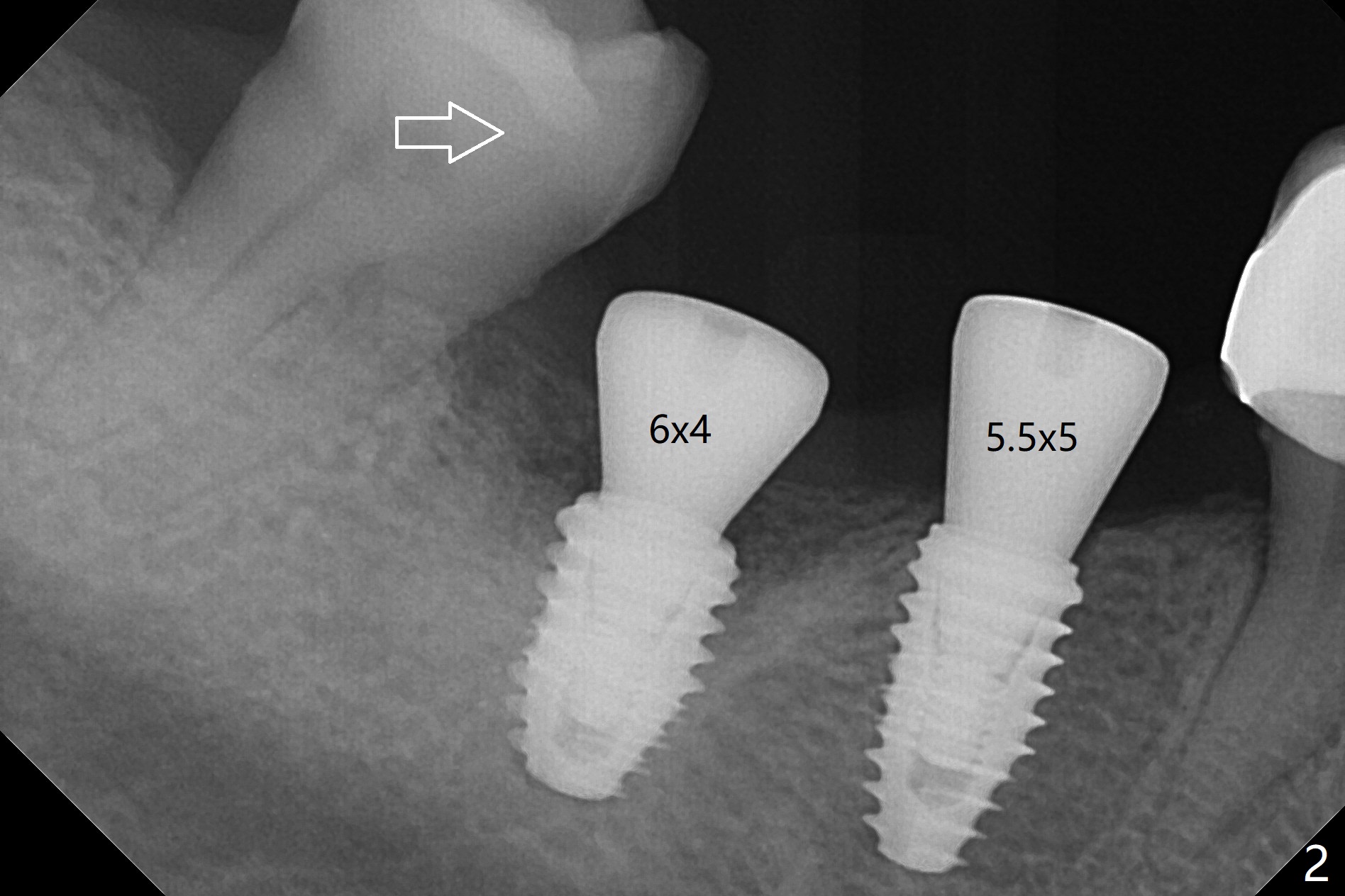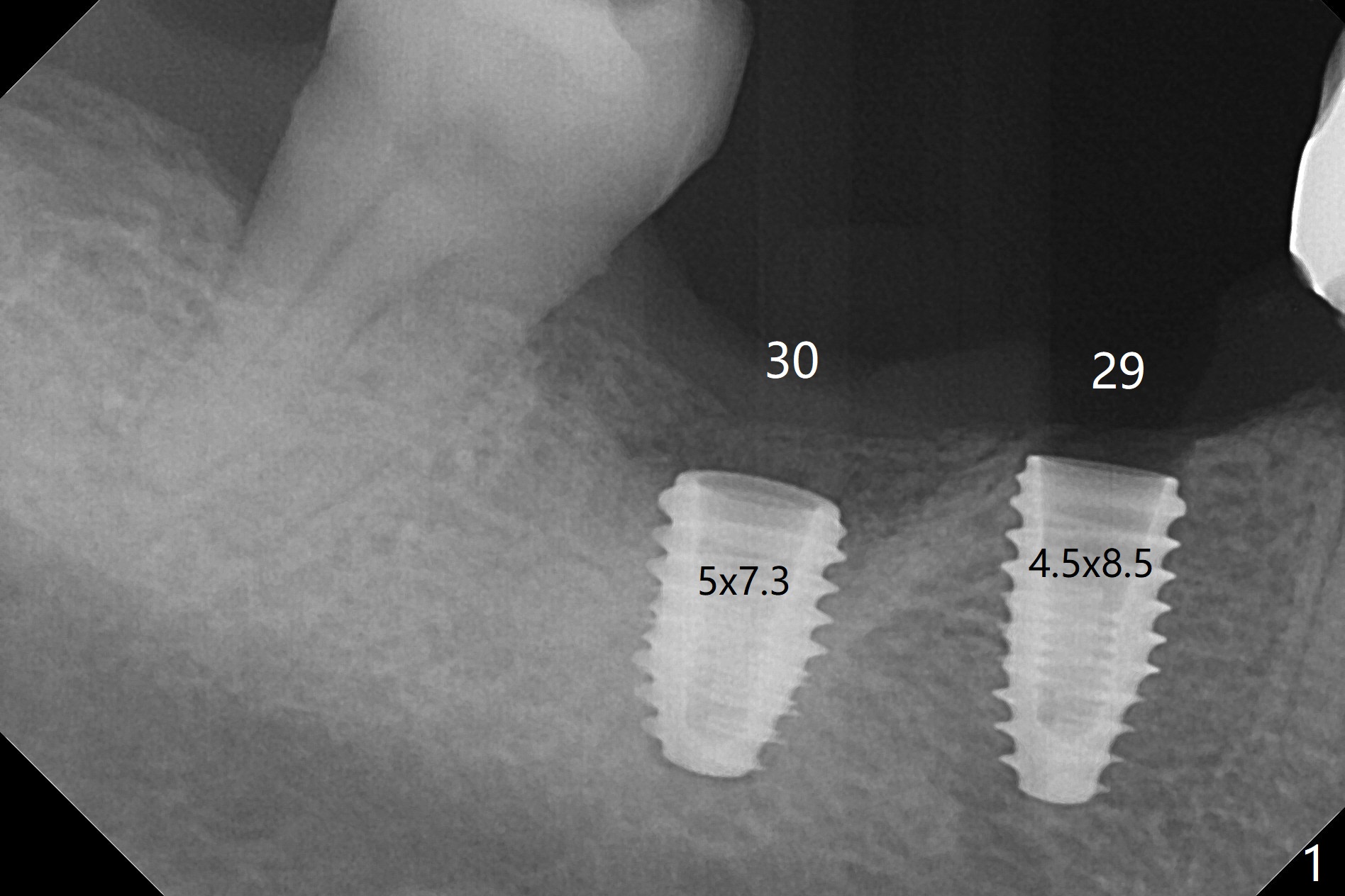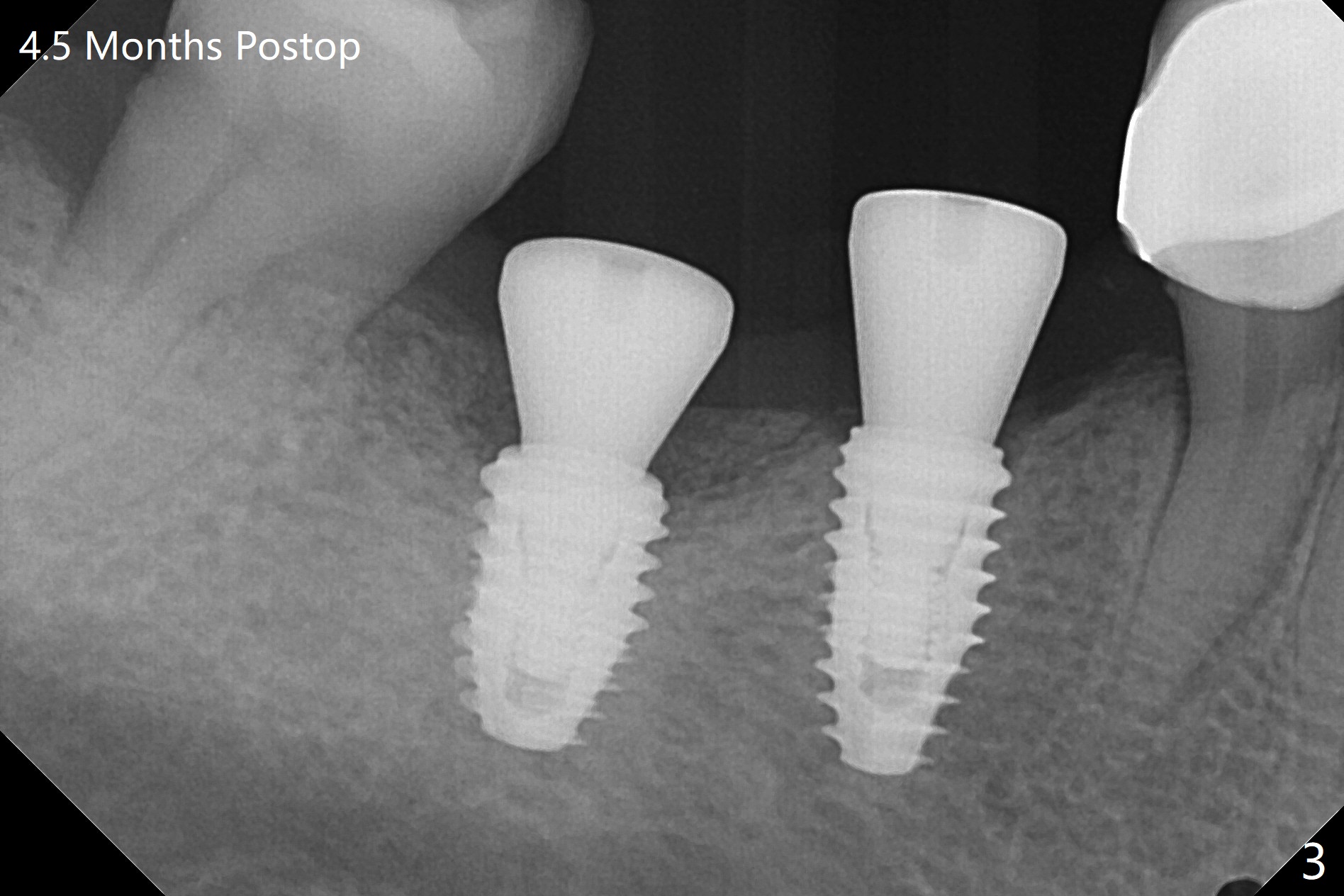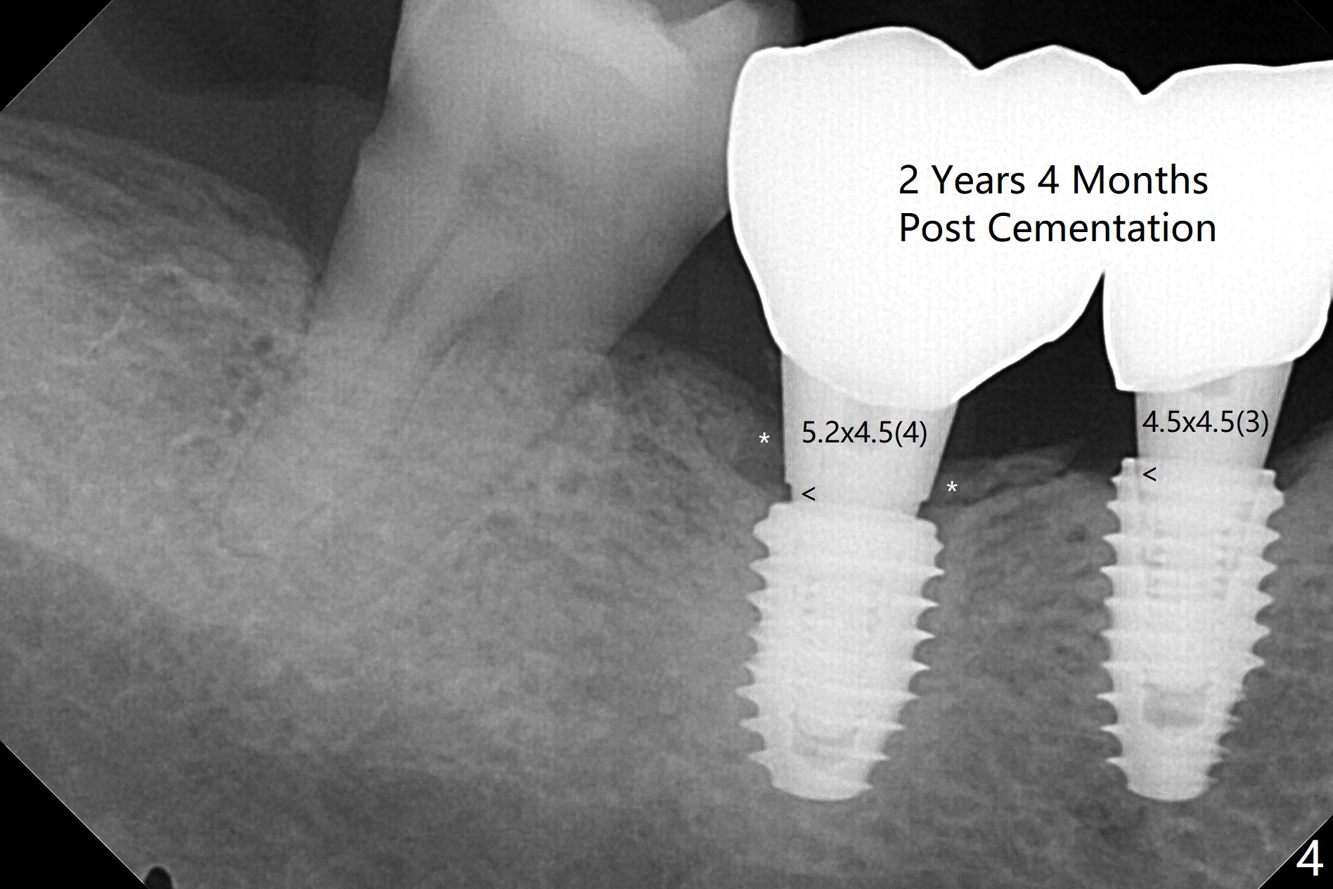 With one carpule of Xylocaine 34 mg with Epinephrine 17 mcg (infiltration) and slow osteotomy with guide, two short implants are placed at #29 and 30 painless with >45 Ncm (Fig.1). Healing abutments are placed without bony interference (Fig.2). It appears that the tooth #31 shifts mesially (Fig.2 arrow), which should be slowed down and/or corrected with early provisional. There is no bone loss 4.5 months postop (Fig.3). With placement of 4.5x4.5(3) and 5.2x4.5(4) mm abutments at #29 and 30, respectively, no limited orthodontic treatment seems to be needed. The screw at #29 becomes loose 4 months post cementation and a few days after #19 implant is loose (bruxism). In fact this is not completely true, since the abutment at #29 is incompletely seated (Fig.4). The abutment at #30 is also incompletely seated because of the vertical gap (<), probably due to mesial and distal crestal interference (*).