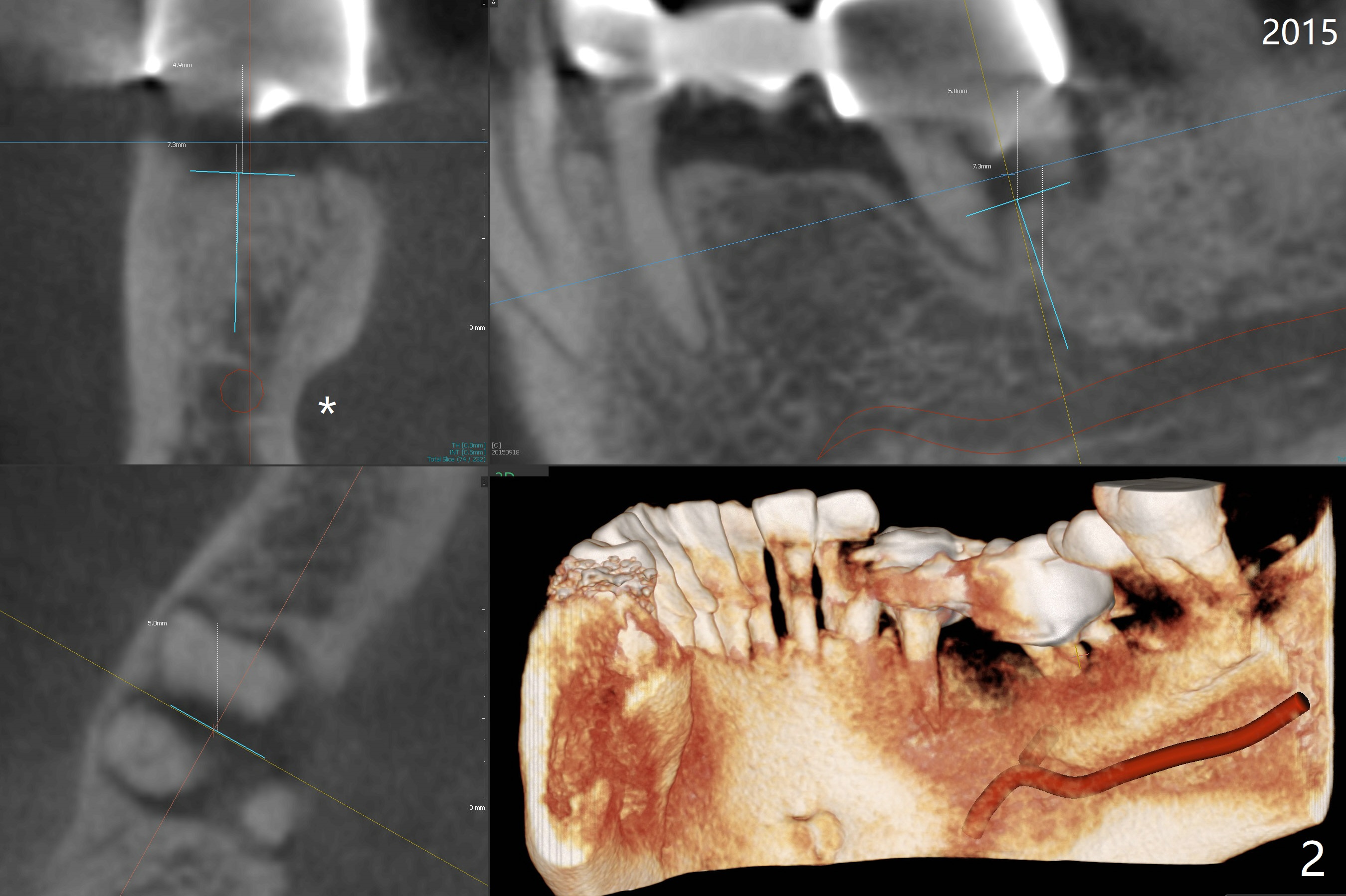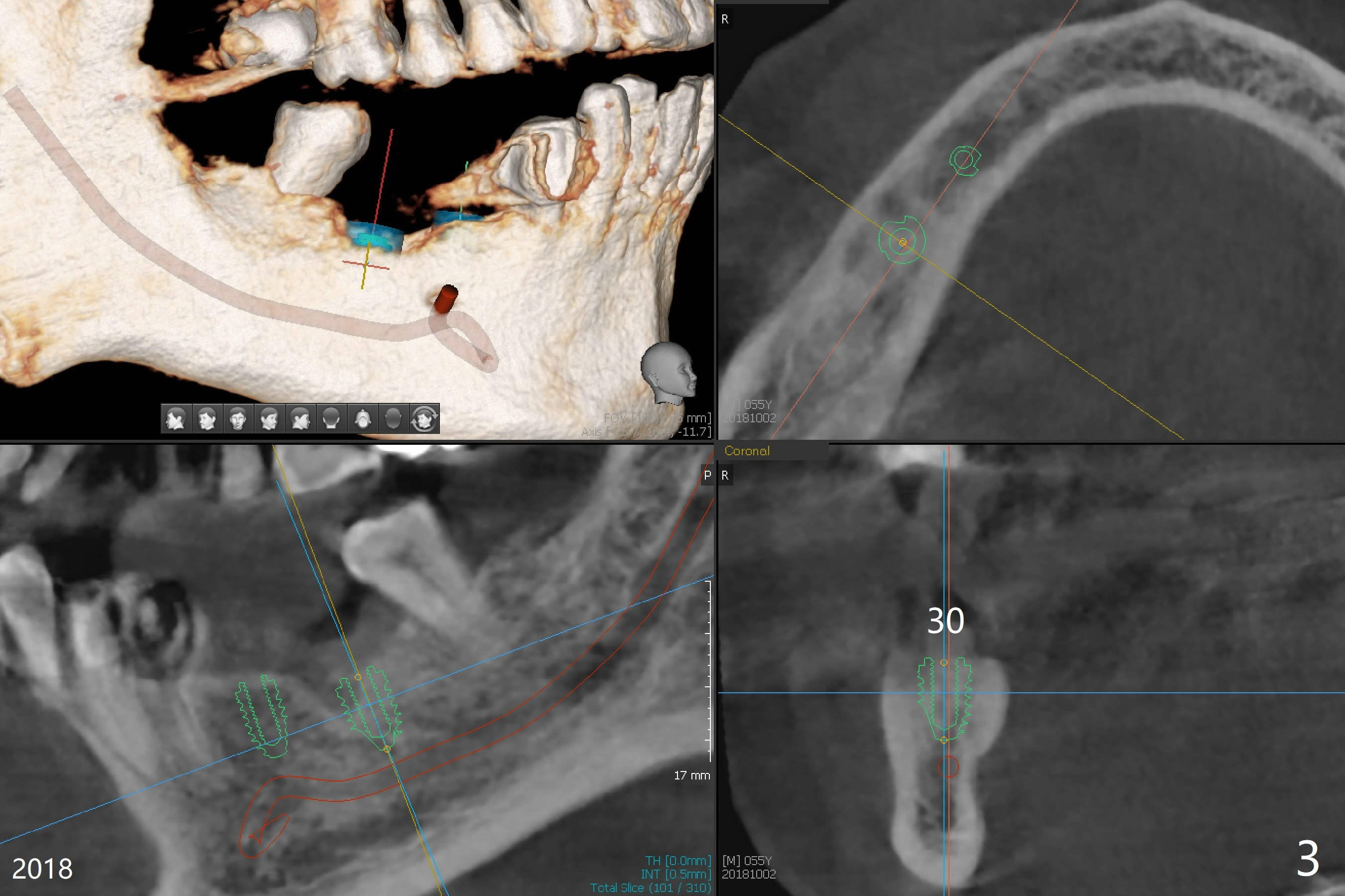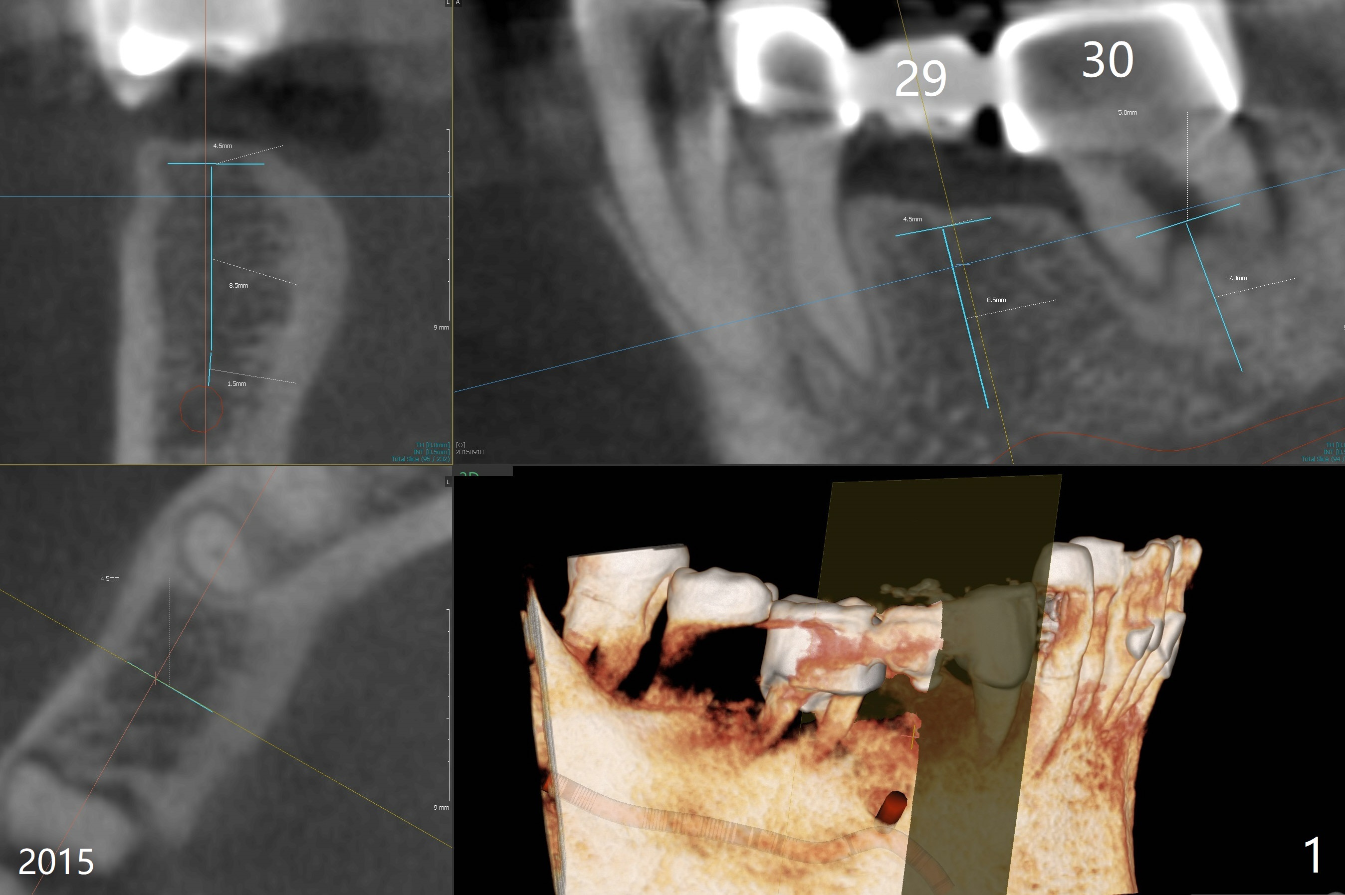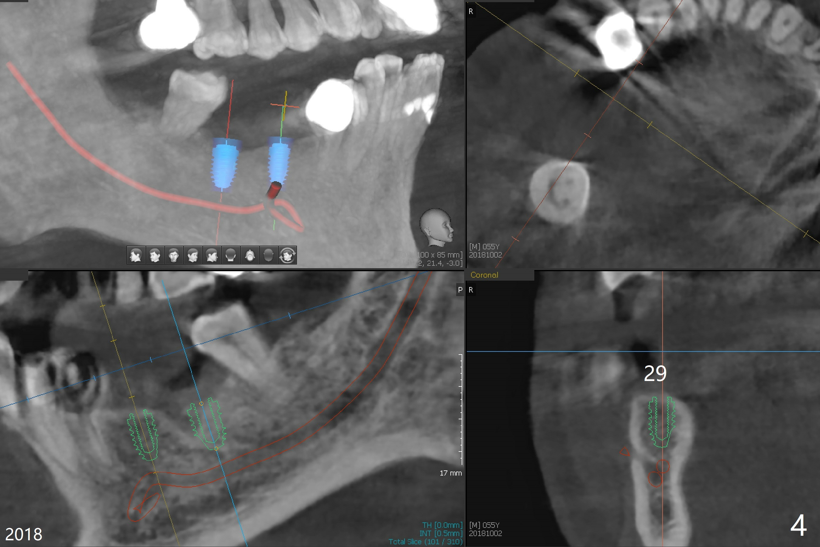 A 55-year-old man had #30 extracted and #29 pontic removed ~ 3 months ago (Fig.1,2). Short implants are to be placed (4.5x8.5 and 5x7.3 mm) with guide. Pay attention to the submandibular fossa (Fig.2 *) as related to the site of #30. New CT (Fig.3,4 (2018)) shows that implants will be 4x7.3 and 5x7.3 mm.
