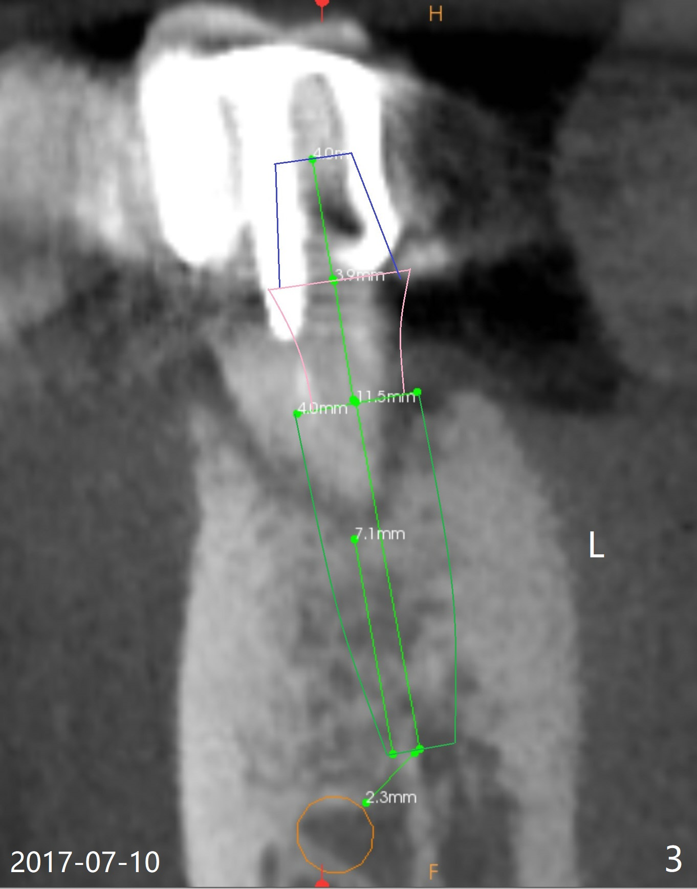 A 47-year-old man cannot chew in the lower right quadrant due to mobility of the tooth #29, which has a post (Fig.1 <). It appears that there is a buccal vertical fracture line. After extraction, osteotomy will be initiated in the mesiolingual aspect of the socket for 7 mm (Fig.2,3). The bone is dense (600-1,000 units); drills are required. Take a PA to confirm the trajectory. Following sequential osteotomy, place a 4x11mm dummy implant before placing a 4x9 or 11 mm definitive one, depending on bone resorption in the last 6 months (compare Fig.2,3 vs. 1).