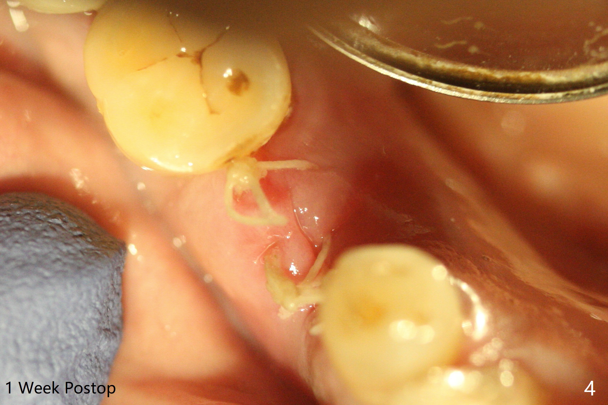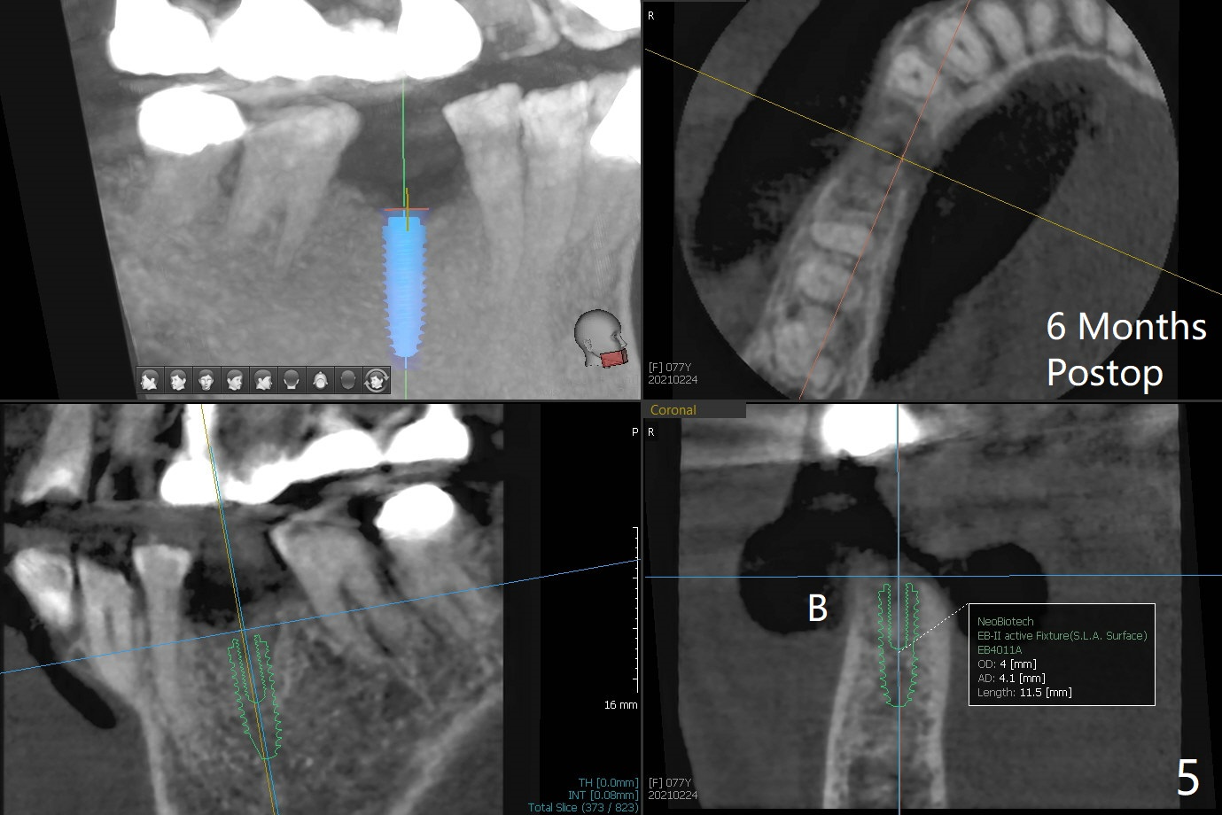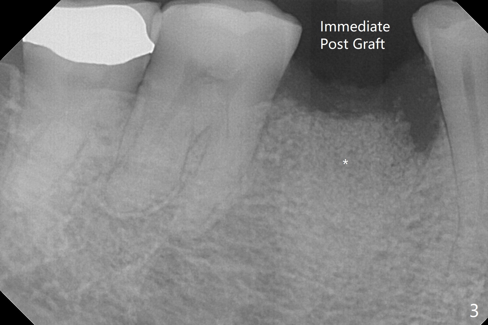 A 77-year-old woman agrees to have the lower right 2nd premolar extracted after lengthy delay (Fig.1,2 buccolingual plate present, but low) and grafted (Fig.3 *).  Cortical graft is heavily packed, covered by a small piece of 6-month membrane and sutured with 4-0 Chromic gut suture.  The socket is closed 7 days postop (Fig.4).   The buccal plate seems to have been reformed 6 months postop (Fig.5,7, as compared to Fig.6 (pre-fracture)).  Return to No Deviation Surgery  Xin Wei, DDS, PhD, MS 1st edition 08/19/2020, last revision 05/12/2021