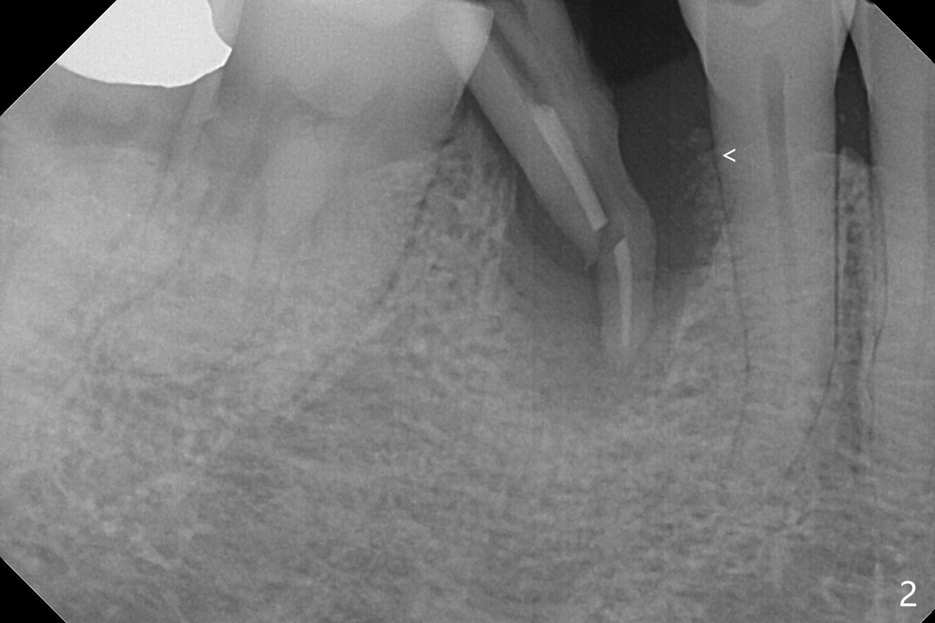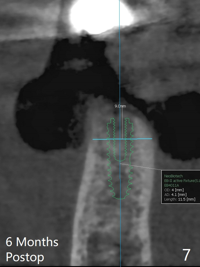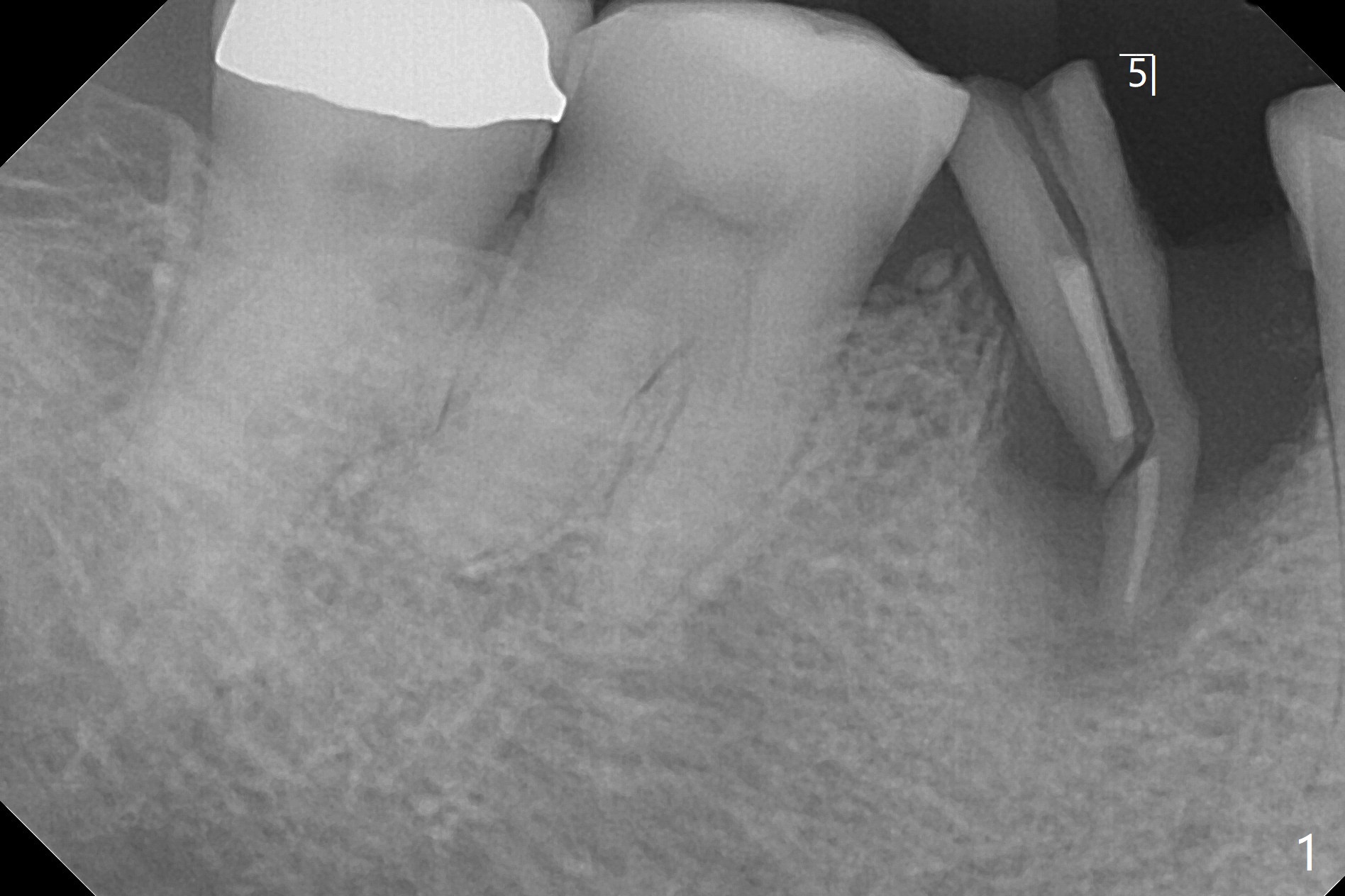 A 77-year-old woman agrees to have the lower right 2nd premolar extracted after lengthy delay (Fig.1,2 buccolingual plate present, but low) and grafted (Fig.3 *).  Cortical graft is heavily packed, covered by a small piece of 6-month membrane and sutured with 4-0 Chromic gut suture.  The socket is closed 7 days postop (Fig.4).   The buccal plate seems to have been reformed 6 months postop (Fig.5,7, as compared to Fig.6 (pre-fracture)).  Return to No Deviation Surgery  Xin Wei, DDS, PhD, MS 1st edition 08/19/2020, last revision 05/12/2021