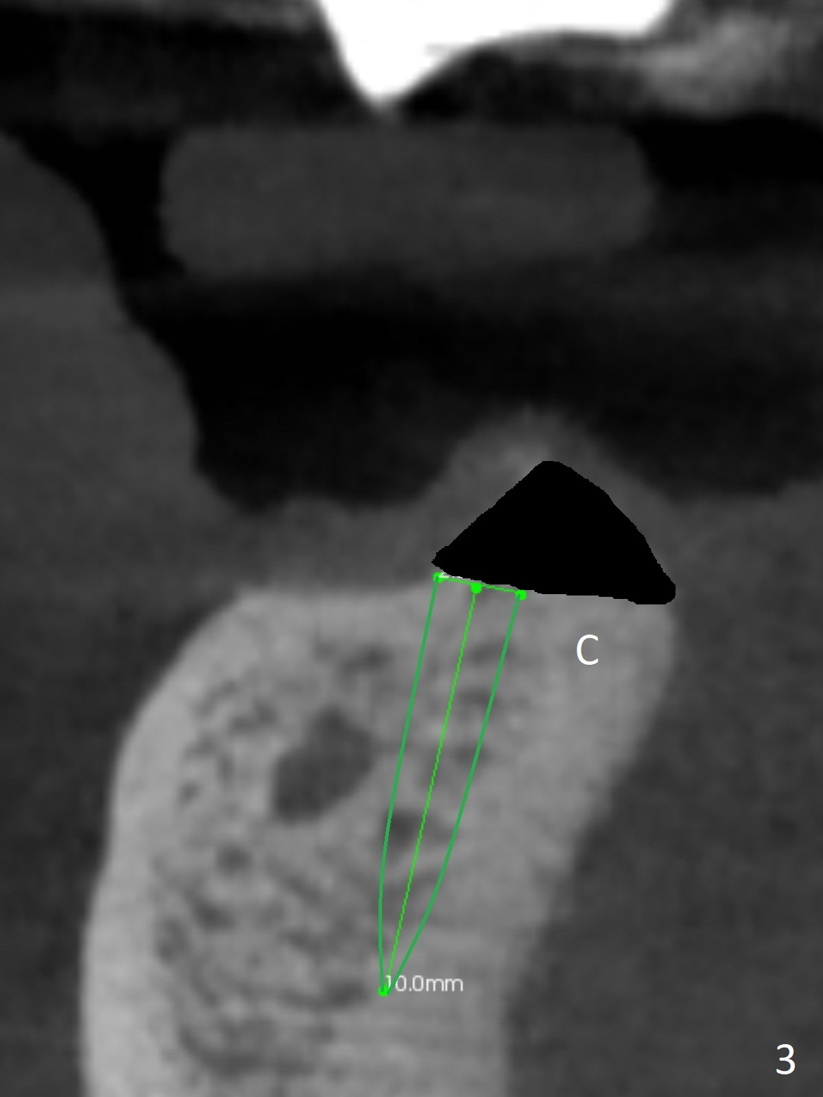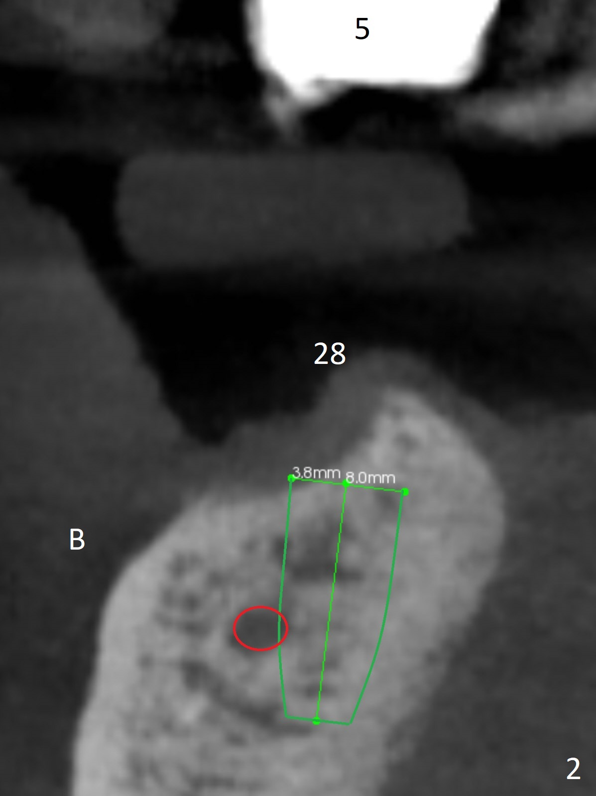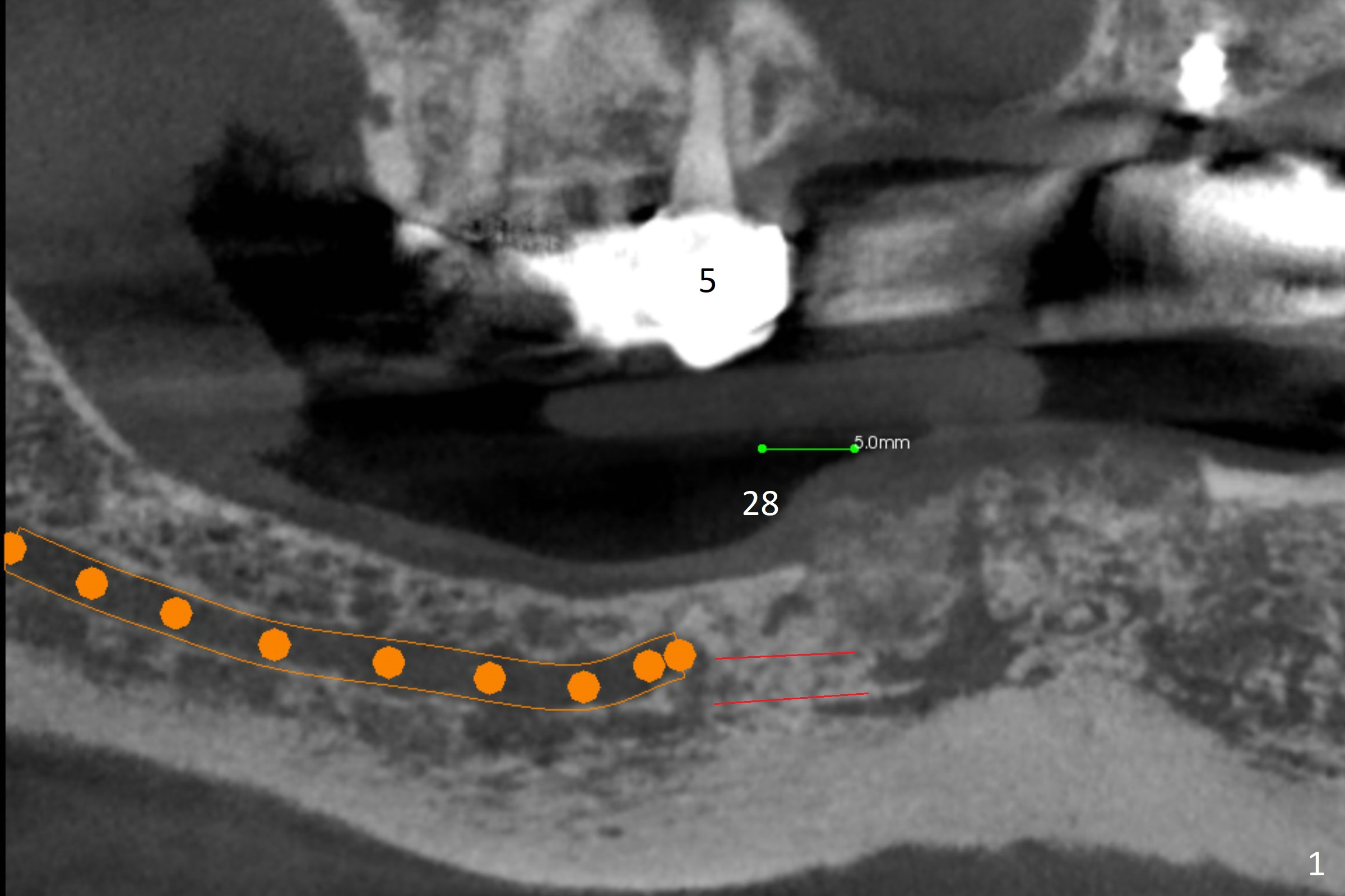A 62-year-old woman has failed implant at #27 for the 2nd time. The crowns at #20 and 21 are loose and non-salvageable (Fig.4-6). Three implants will be placed at #20, 21 and 28 (Fig.1), since the bone height in the lower right posterior region is limited. Ball abutments will be used to retain the lower RPD. When a narrow implant is placed at #28, it will invade the Incisive Canal (Fig.2 red circle), which does not cause neuropathy, but hemorrhage. In contrast, it is safer to place a 2 mm 1-piece implant with ball type after ridge reduction (Fig.3 black triangle).