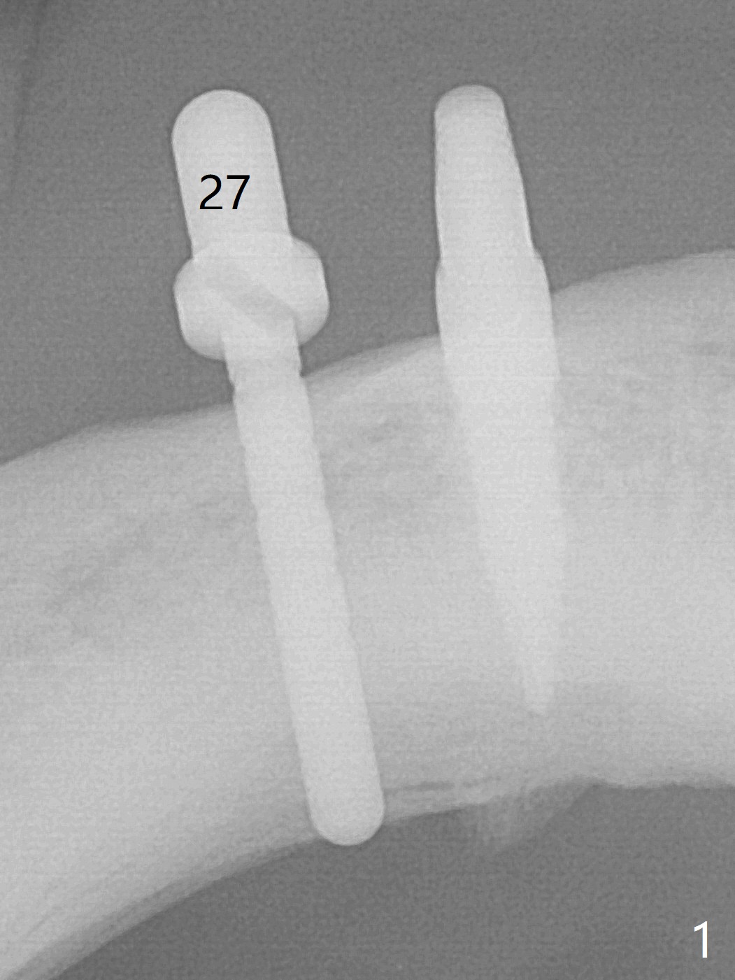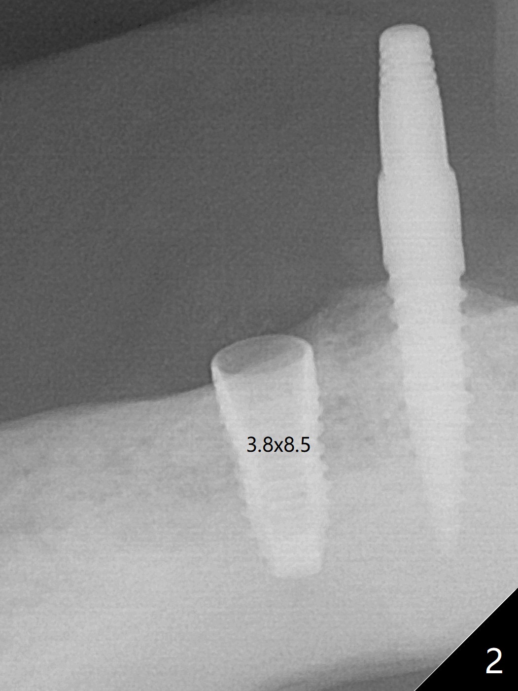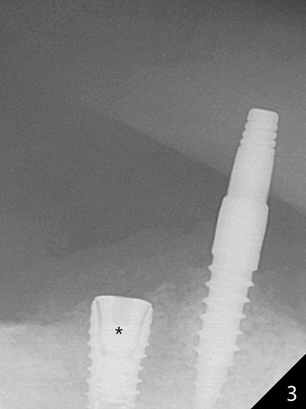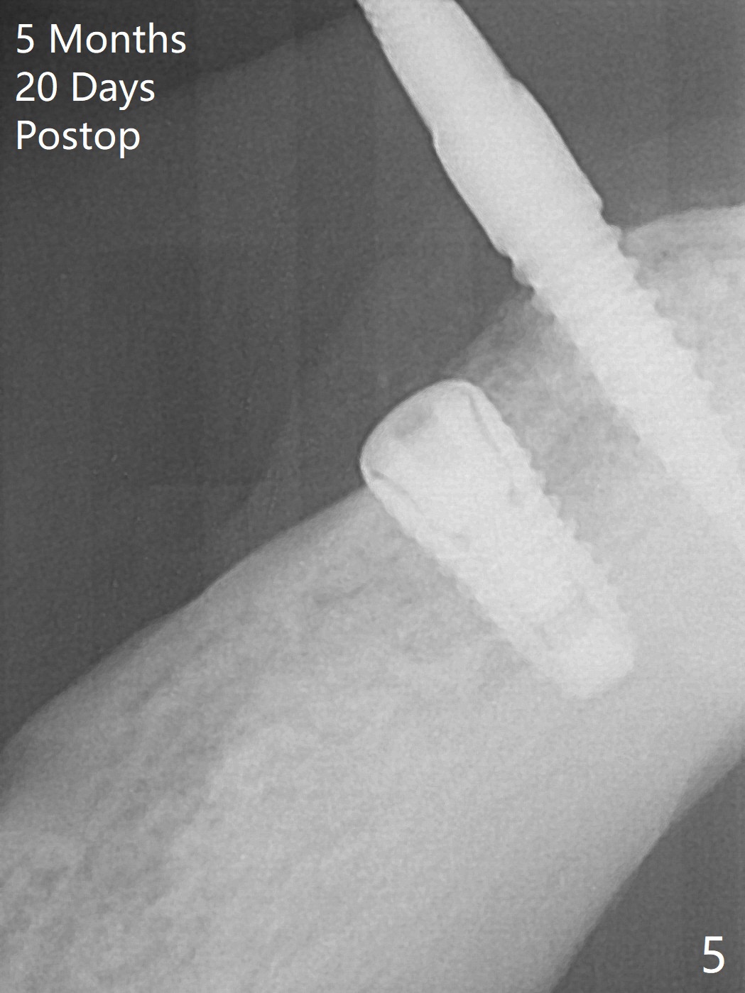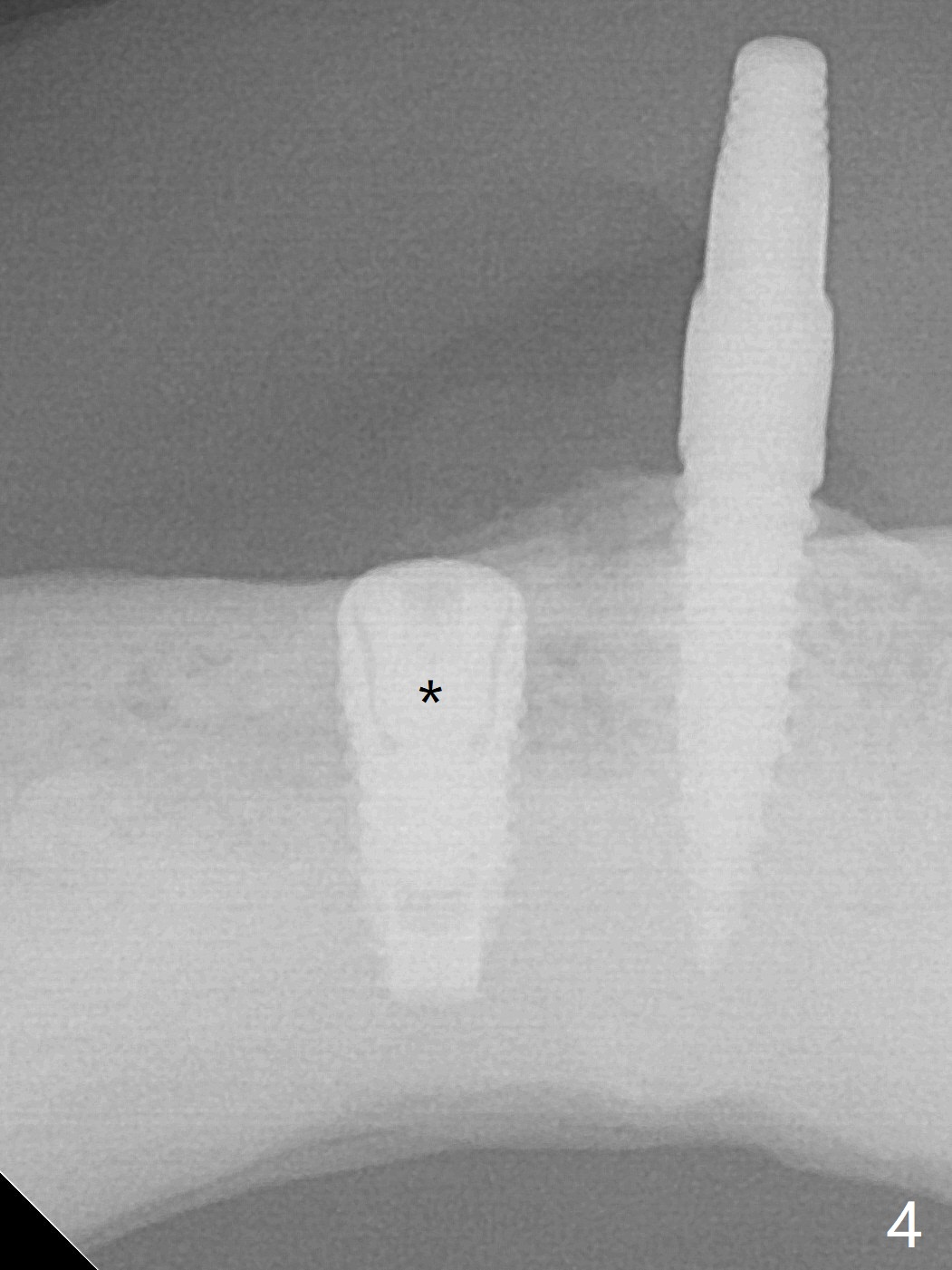 Two months post removal of a loose implant at #27 for the 2nd time, an incision is made. The osteotomy has healed. Initial osteotomy with 2 mm drill for 12 mm leads to sudden empty feeling in spite of lingual plate protection (Fig.1). When the parallel pin is removed, a long explorer does not find the perforation. Subsequent osteotomy depth is 8.5 mm. A 3.8x8.5 mm implant is placed with >40 Ncm (Fig.2). After 5 more turns of the implant, a healing screw is placed (Fig.3,4 *). The wound is closed for infection control. It appears that the previous failures are due to lack of depth control and micromovement (immediate loading). The implant appears to have been osteointegrated 5 months 20 days postop (Fig.5).