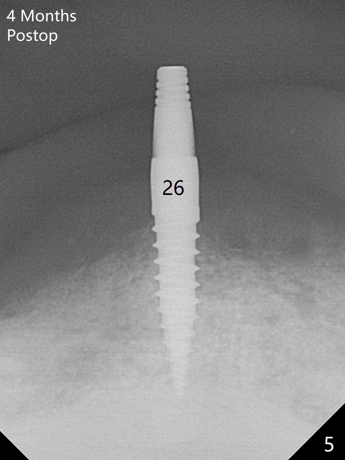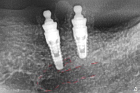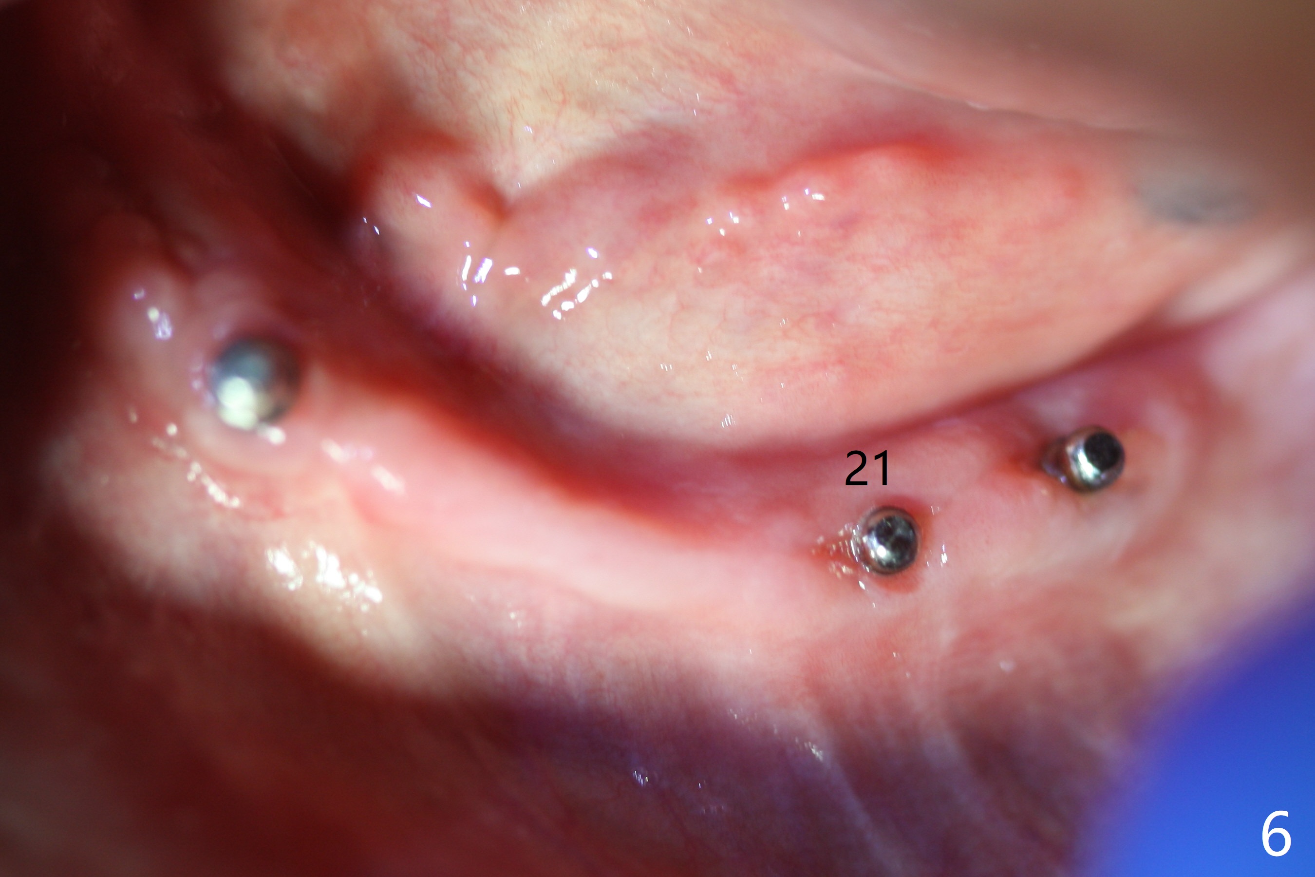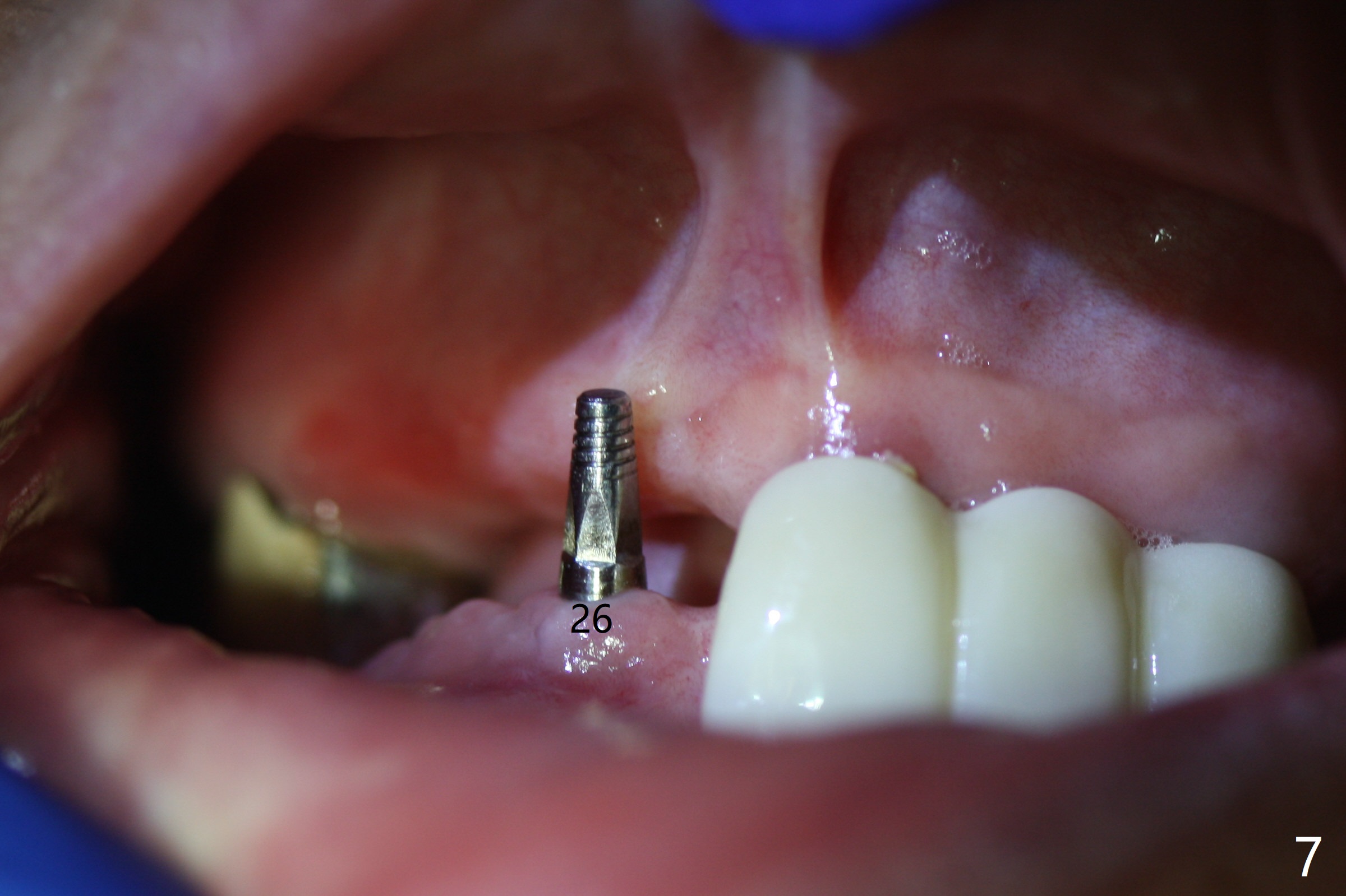 When the patient returns 4 months post #26 implant 2nd placement, the fractured crowns at #20 and 21 are loose. The roots are not difficult to remove. Since the bone height is limited (Fig.1,2), immediate implants are 3.8x8 and 3.8x10 mm, respectively with insertion torque >30 Ncm. Ball abutments (3.9x2 mm) are placed at #20 and 21; the existing lower RPD is soft relined using #26 1-piecee implant as an abutment. The retention of the RPD improves. Another implant will be placed in the lower right quadrant. One month 10 days postop, the ball abutment at #21 seems to be low (Fig.6). It is removed after laser gingivectomy and replaced with a ball abutment with 4 mm cuff. When the patient closes without RPDs, the 1-piece implant at #26 is barely buccal to the upper ridge (Fig.7). It appears that crowns have to be fabricated at #20,21,26 and 27 prior to refabrication of the lower RPD.