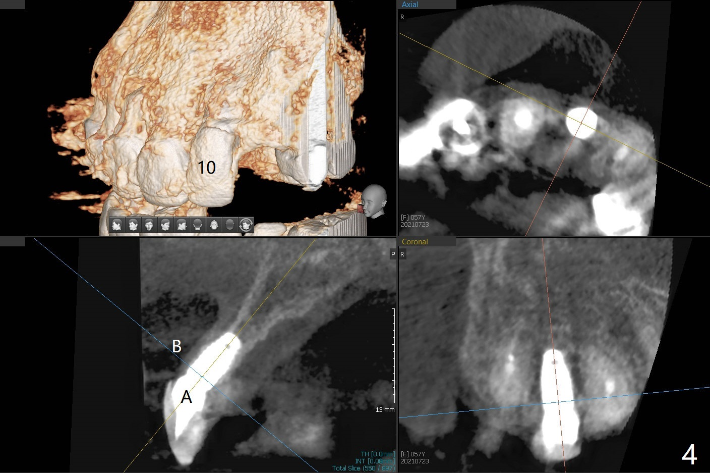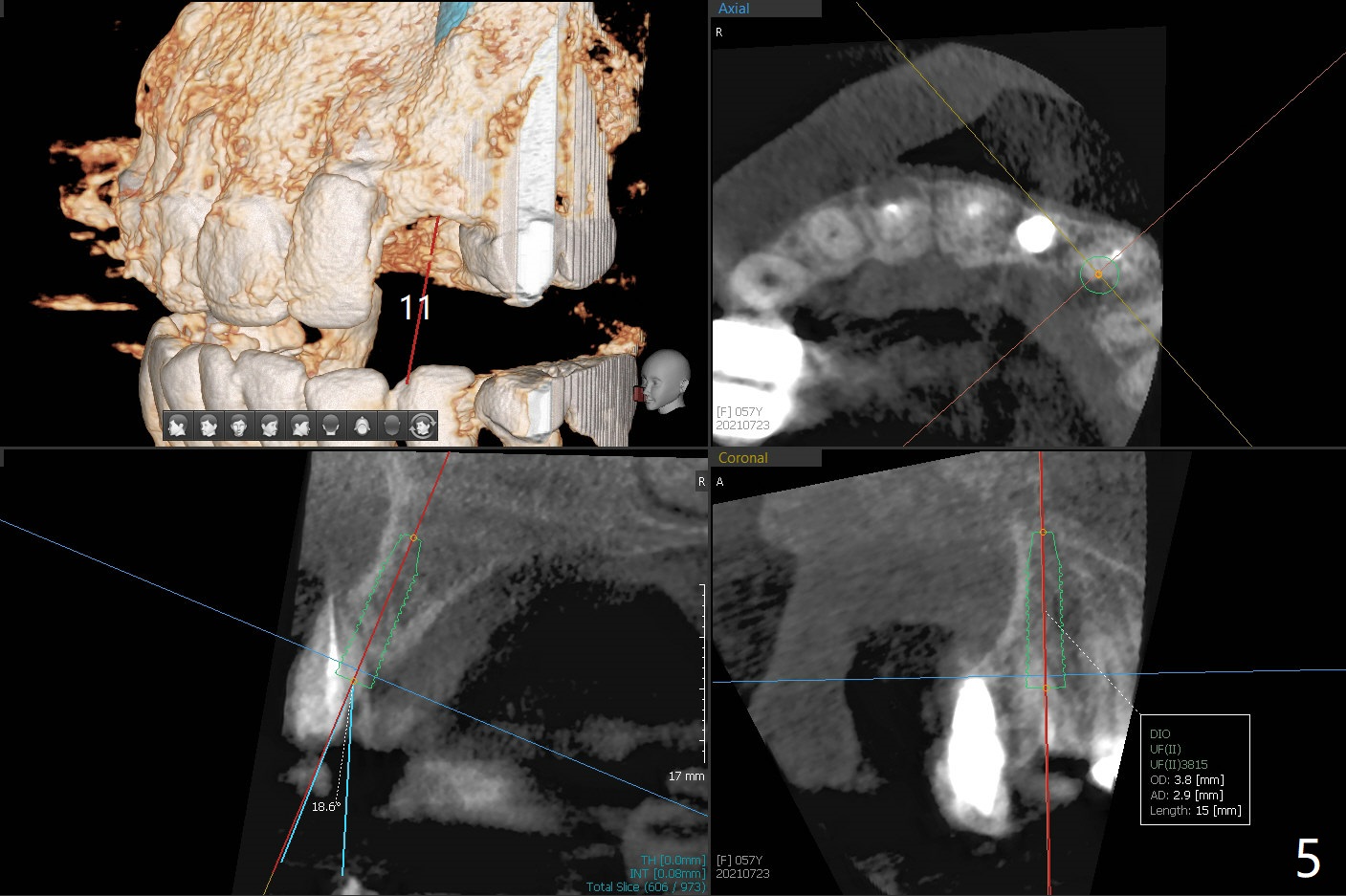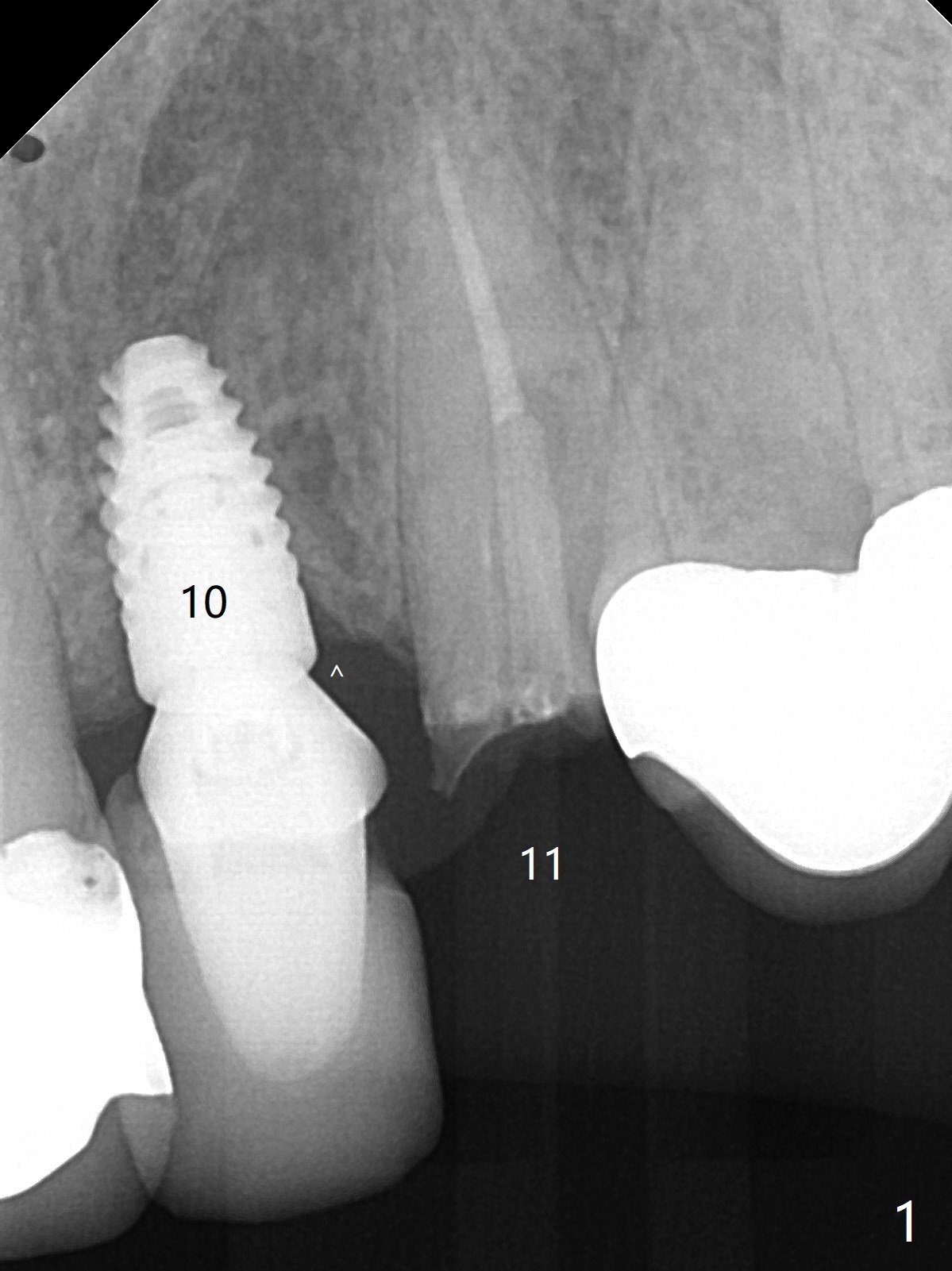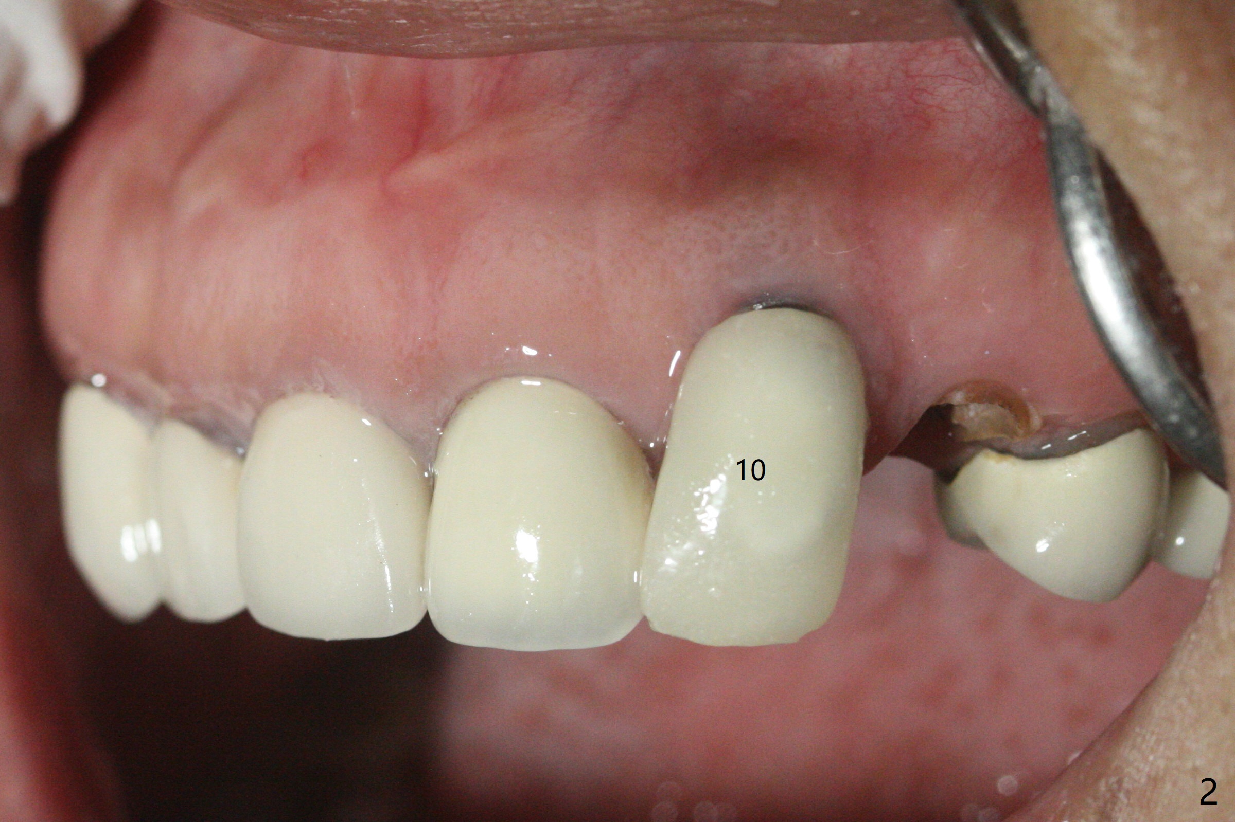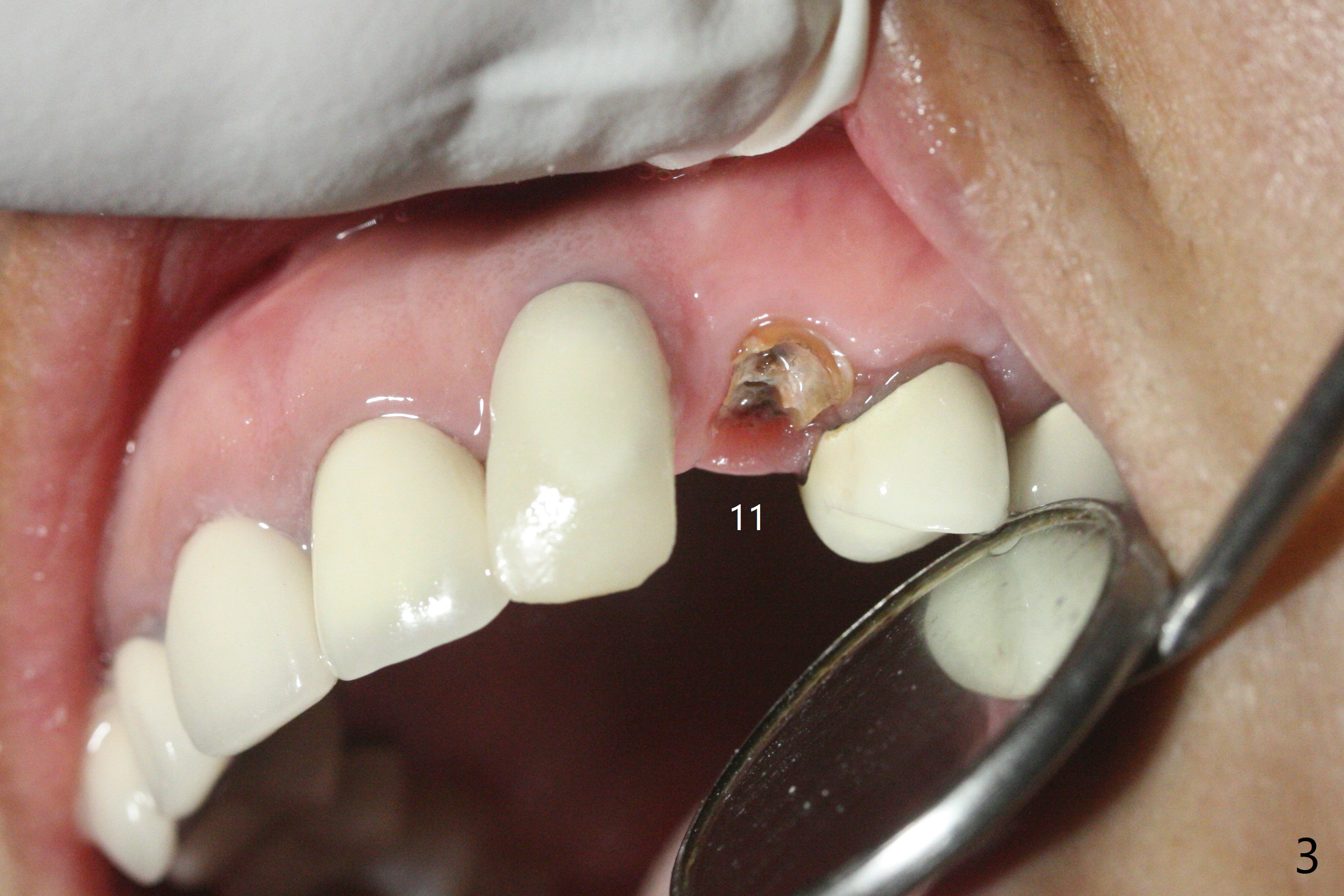 A 57-year-old woman presented to office with dislodged canine crown 10 months earlier (Fig.1). It was cemented. It dislodged again lately. She decides to have an implant and mentions looseness of the implant crown of the lateral incisor. Gingival recession is severe at #10 (Fig.2), while #11 has subgingival fracture (Fig.3). The recession is related to suboptimal angulation and buccal placement of the fixture (Fig.4), while the implant at #11 will be narrow and be placed with sufficient remaining buccal and palatal bone (Fig.5). Socket shield may be done. Prepare gingival retractors. In fact socket shield is not done because of caries in the root stump.