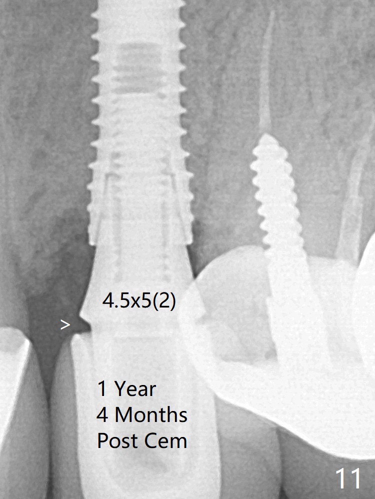 In spite of severe apical infection (Fig1,2 *), a thin narrow strip of the buccal plate (arrowheads, corresponding to the keratinized gingiva) is present when the tooth #11 is extracted. The thin bone keeps the bulging alveolus, i.e., reservoir for bone graft (Vanilla/Osteogen Fig.4 *) after placement of a 3.8x16 mm implant (Fig.3,4). A 4.5x1 mm temporary abutment, placed and trimmed for an immediate provisional, seems to be short in cuff. When an implant is placed deep to prevent periimplantitis, the cuff should be longer, i.e., 3 mm. X-ray should be taken for the depth confirmation after temporary abutment placement. Fig.3: a 2 mm drill in place, 18 mm in bone vs. 16 mm of implant placed ~ 2 mm subcrestal (Fig.4). A narrow implant (3.8 mm) is chosen over 4.5 mm because of the extensive buccal plate defect. While the hard tissue around the implant seems to be healthy 5 months postop (Fig.7), the soft tissue is not (Fig.8). Indeed PFM helps shade match in this case as well (Fig.9,10). Switching abutments (from temporary to cemented) makes it difficult to seat the crown. Post cementation X-ray leaves record for future contact loosening. The buccal gingiva remains erythematous associated with open margin (Fig.11 >) 1 year 4 months post cementation.