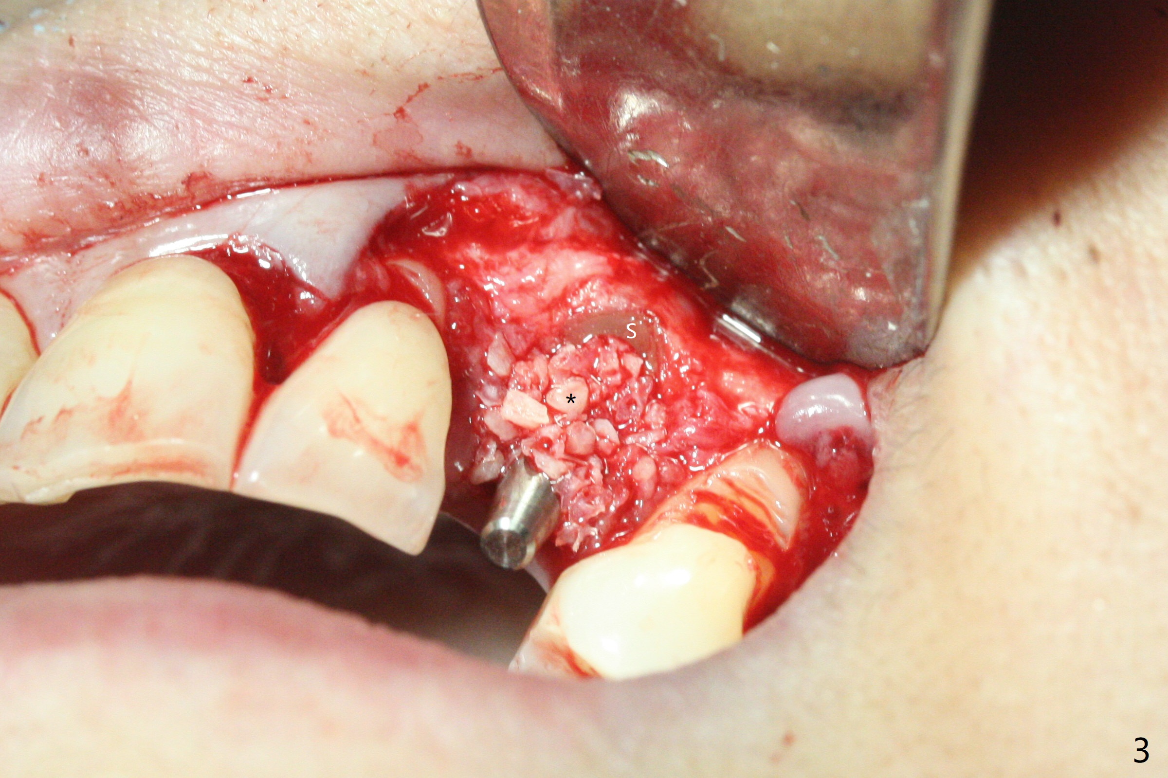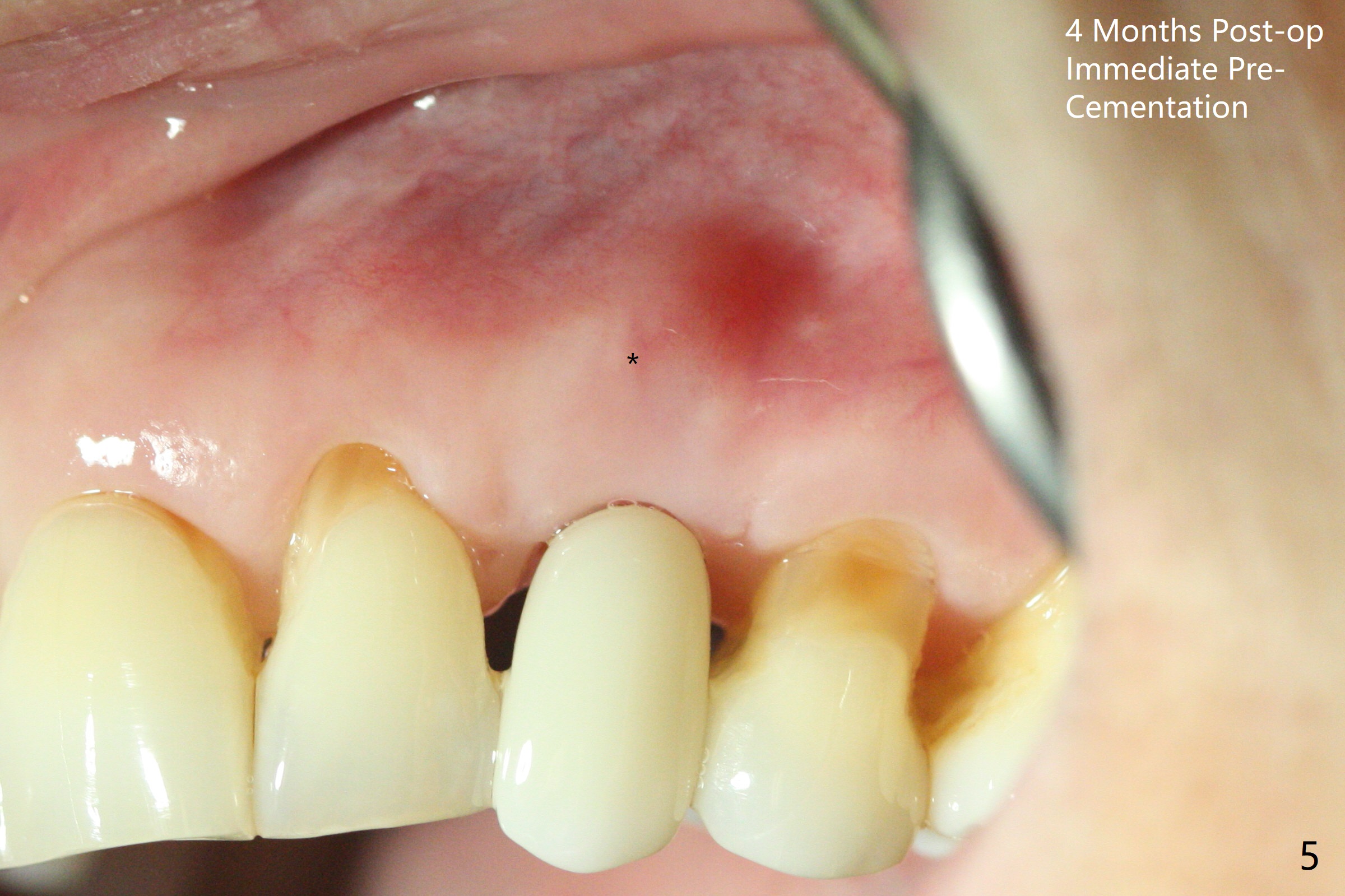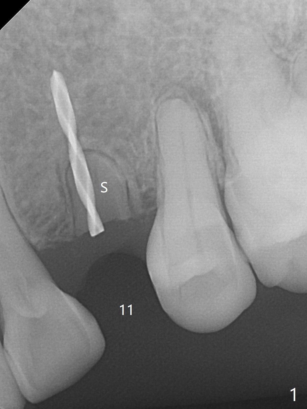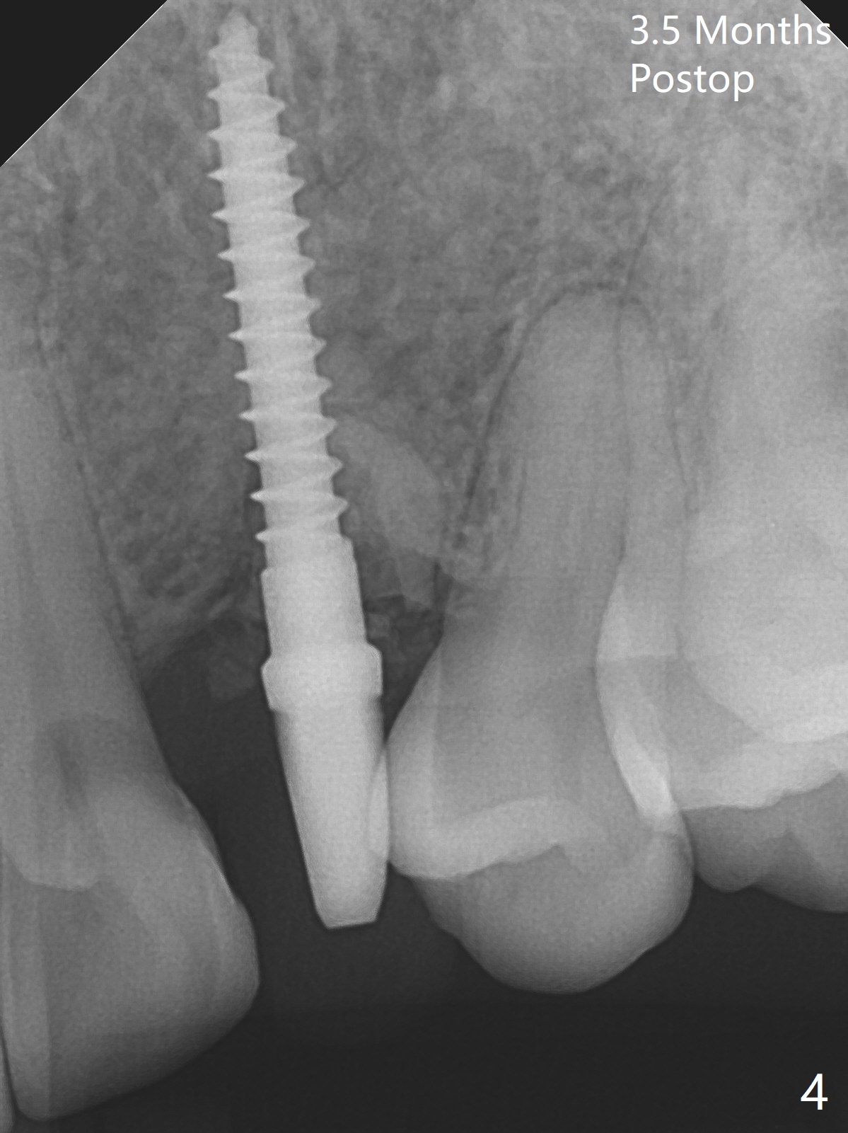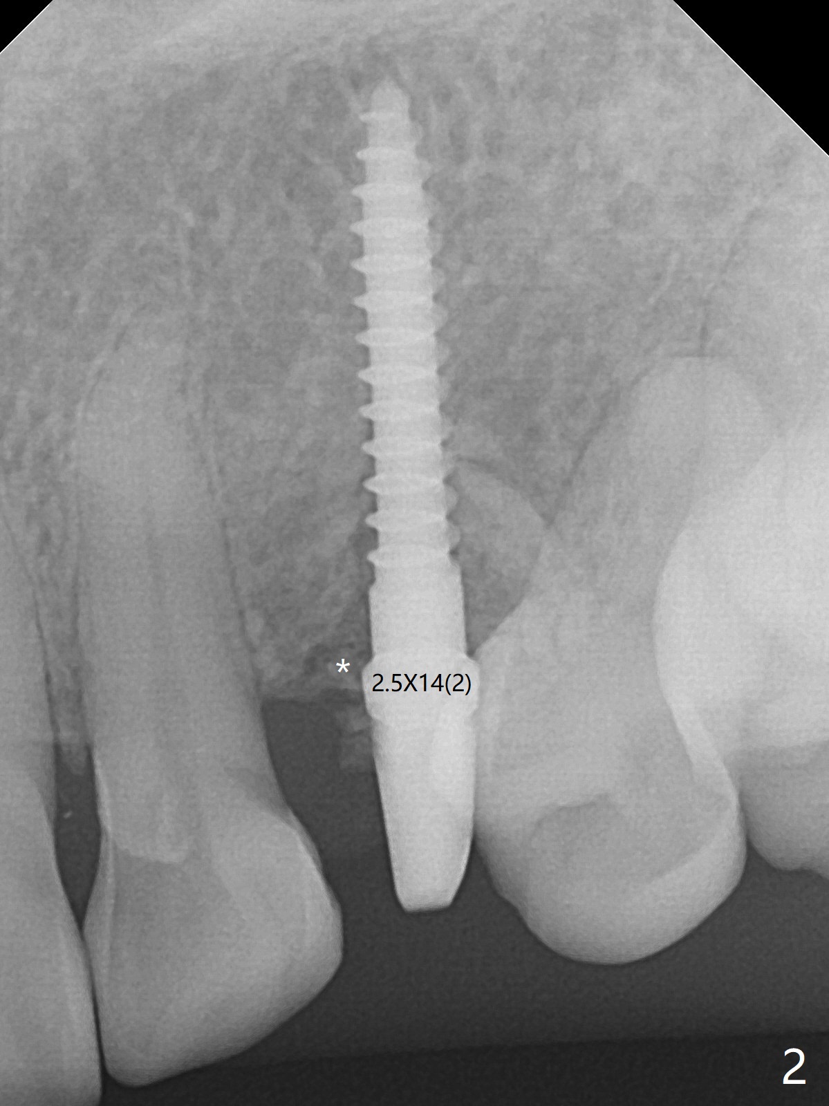 At surgery, the mesiodistal space for #11 is found to be narrow, 5 mm. To prevent buccal plate collapse, socket shield is planned. Due to limited space, incision is attempted so that the lower end of the shield (Fig.1 S) can be trimmed slightly subcrestal. It is also good for visibility for osteotomy (1.2 mm drill for 12 mm). A 2.5x14(2) mm 1-piece implant is placed with <35 Ncm (Fig.2,3 (*: allograft)). An immediate provisional is fabricated to the patient's satisfaction. There is no bone loss 3.5 months postop (Fig.4) or 4 months postop (Fig.5 *, corresponding to S in Fig.3). The recessive papillae are expected to reform to certain degree due to limited damage to the crestal bone.