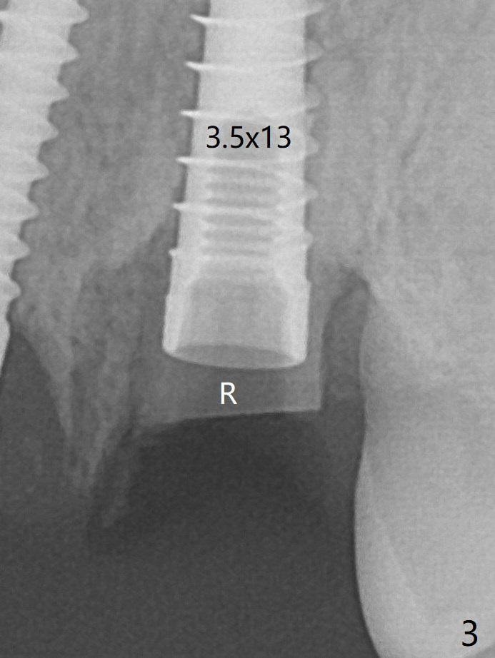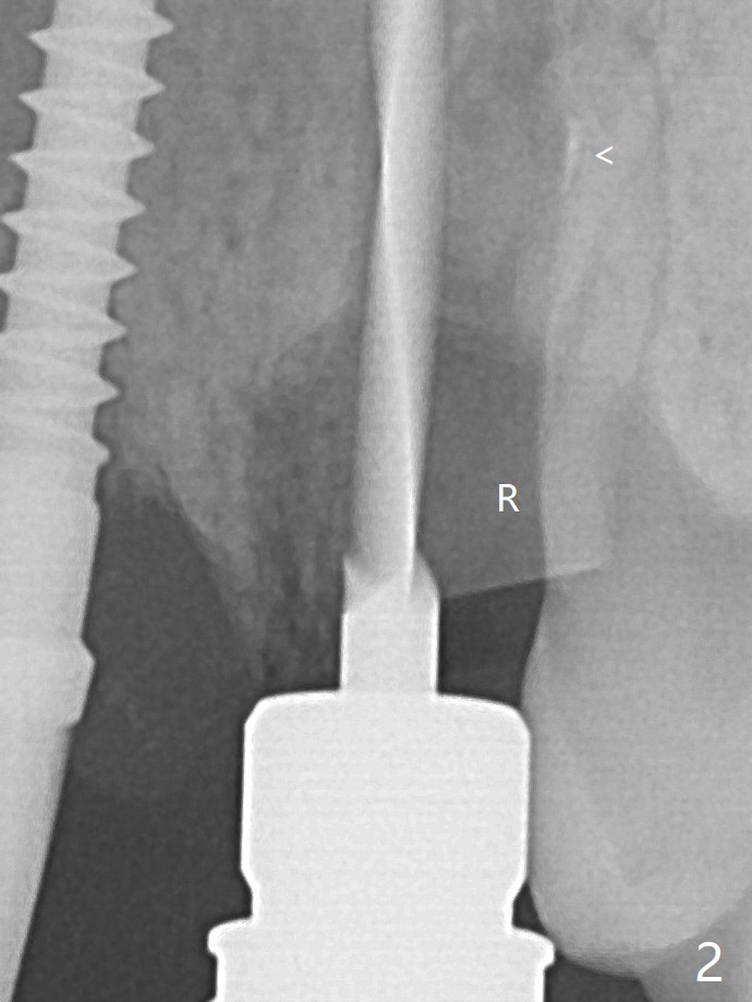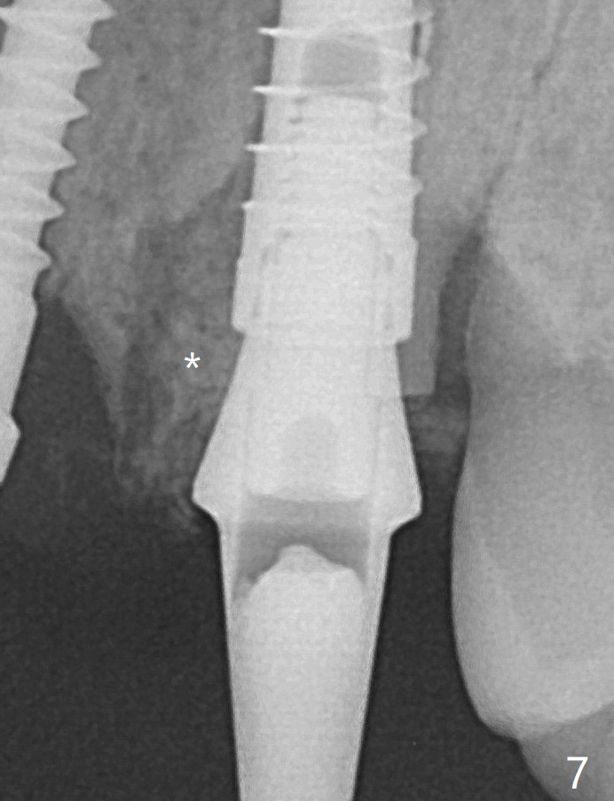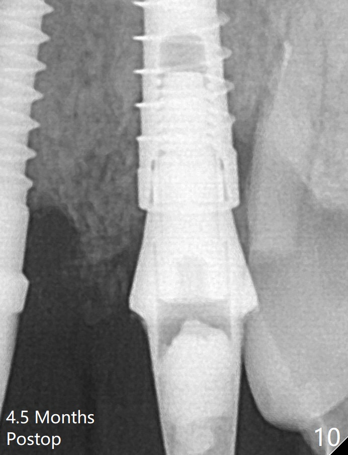 The socket shield at #11 is apparently incomplete, since the apical gutta percha (Fig.2 <) and the apex of the root (Fig.2,3 R) are not removed. The bone is hard when a 1.6 mm drill is being used (Fig.2) as the apical native bone is almost exclusively composed of the cortices. Two of the apical threads of 3.5x13 mm implant are bent, while the implant is placed deeper than the osteotomy (Fig.3,7). After placement of a 4.5x15 degrees A (2mm) angled abutment and Vanilla graft (Fig.7 *), an immediate provisional is fabricated. There is smooth transition from the grafted bone to the native bone 4.5 months postop (Fig.10). Low Magnification, High Magnification of Fig.7,10.