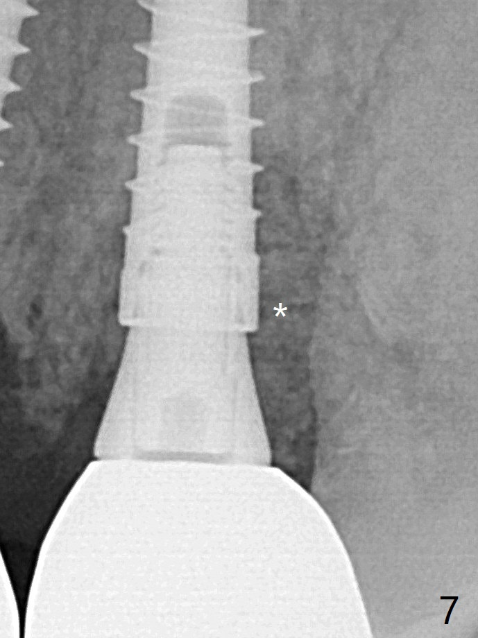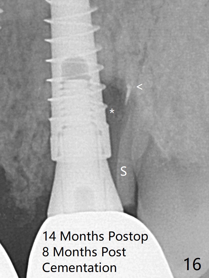 It appears that the socket shield (Fig.16 S) causes infection and loss of bone graft (*). With periosteal relief and placement of sticky bone (Fig.7 *), PRF and 6-month membrane, the wound is closed with 4-0 PTFE suture (Fig.5).