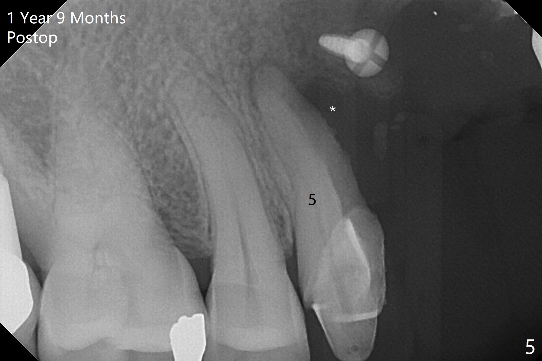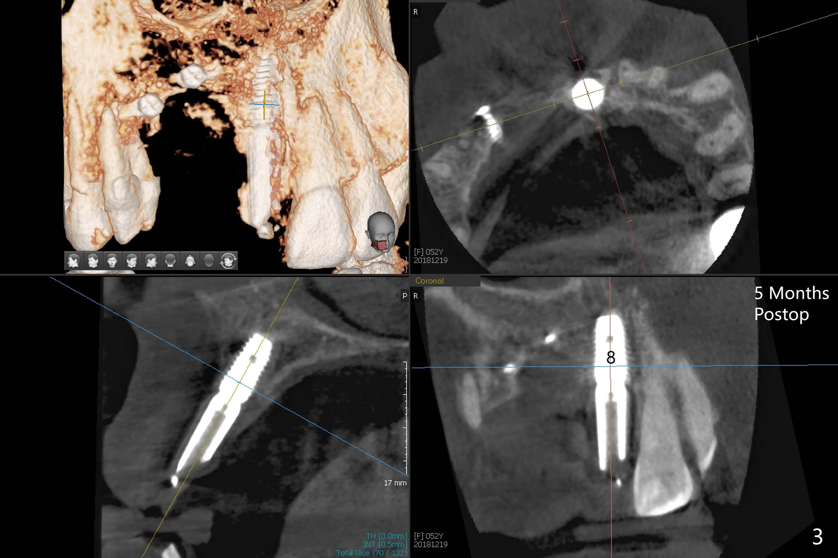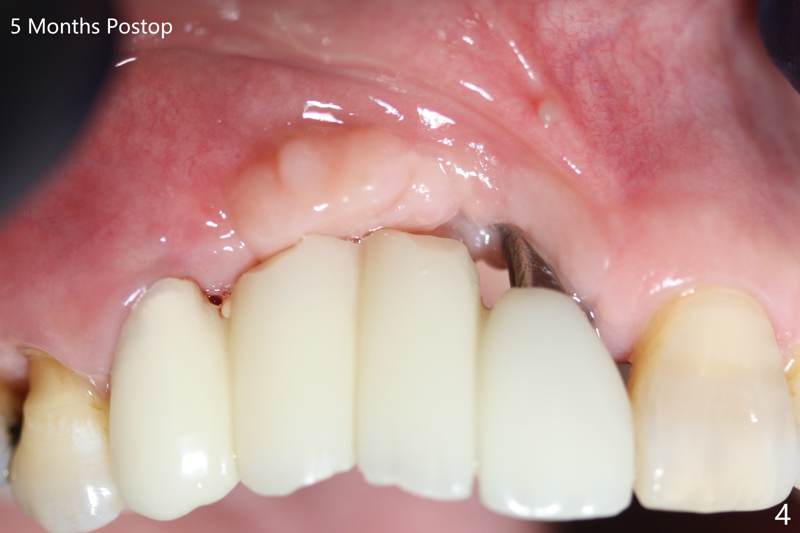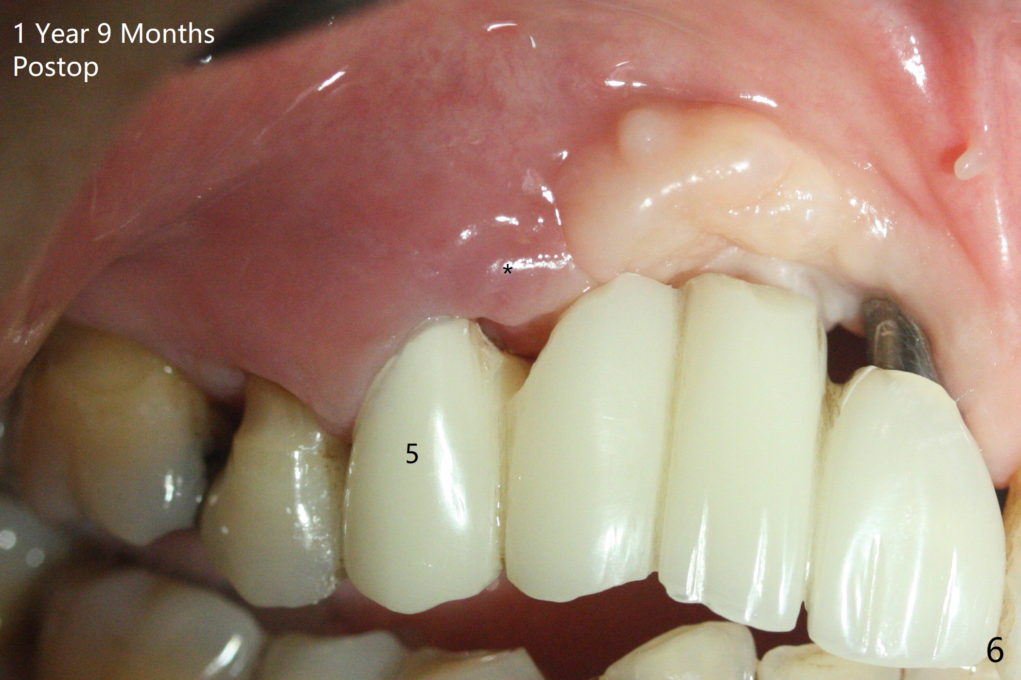 Four months post bone graft with tenting screws at #6 and 7 and implant re-placement at #8, the ridge at #6 and 7 appears to widen slightly, appropriate for narrow implants (Fig.1,2). Guide will be fabricated. The implant at #8 seems to have osteointegrated (Fig.3) with distal gingival recession (Fig.4). One year 5 months later, the tooth #5 is infected with apparently mesial bone loss (Fig.5 *) and papillary erythema and edema (Fig.6). However the pockets are not deep. A gingival embrasure is created between #5 and 6 for self cleansing. The latter does not work. Implants will be placed at #5 and 7 (Fig.7,8).