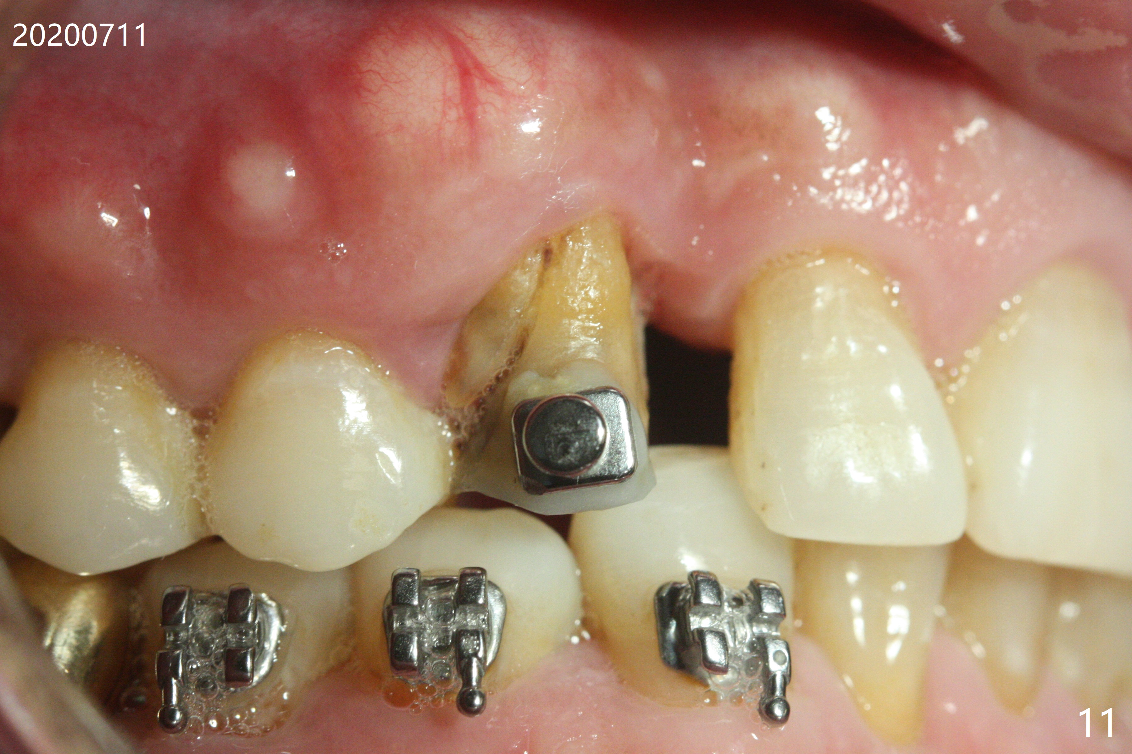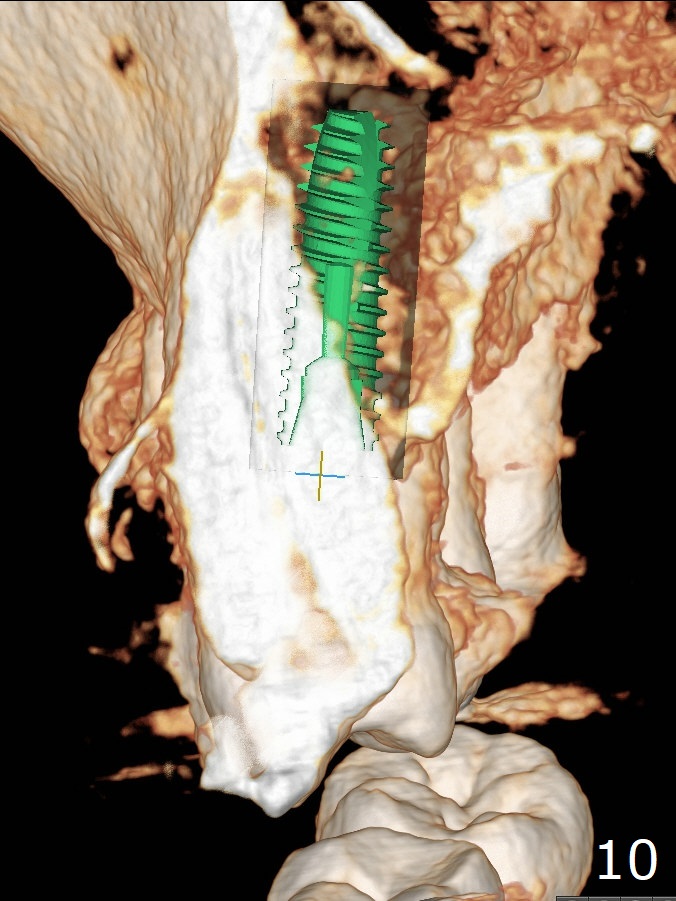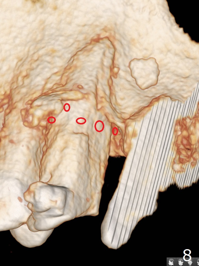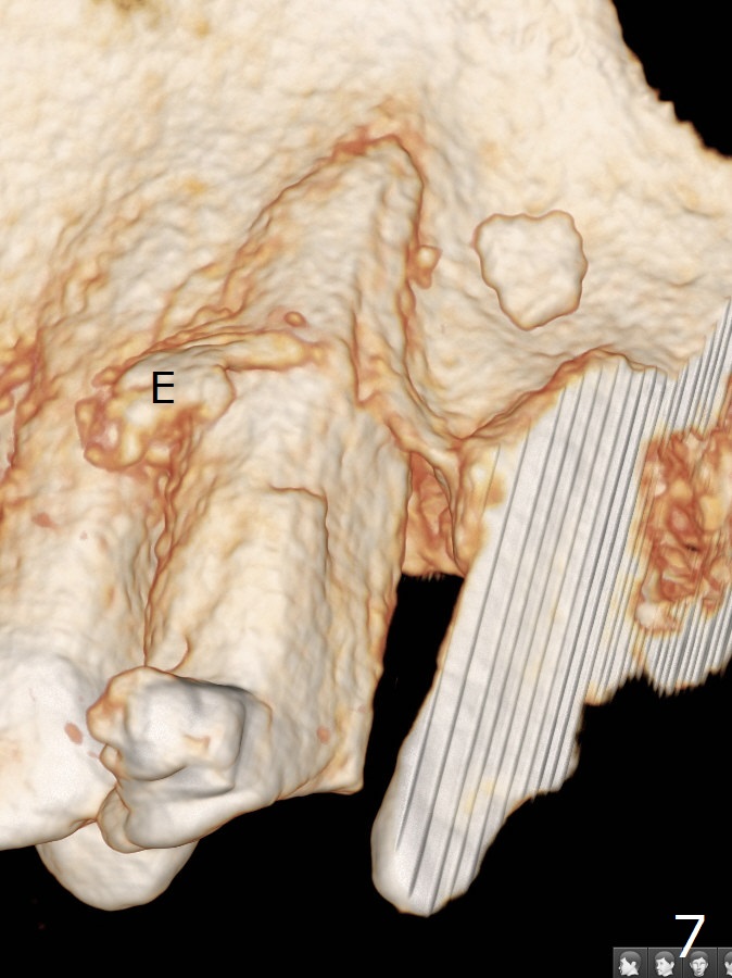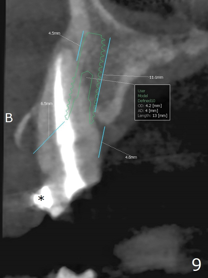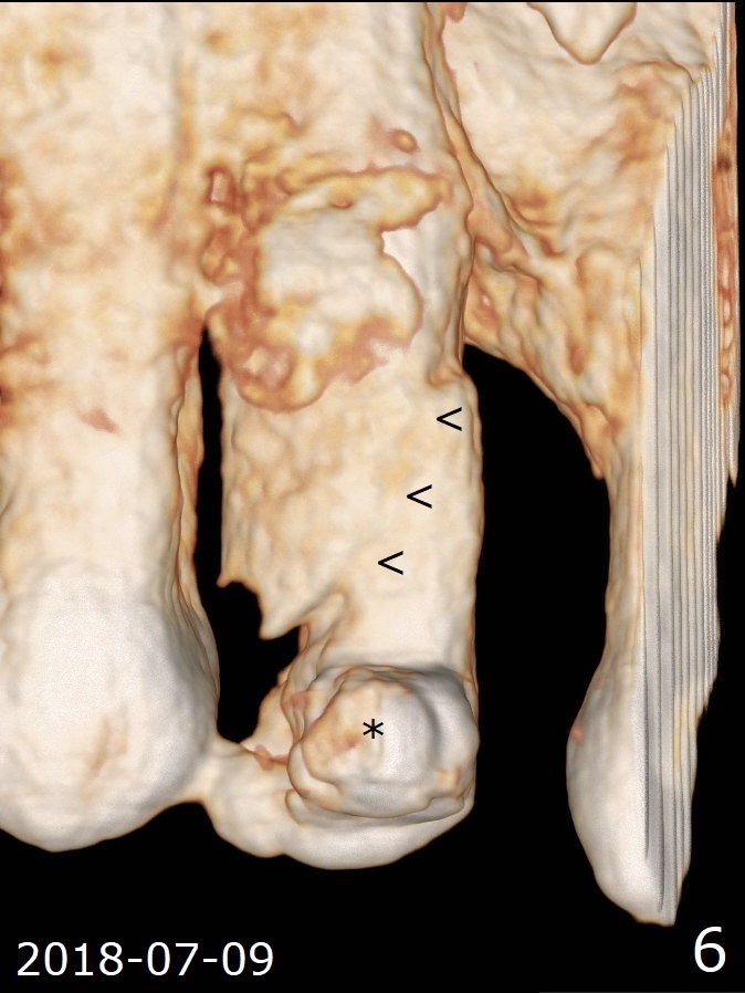 A 62-year-old man had traumatic root fracture at #6 in his teen. The tooth remained asymptomatic until his fifties. Following root canal therapy (Fig.1), the tooth is orthodontically extruded (~ 5 years, Fig.2 (*: bracket)) with apparent disappearance of the infection. The bone distal to #7 seems to increase in height (Fig.3, as compared to Fig.1) and in density (Fig.4). Bone graft could be placed for regeneration with PRF or GEM21S (Fig.5 red (between #6 and 7), pink (buccal to #7 or coronal to the fracture line) circles). With extrusion, the oblique fracture line is more than half or two third supragingival (Fig.6). In spite of severe bone loss, exostosis is present (Fig.7 (mesiobuccal view) E) so that bone graft could be placed palatal to it (Fig.8 red). In case the tooth is non-salvageable, immediate implant will be placed with guide (Fig.9,10). Move lingual button as apical as possible (Fig.12) and make occlusal clearance. Continue extrusion until all of the crack is exposed without deep pocket.