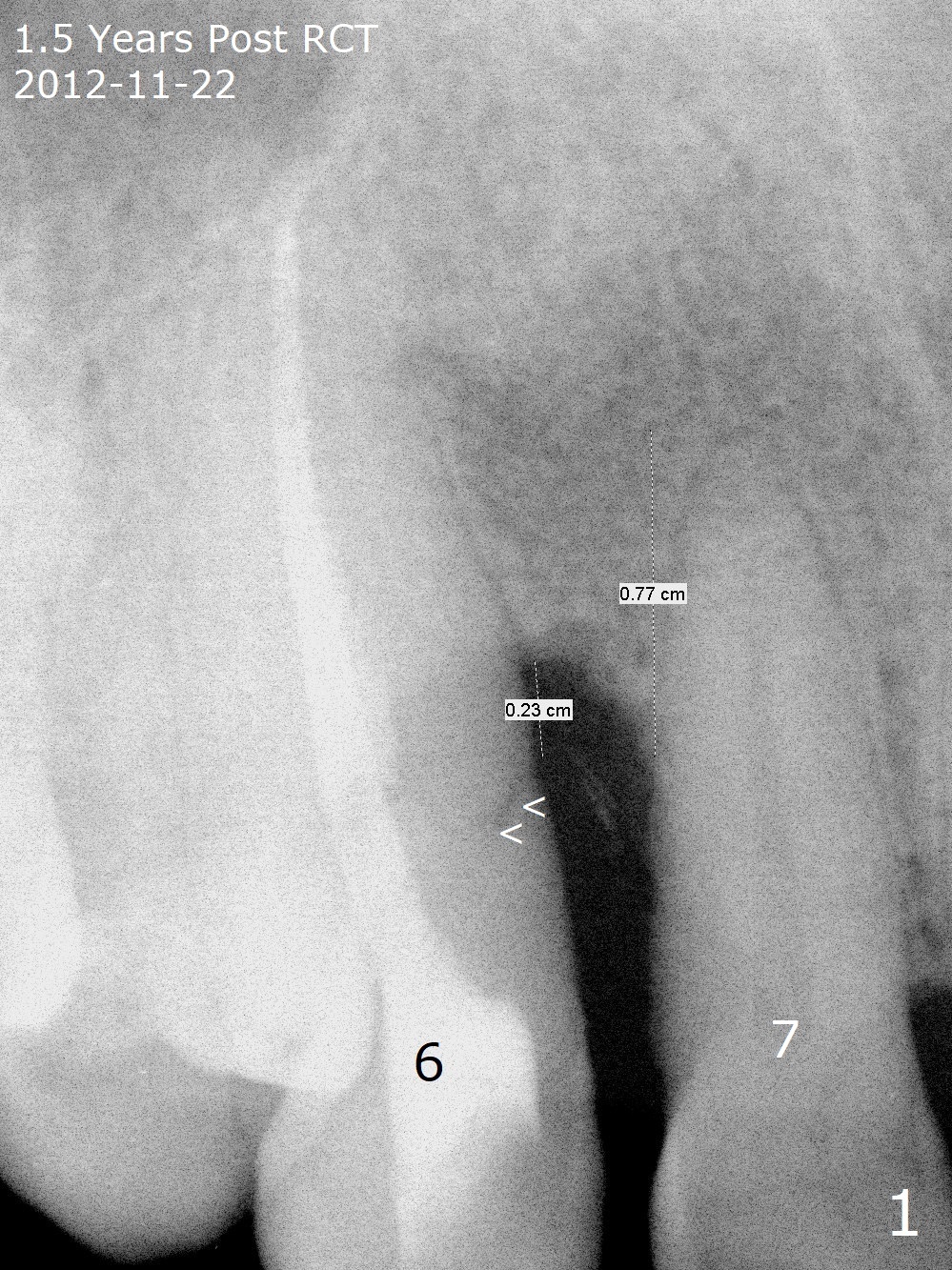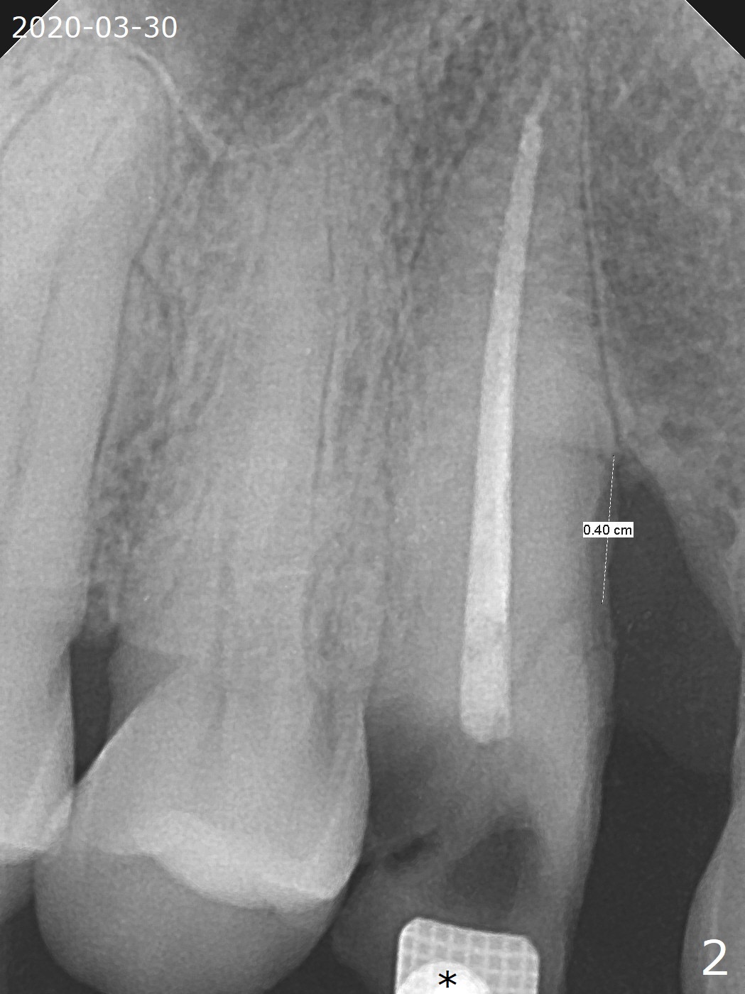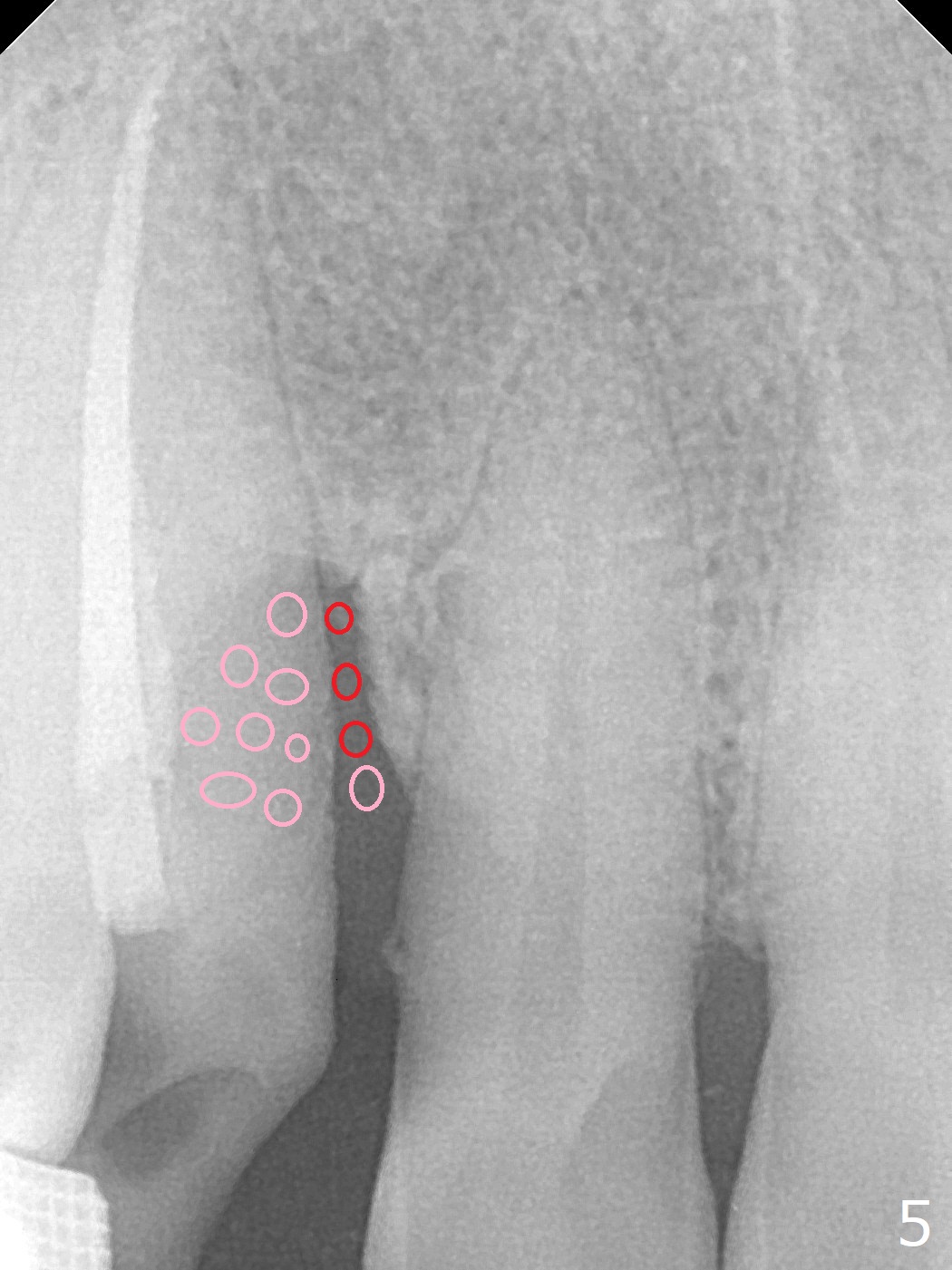 A 62-year-old man had traumatic root fracture at #6 in his teen. The tooth remained asymptomatic until his fifties. Following root canal therapy (Fig.1), the tooth is orthodontically extruded (~ 5 years, Fig.2 (*: bracket)) with apparent disappearance of the infection. The bone distal to #7 seems to increase in height (Fig.3, as compared to Fig.1) and in density (Fig.4). Bone graft could be placed for regeneration with PRF or GEM21S (Fig.5 red (between #6 and 7), pink (buccal to #7 or coronal to the fracture line) circles). With extrusion, the oblique fracture line is more than half or two third supragingival (Fig.6). In spite of severe bone loss, exostosis is present (Fig.7 (mesiobuccal view) E) so that bone graft could be placed palatal to it (Fig.8 red). In case the tooth is non-salvageable, immediate implant will be placed with guide (Fig.9,10). Move lingual button as apical as possible (Fig.12) and make occlusal clearance. Continue extrusion until all of the crack is exposed without deep pocket.