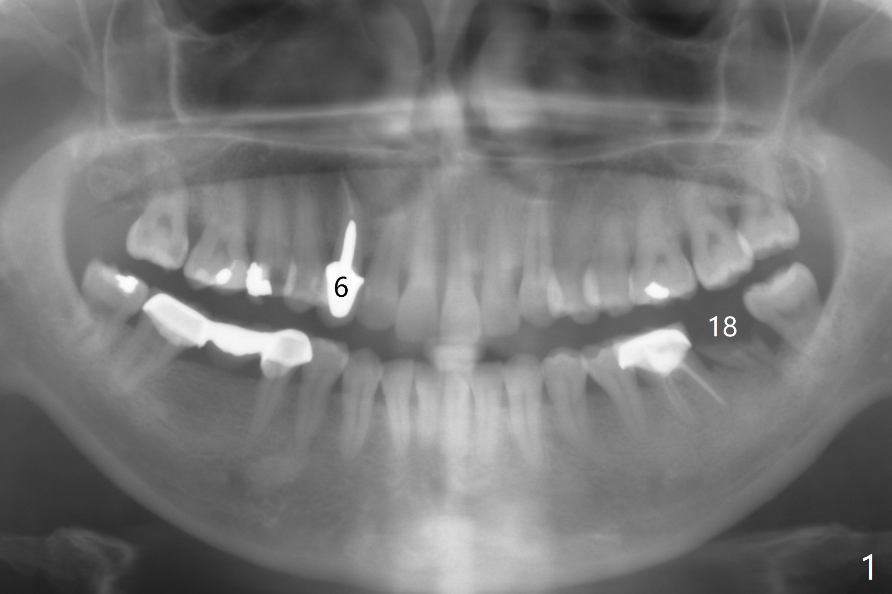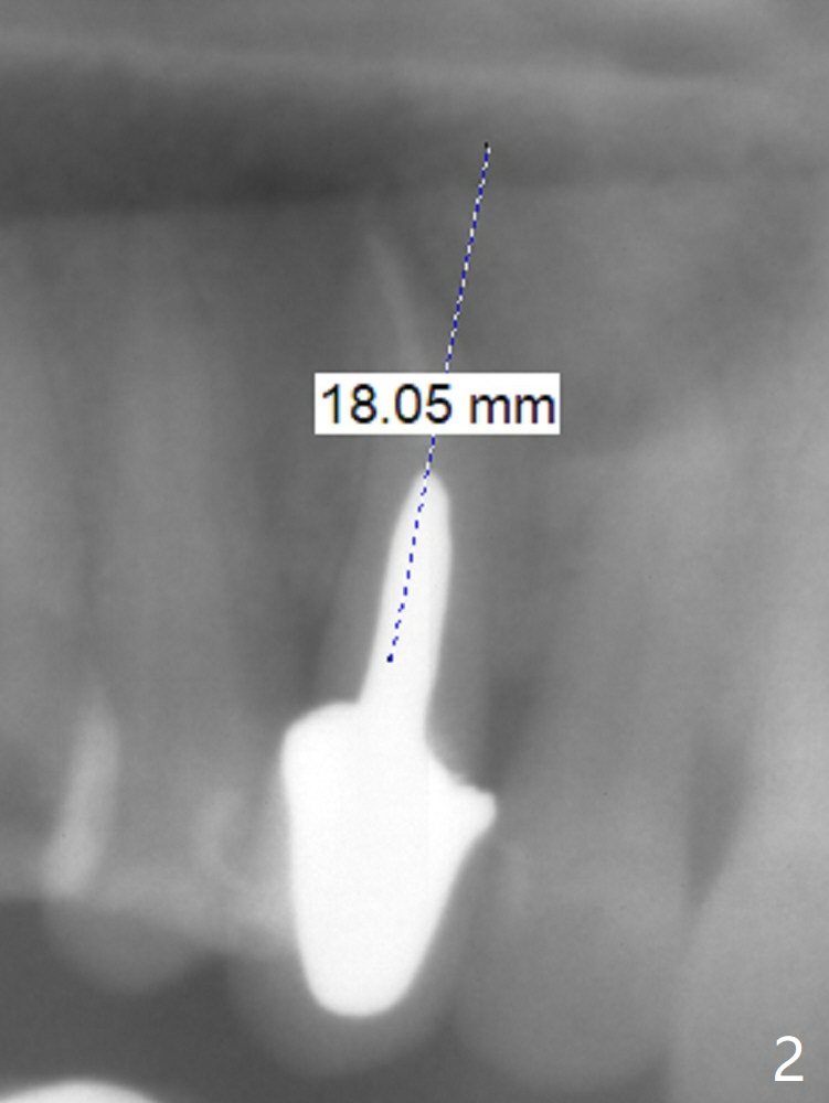 A 35-year-old woman has a loose tooth at #6, as related to the residual roots at #18 (Fig.1). Since the root curves distal, osteotomy will be initiated in the mesial slope (Fig.2) for 18 mm (gingival level). Proximity of an implant to a neighboring root may be associated with necrosis. Take PA and the final depth will be established for 18 mm (bone level) if indicated.