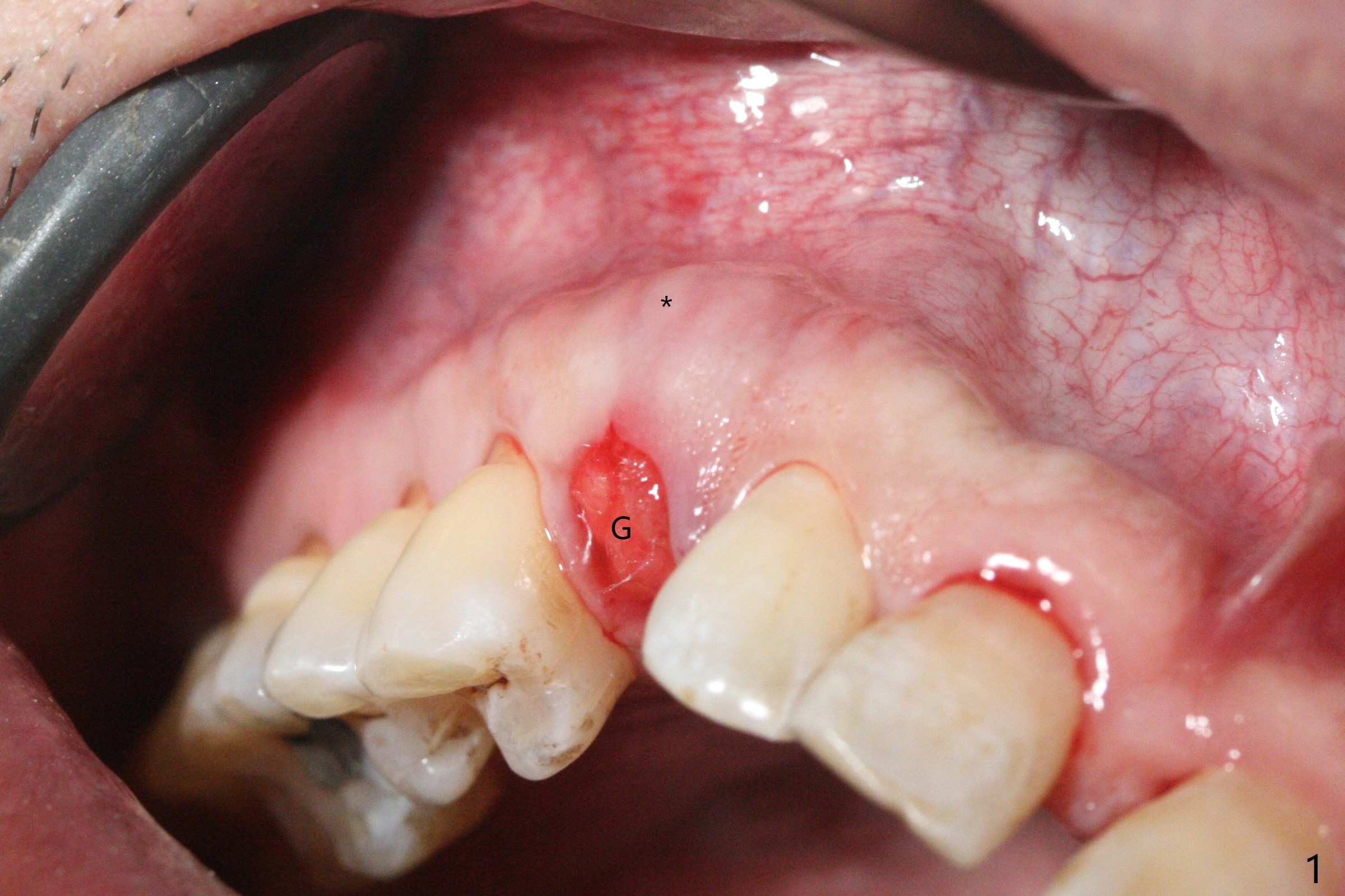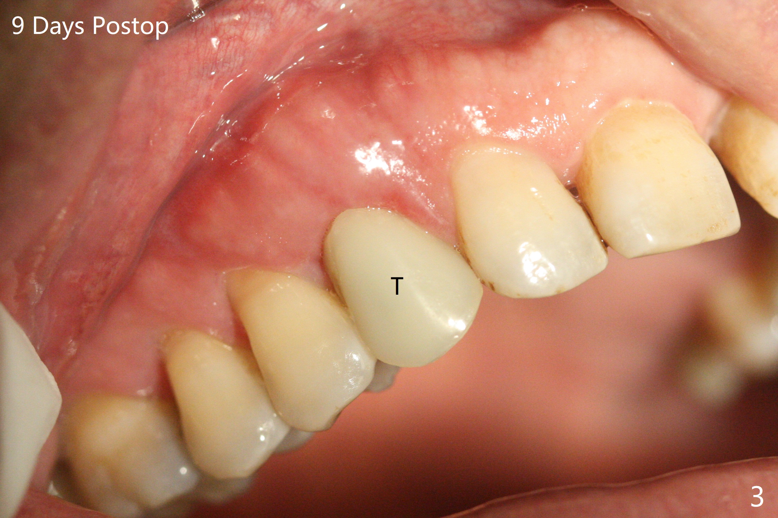右上乳尖牙拔除后,颊侧尖牙隆起仍旧明显(图一:*(牙槽窝塞入止血纱布)),希望通过导板即种和植入粘性骨粉(图二:*)以及即修,这个局部解剖结构能保留下来。至少术后9天是这样(图三,T: 临时牙冠)。Return to Protect Graft Xin Wei, DDS, PhD, MS 1st edition 05/27/2021, last revision 06/05/2021