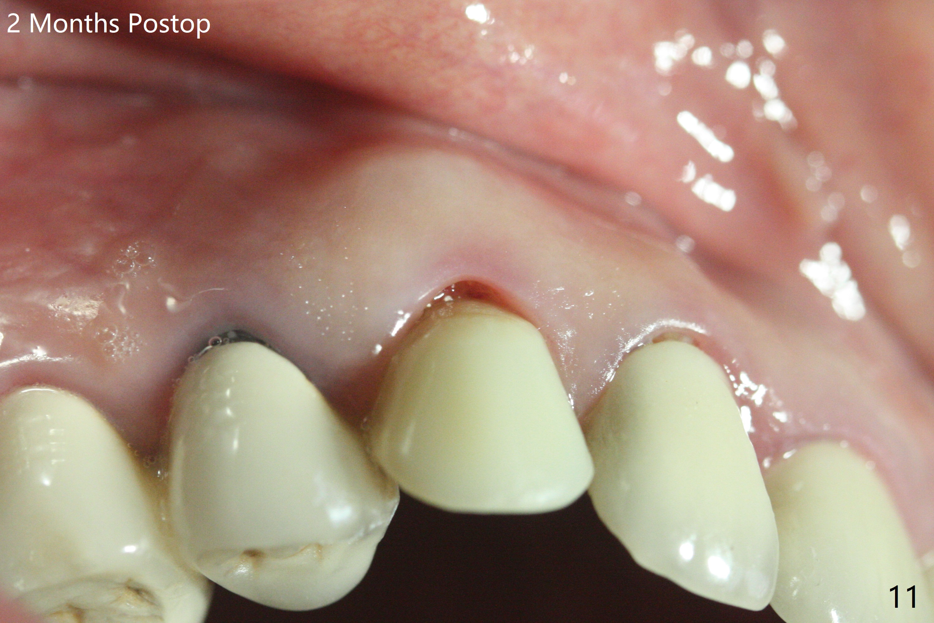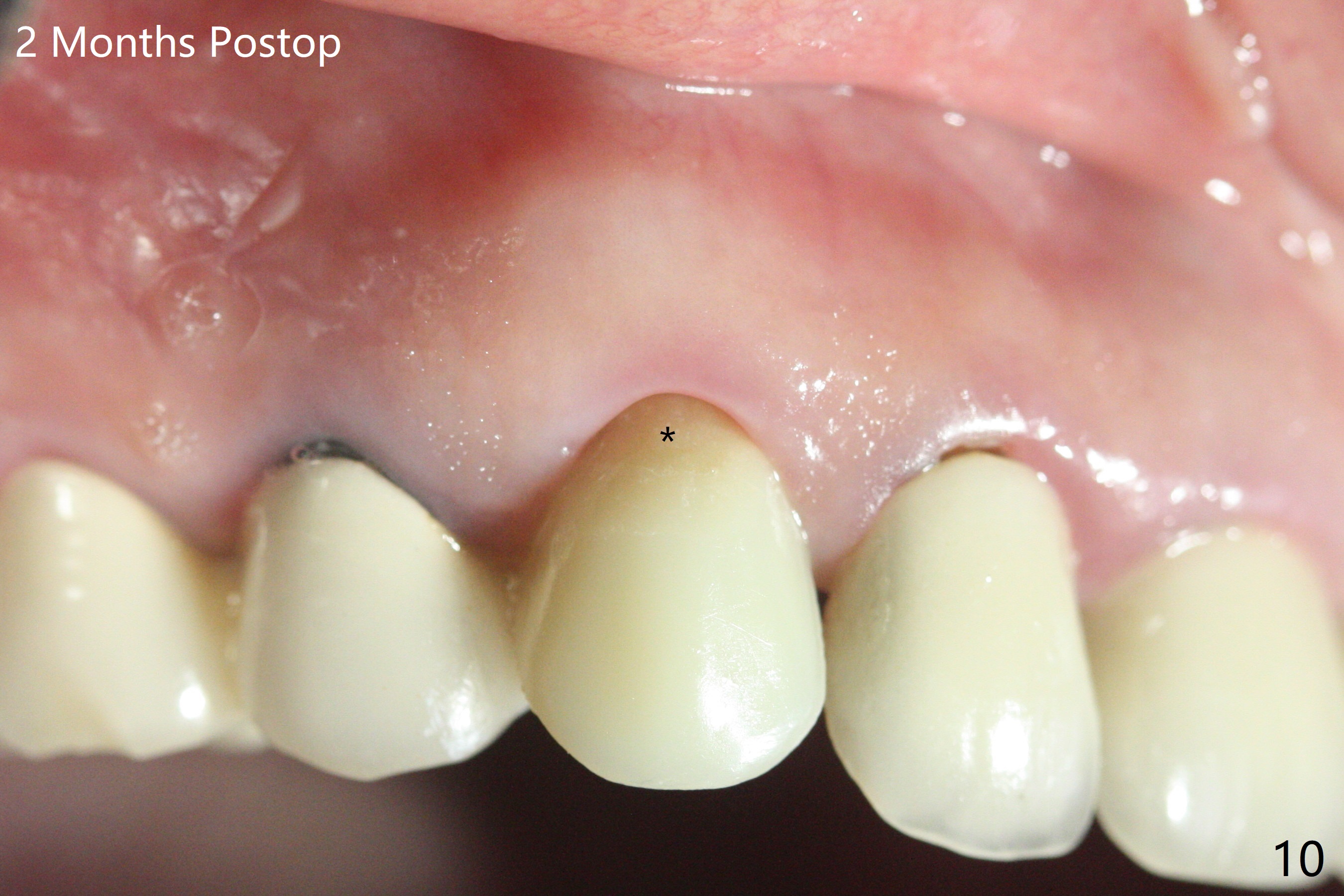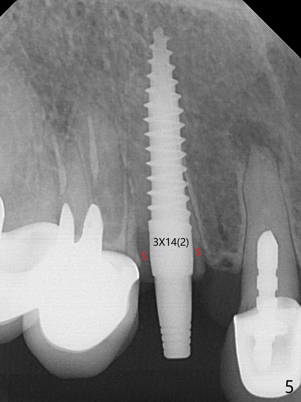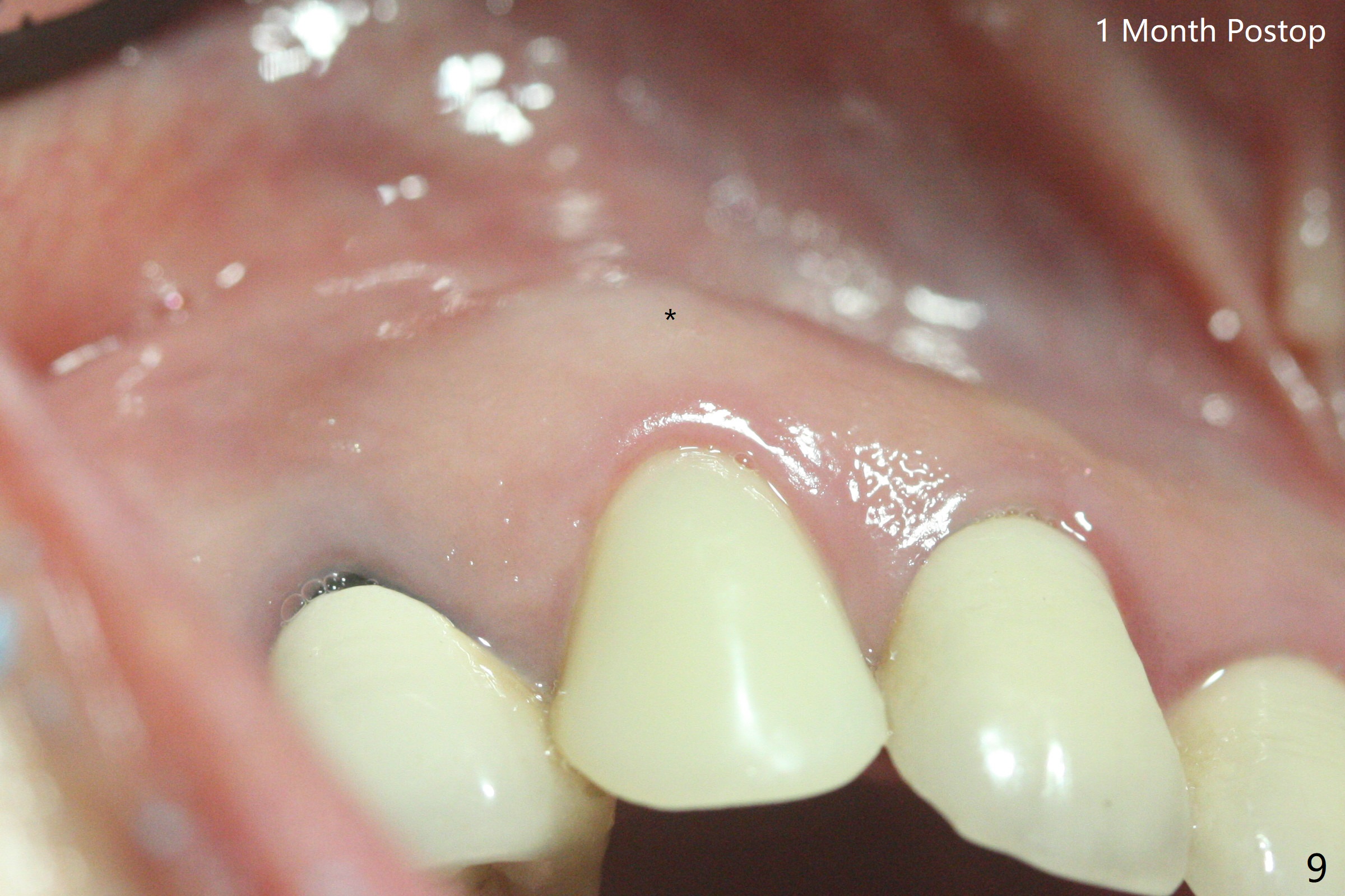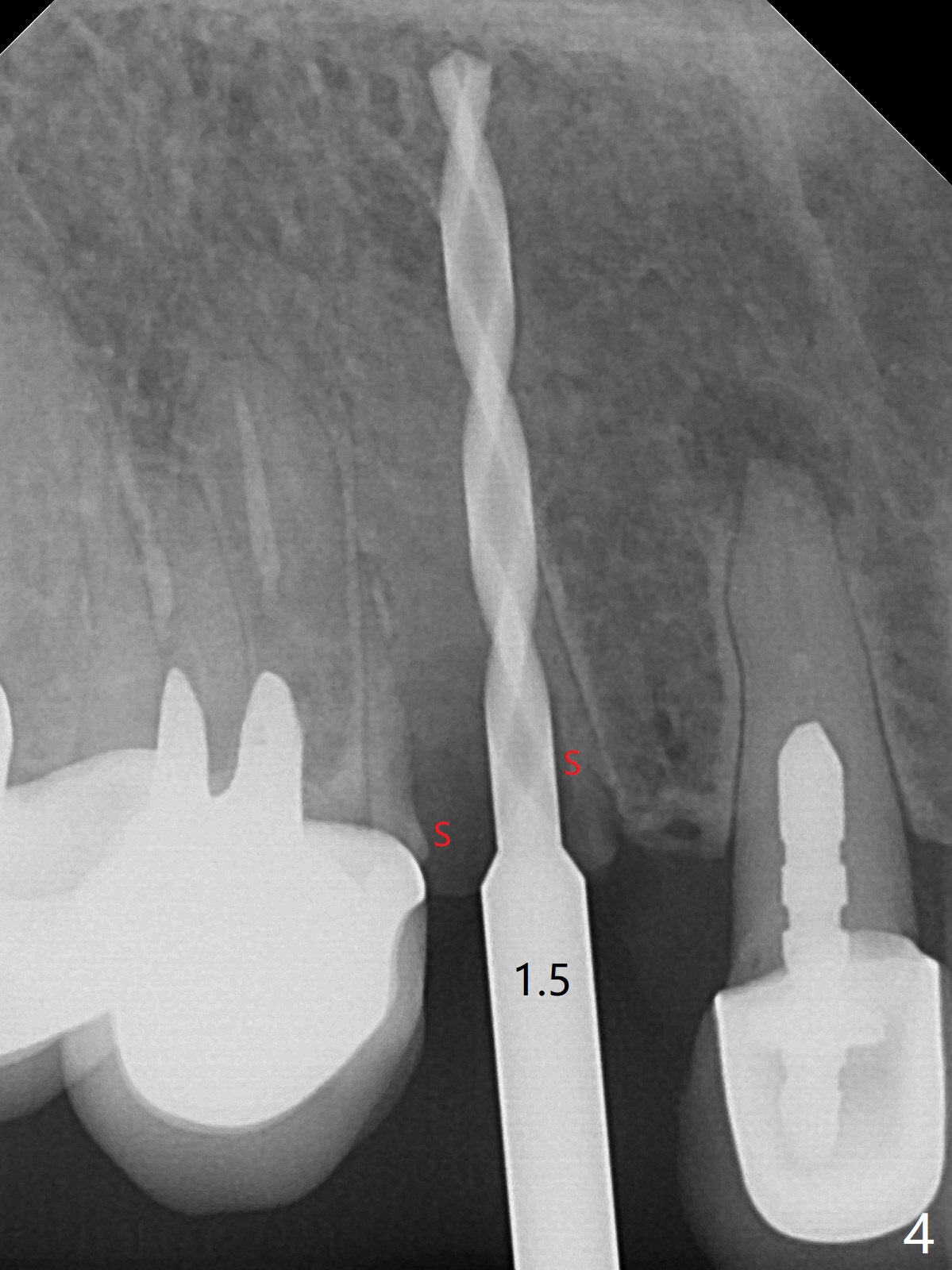 防止拔牙后颊侧骨板萎缩最有效方法是保留部分牙根,例如颊侧(外形象盾牌,简称盾,socket shield (S)),但是制备特别麻烦,尤其是上尖牙。60岁女右上3颊侧骨板隆起(图一至三:*),但是相当狭窄(上下方向),预计强行拔除,势必损失颊侧骨板,造成颊侧塌陷,准备保留盾,如图三红虚线,图六(术后3D长轴断面(十字架:植体))S代表。其实术中试图将整个牙根一起拔除,但是仿佛不行,只好静下心来分根,制备盾,不过困难重重,尤其是除去根尖(防止残余感染),最长外科裂钻似乎达不到根尖,取出后者,颊侧根尖骨板穿孔(图七:箭头)。然后腭侧钻洞(图四),当最后一个钻头保持原位时,在颊侧根尖穿孔处植入粘性骨粉(从牙槽窝口进入,原本粘性骨粉为了修复大面积颊侧缺损用(万一需要强行拔除)),然后才把一段式植体植入(图五),在其余空间填入骨粉,稍微制备基台,制作临时牙冠,最后在牙槽窝开口塞入PRF膜,衬里牙冠,不暂时取出牙冠,衬里相当于临时粘固剂。术后一个月牙根片段和临时牙冠维持良好的牙龈外形(图八,九);术后两个月病人嫌尖牙龈端太尖太长,临时牙冠龈端调整(图十,十一),但愿一个月后龈缘合乎病人期望。