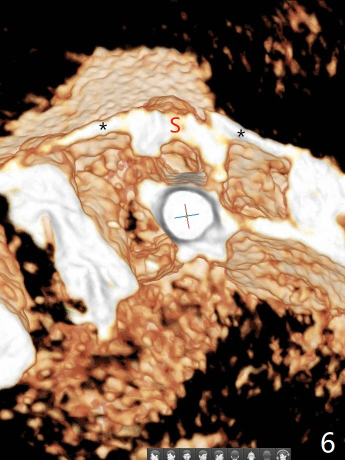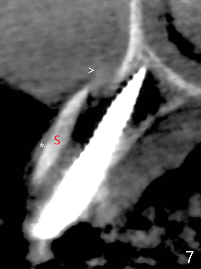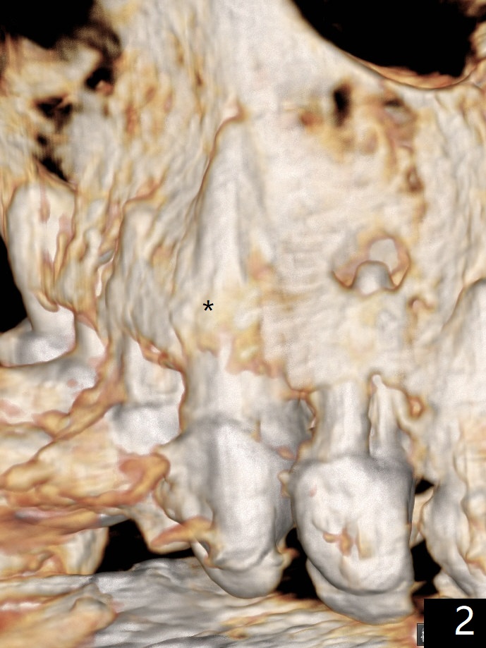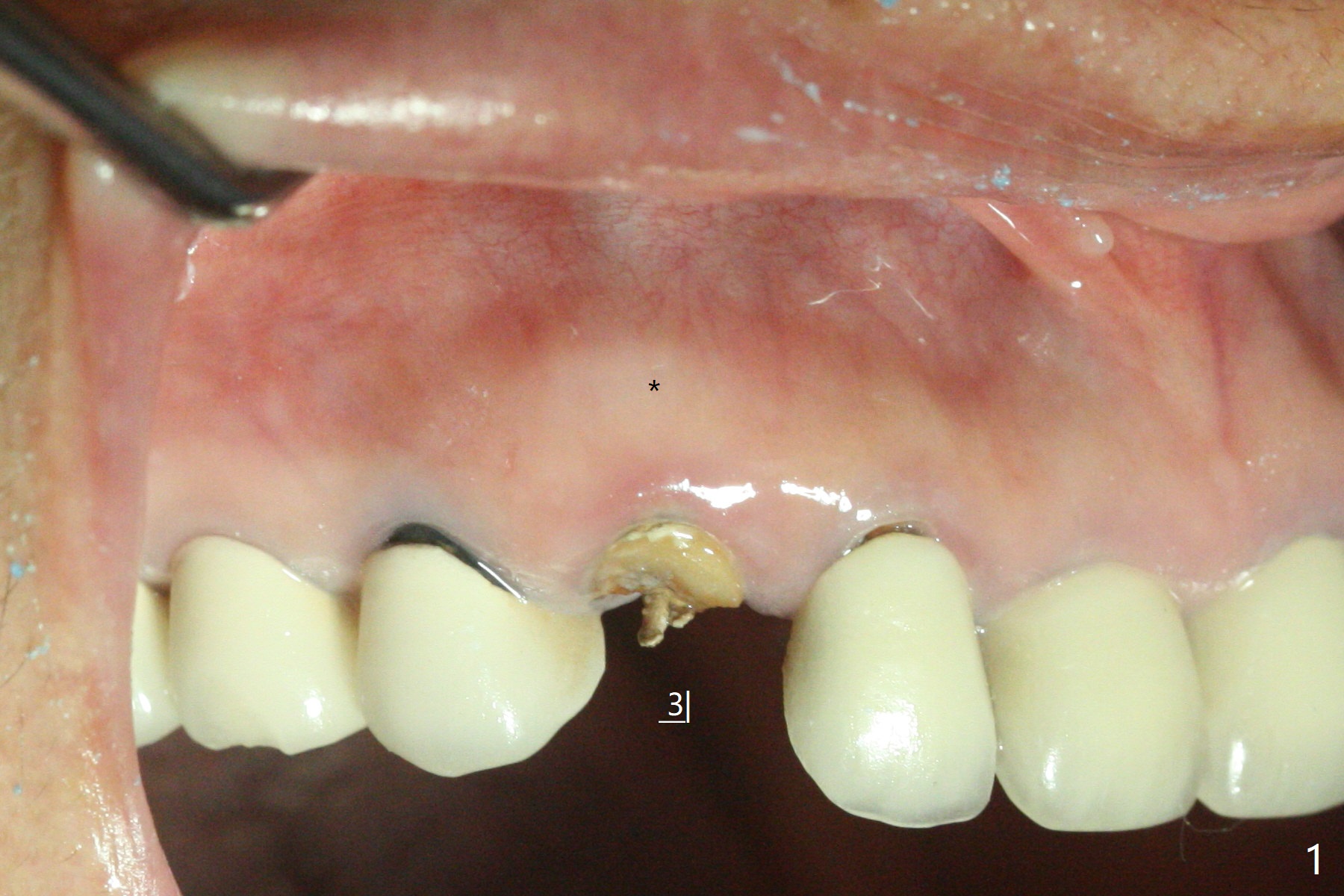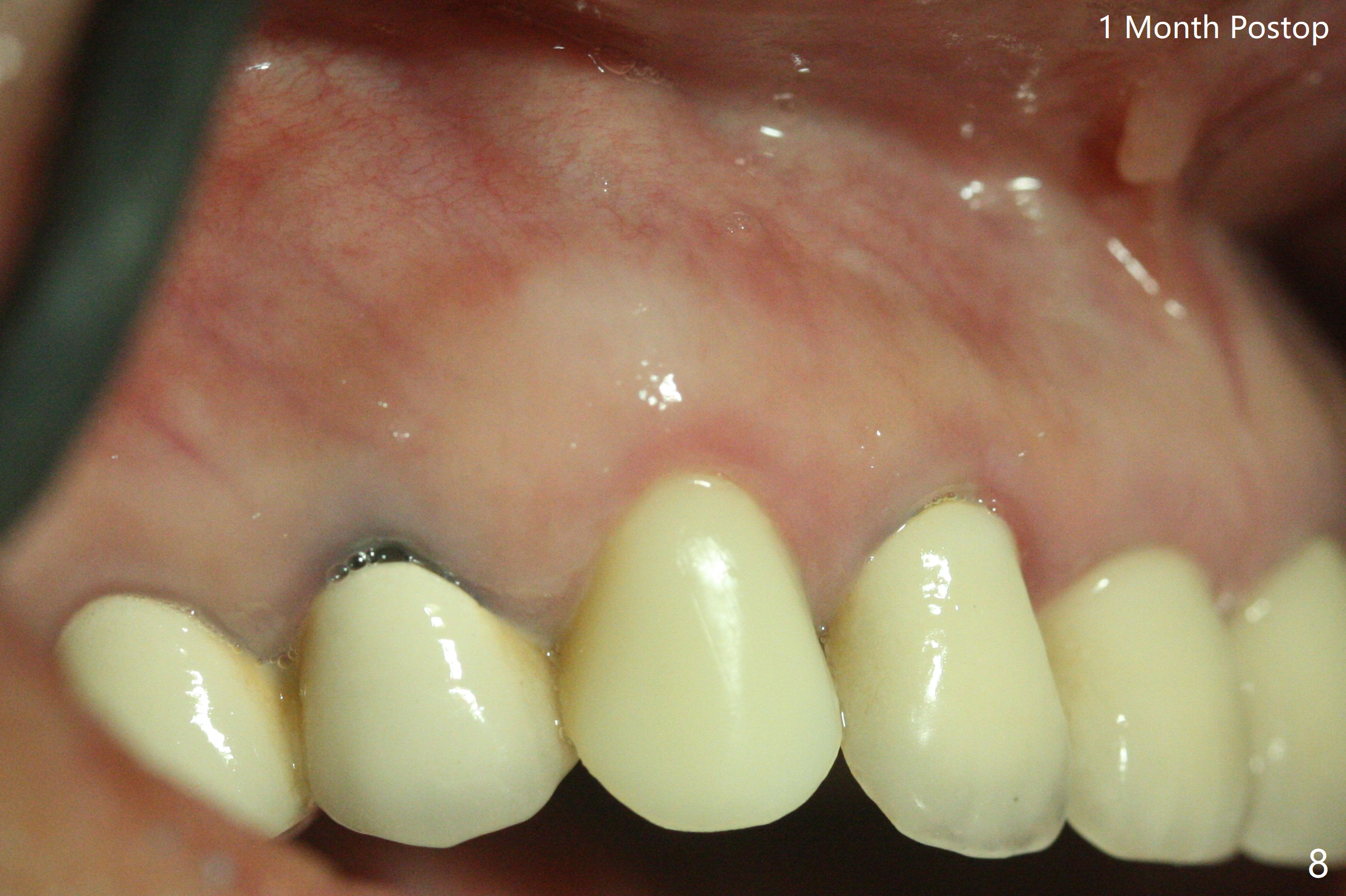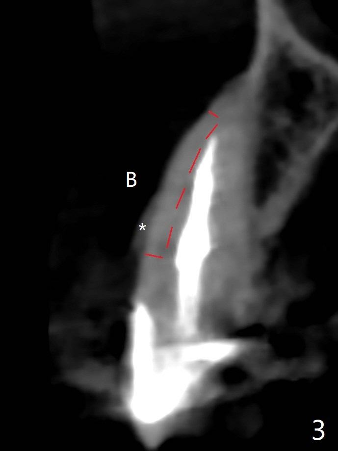 防止拔牙后颊侧骨板萎缩最有效方法是保留部分牙根,例如颊侧(外形象盾牌,简称盾,socket shield (S)),但是制备特别麻烦,尤其是上尖牙。60岁女右上3颊侧骨板隆起(图一至三:*),但是相当狭窄(上下方向),预计强行拔除,势必损失颊侧骨板,造成颊侧塌陷,准备保留盾,如图三红虚线,图六(术后3D长轴断面(十字架:植体))S代表。其实术中试图将整个牙根一起拔除,但是仿佛不行,只好静下心来分根,制备盾,不过困难重重,尤其是除去根尖(防止残余感染),最长外科裂钻似乎达不到根尖,取出后者,颊侧根尖骨板穿孔(图七:箭头)。然后腭侧钻洞(图四),当最后一个钻头保持原位时,在颊侧根尖穿孔处植入粘性骨粉(从牙槽窝口进入,原本粘性骨粉为了修复大面积颊侧缺损用(万一需要强行拔除)),然后才把一段式植体植入(图五),在其余空间填入骨粉,稍微制备基台,制作临时牙冠,最后在牙槽窝开口塞入PRF膜,衬里牙冠,不暂时取出牙冠,衬里相当于临时粘固剂。术后一个月牙根片段和临时牙冠维持良好的牙龈外形(图八,九);术后两个月病人嫌尖牙龈端太尖太长,临时牙冠龈端调整(图十,十一),但愿一个月后龈缘合乎病人期望。