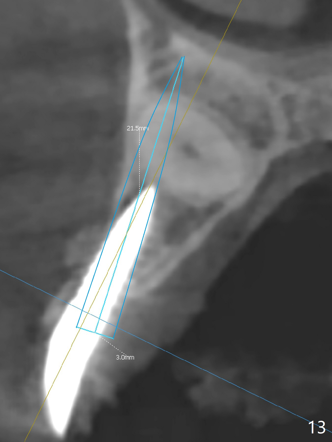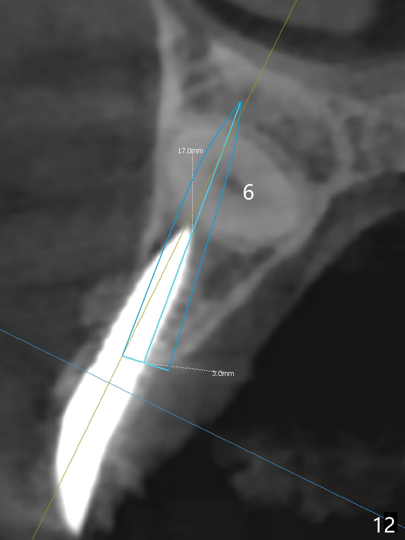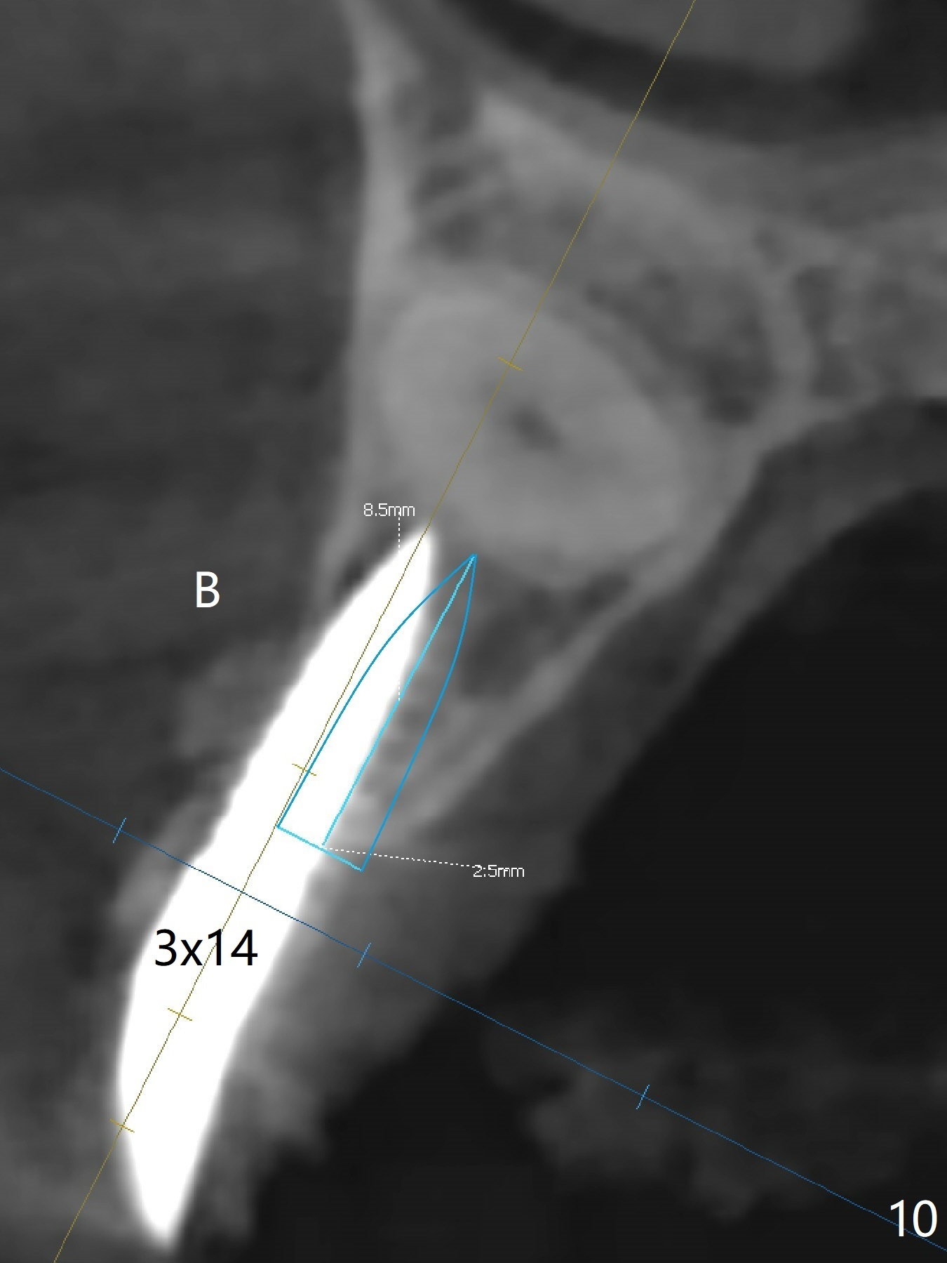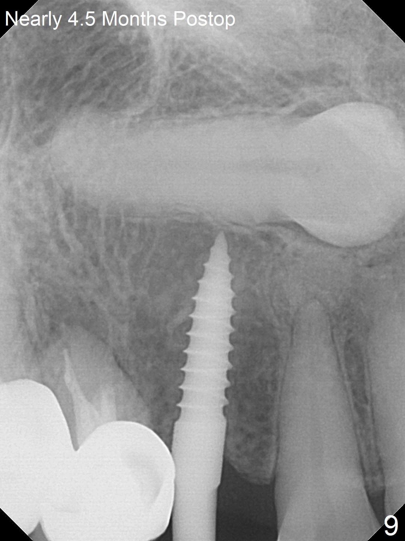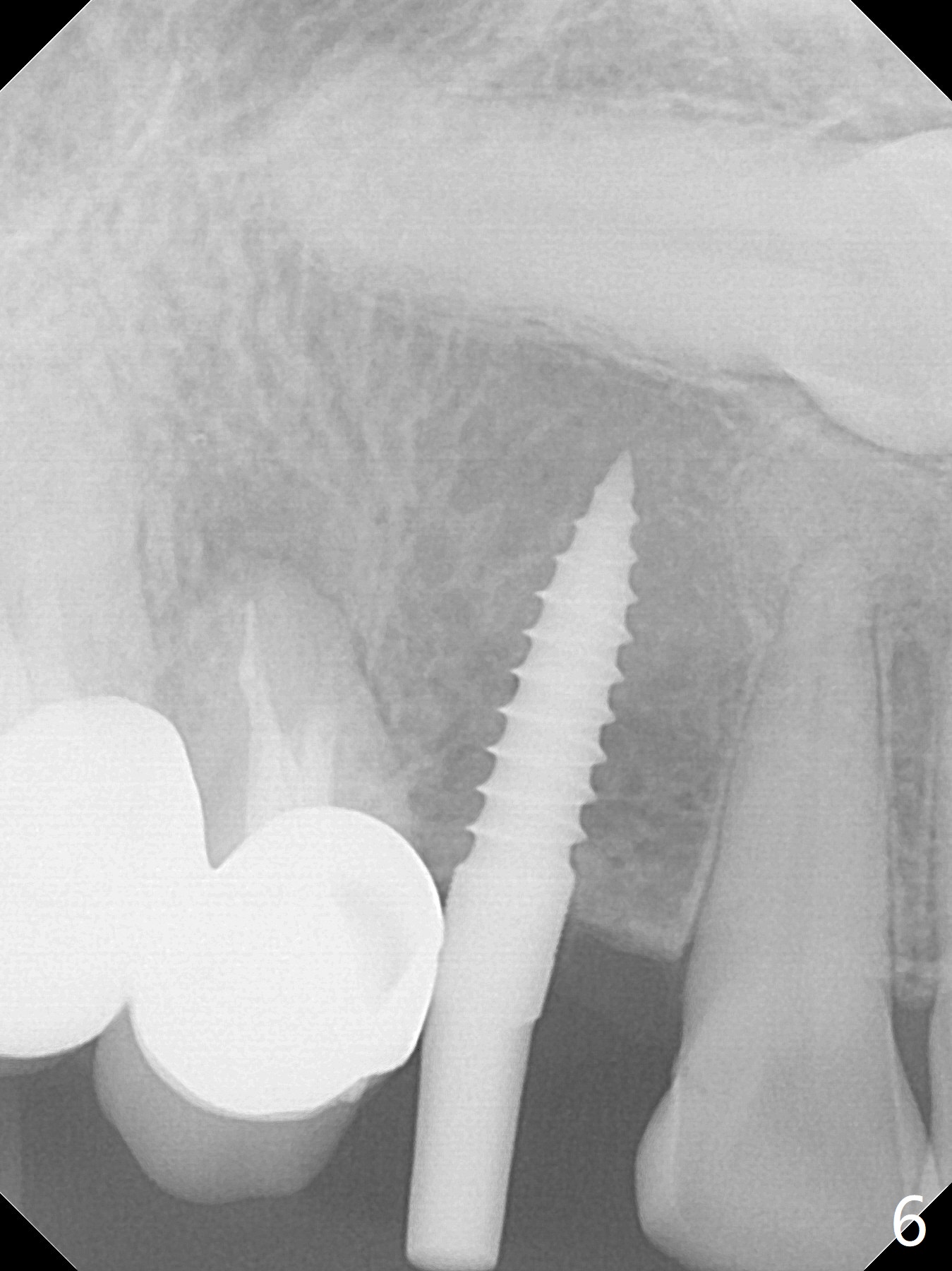 With 4-5 month healing, an implant should be placed as palatal as possible. The crest is ambiguous (compare Fig.10,11), the length of the implant being different. If the patient agrees with #6 extraction, stability will be more secure (Fig.12,13). Take 5x5 CT preop to solve the ambiguous crestal level issue.
