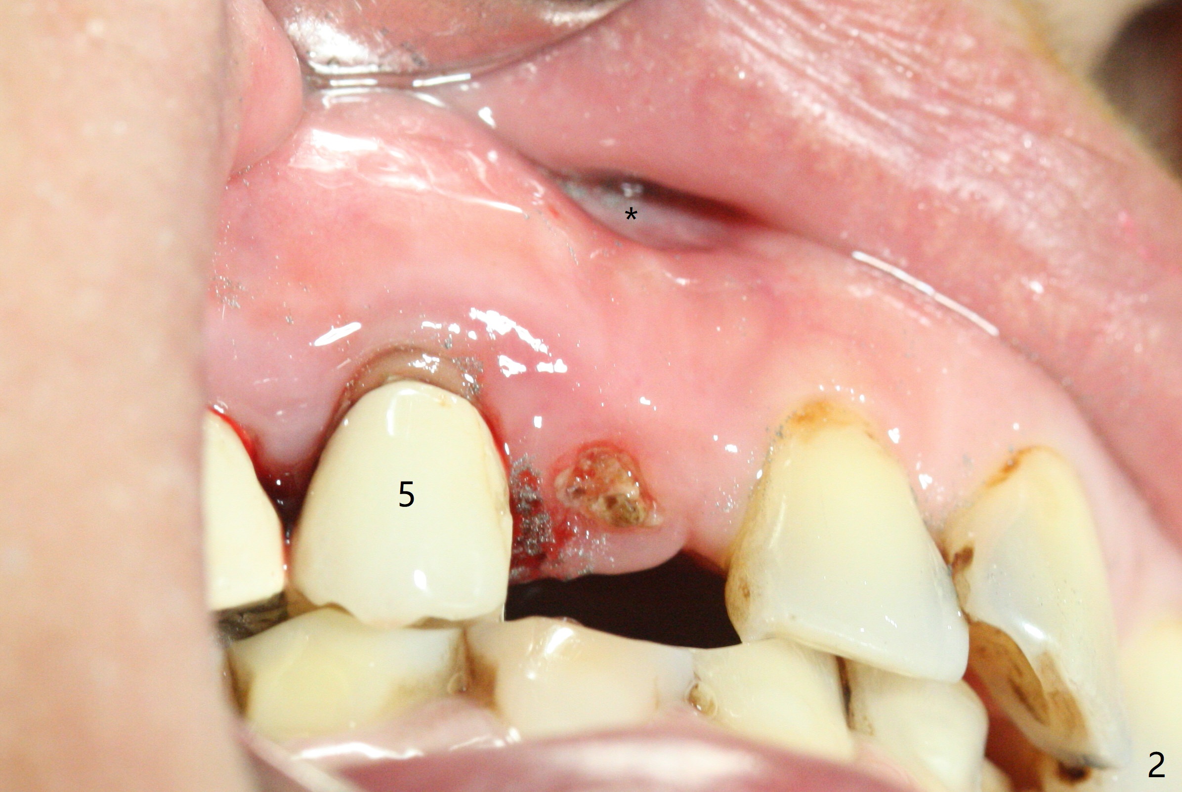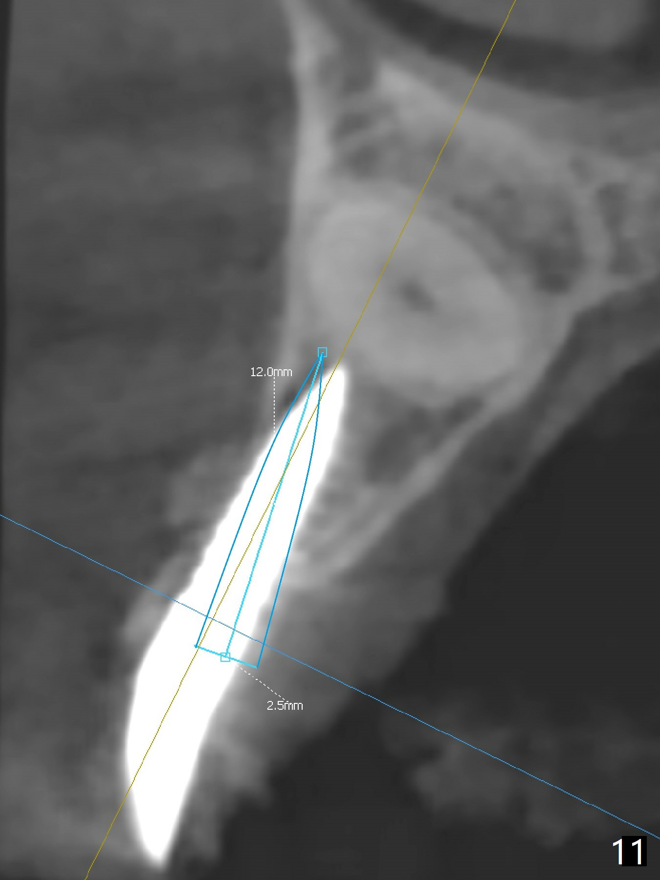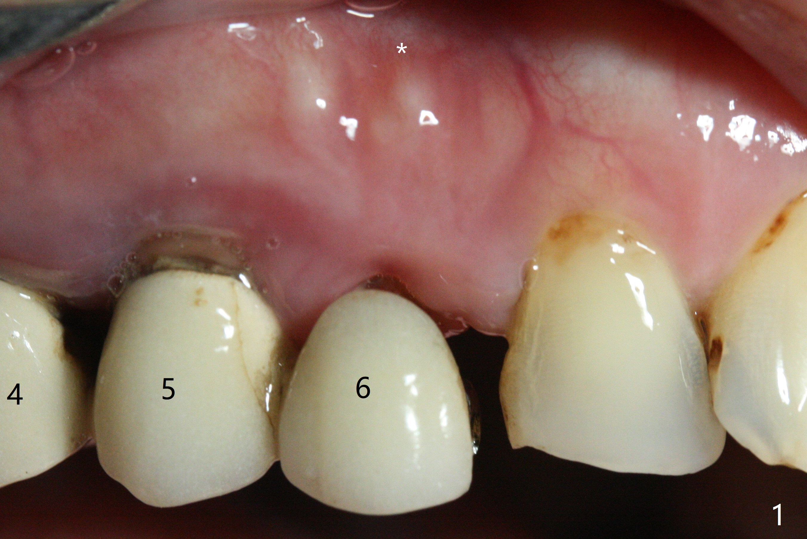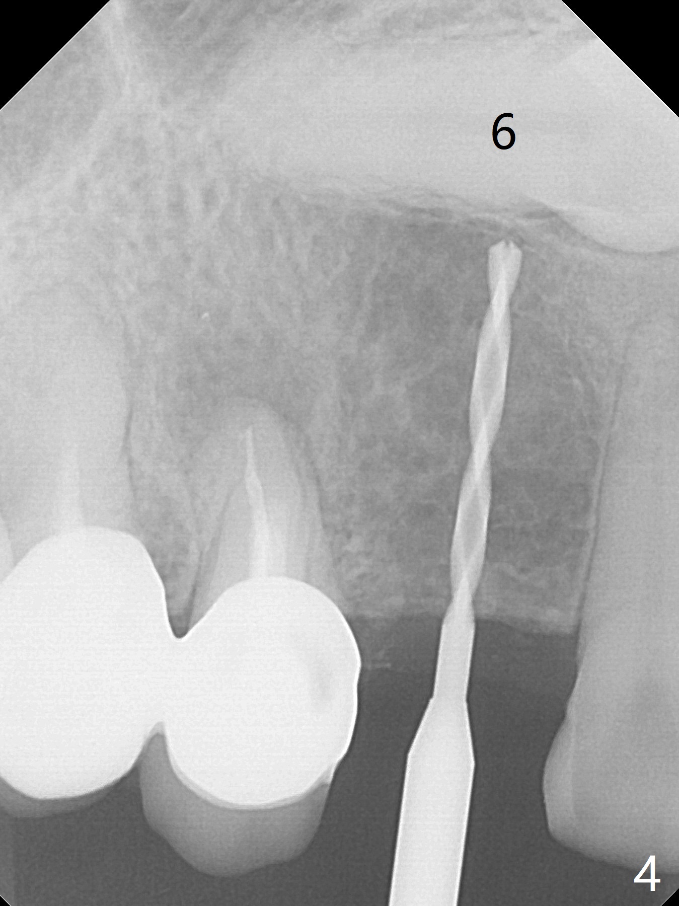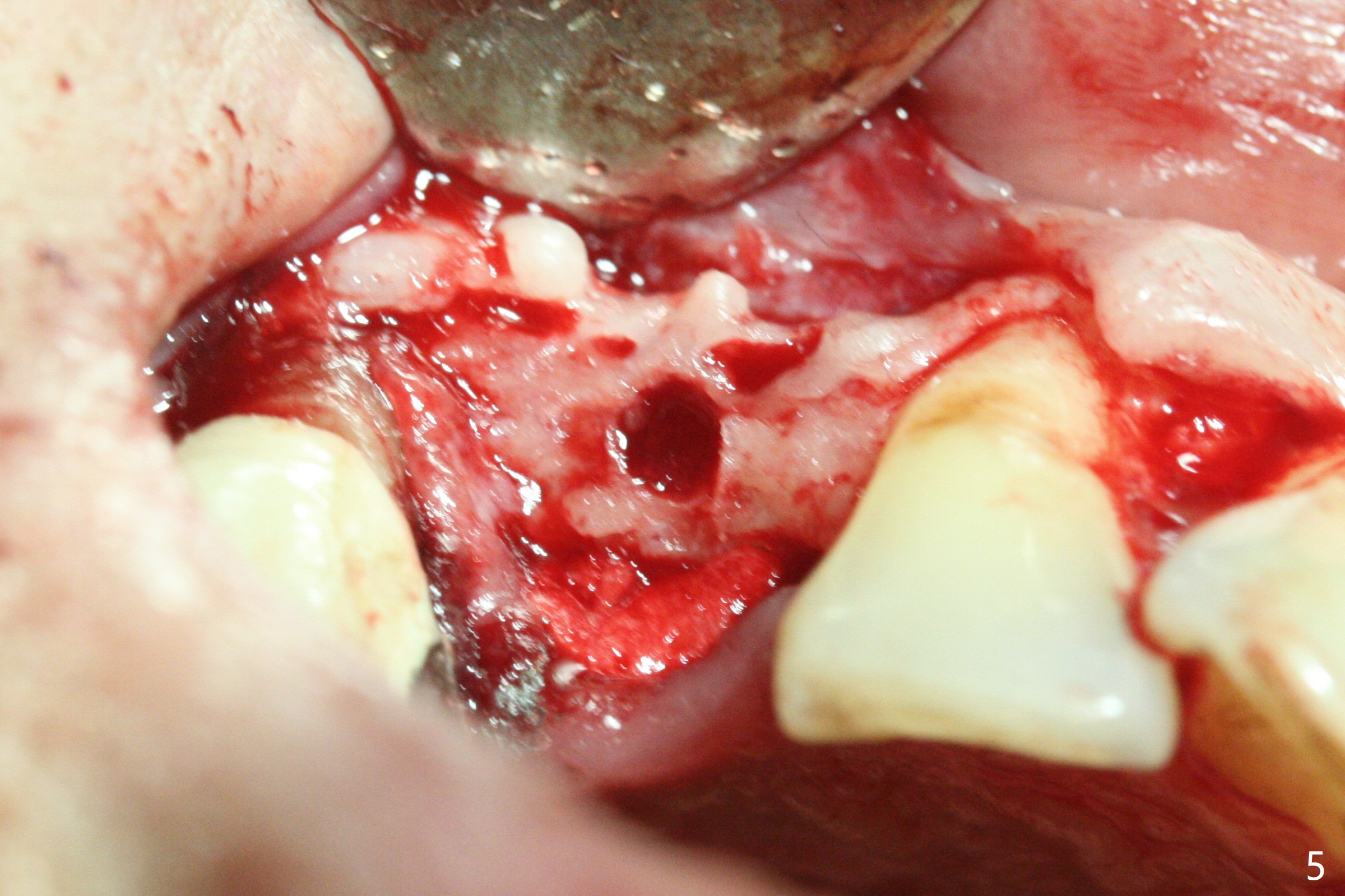 With 4-5 month healing, an implant should be placed as palatal as possible. The crest is ambiguous (compare Fig.10,11), the length of the implant being different. If the patient agrees with #6 extraction, stability will be more secure (Fig.12,13). Take 5x5 CT preop to solve the ambiguous crestal level issue.