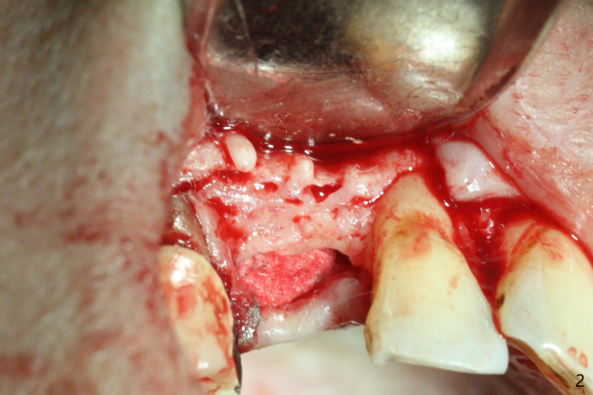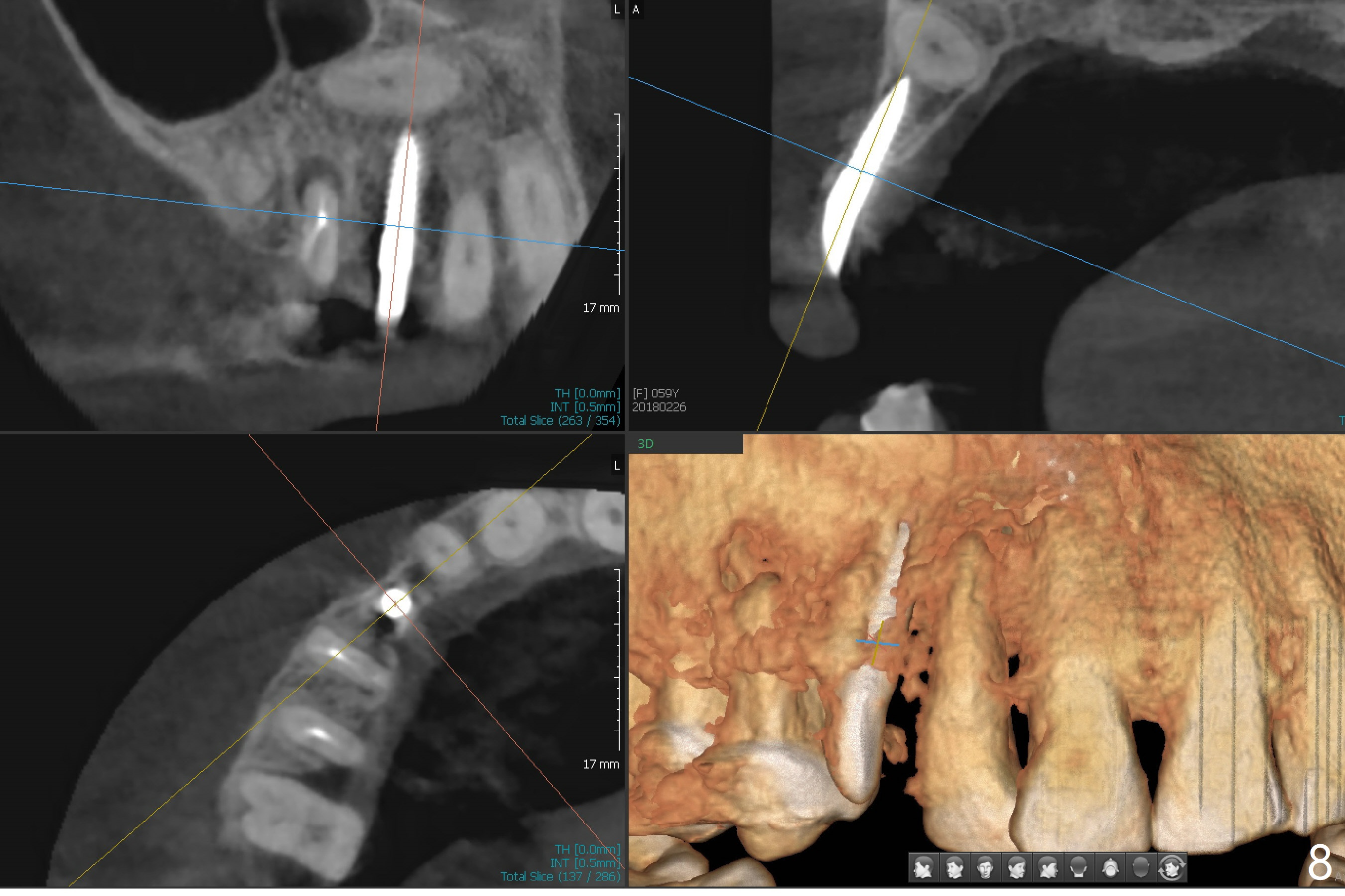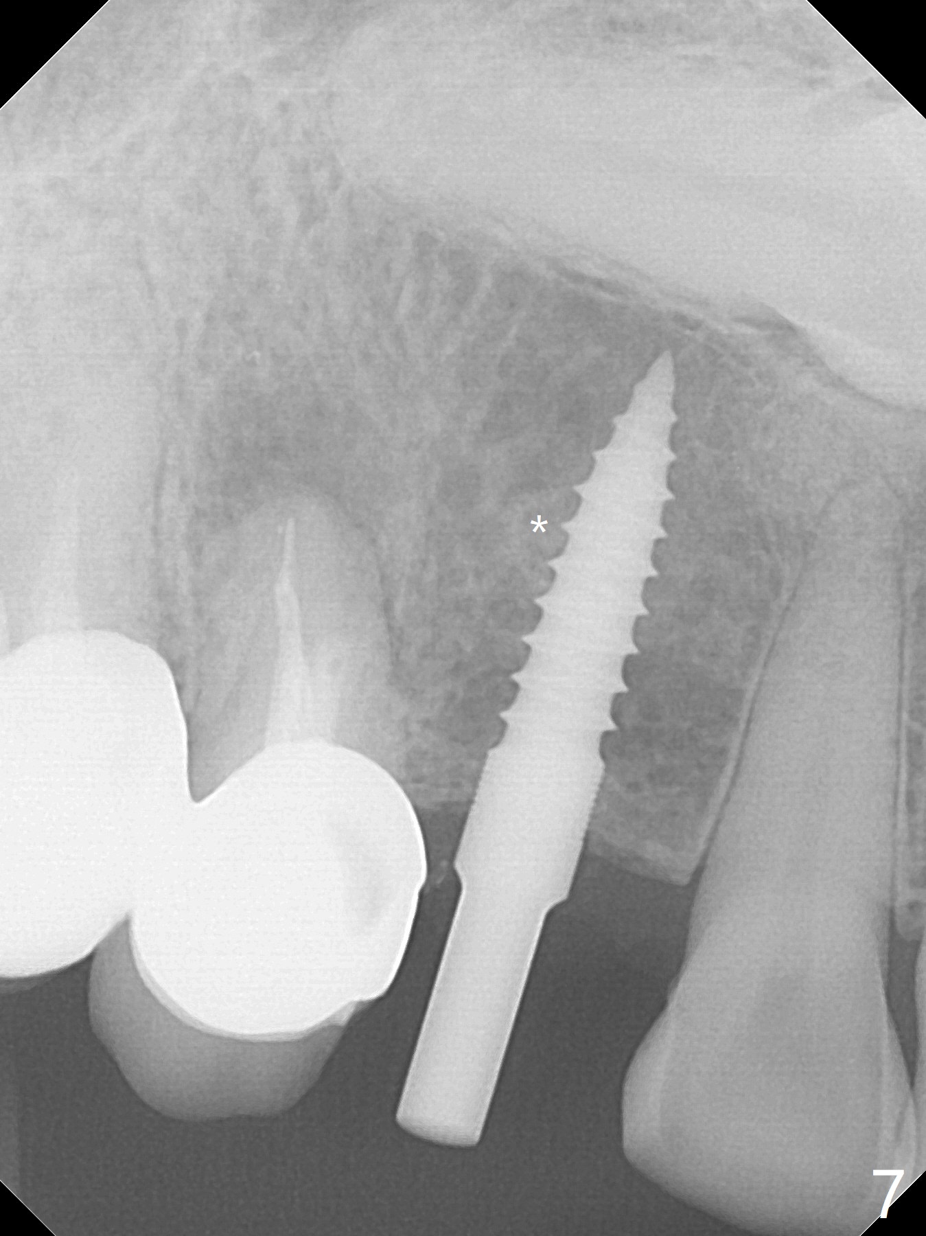 After removal the pontic of a cantilever FPD (Fig.1), a residual root is found at #6 with the buccal concavity (Fig.2 *). The ridge is narrow with flap elevation (Fig.3). PA taken with a 1.2 mm drill for 14 mm shows a horizontally impacted canine (Fig.4: #6). When the osteotomy is finished without apparently buccal perforation (Fig.5), the trajectory is buccal. When a 3x14 mm (12.5 mm in bone) 15 degree angled 1-piece implant is placed with normal trajectory (Fig.6), the buccal plate is perforated. As the implant is redirected so that the apical end of the implant does not stick out buccally, the trajectory returns buccal (Fig.7). The buccal aspect of the abutment is heavily reduced for an immediate provisional. The perforation is repaired with Vanilla Graft and Collagen Dressing before suturing. CT should have been taken preoperatively; the osteotomy should have been initiated as palatal as possible, as compared to that in Fig.5. When the 1st drill is used. it should be checked for restoration. An angled abutment does not help the trajectory substantially. The implant is loose 1.5 months (partially due to mastication); after retightening, CT is taken (Fig.8). The implant is within the bone. If the implant becomes loose again, extract the impacted canine and place the longest implant (22 mm) palatally. The implant is stable nearly 4.5 months postop (Fig.9). The patient is not satisfied with buccally-placed crown. The implant is removed with bone graft 6 months postop.