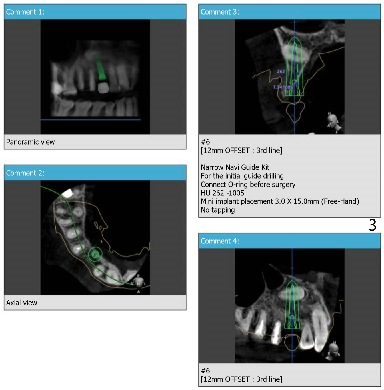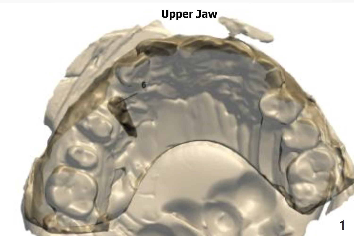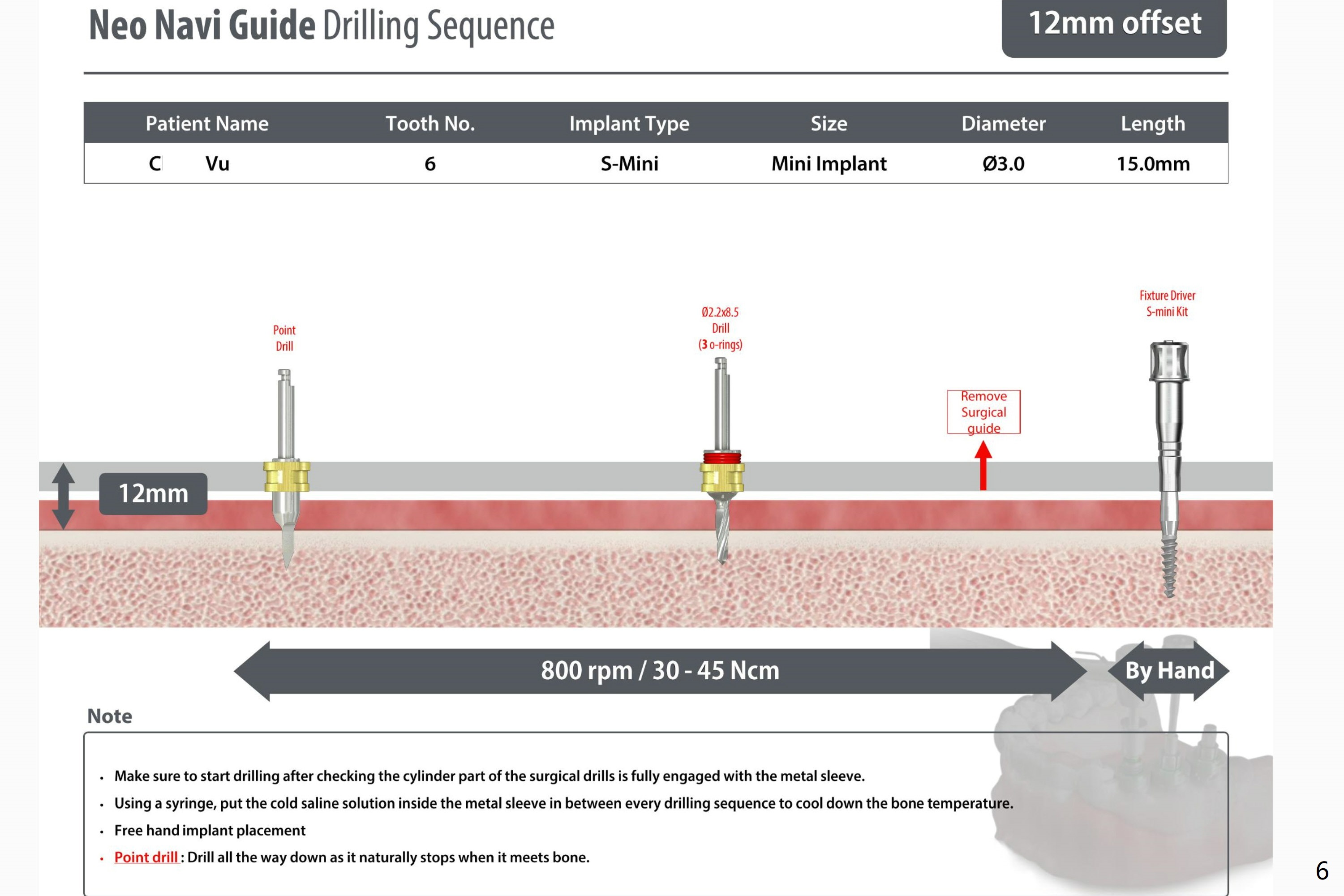 Because of the narrow ridge and short bone, try in the guide, anesthetize (double anesthetics), start initial osteotomy with the guide and lay flaps for #6 impacted tooth removal. Use IS mini implant kit to finish the osteotomy free hand, hopefully entering the upper border of the extraction socket for 2-pointed fixation. Find the surgical stent for possible new temporary FPD.