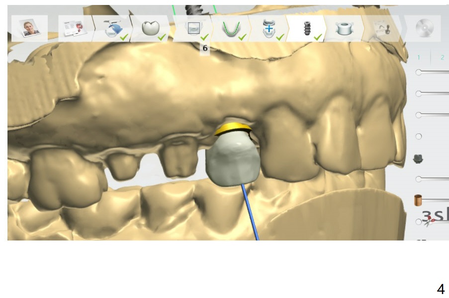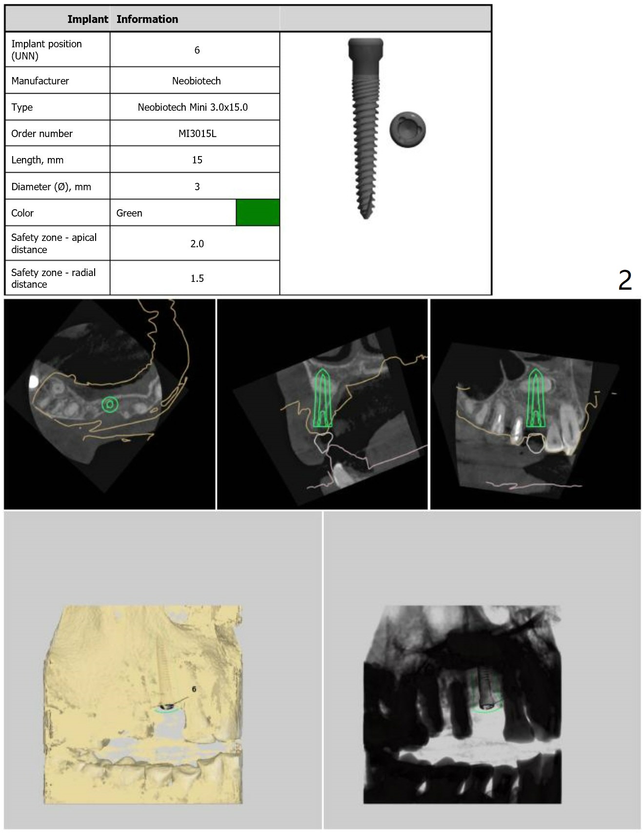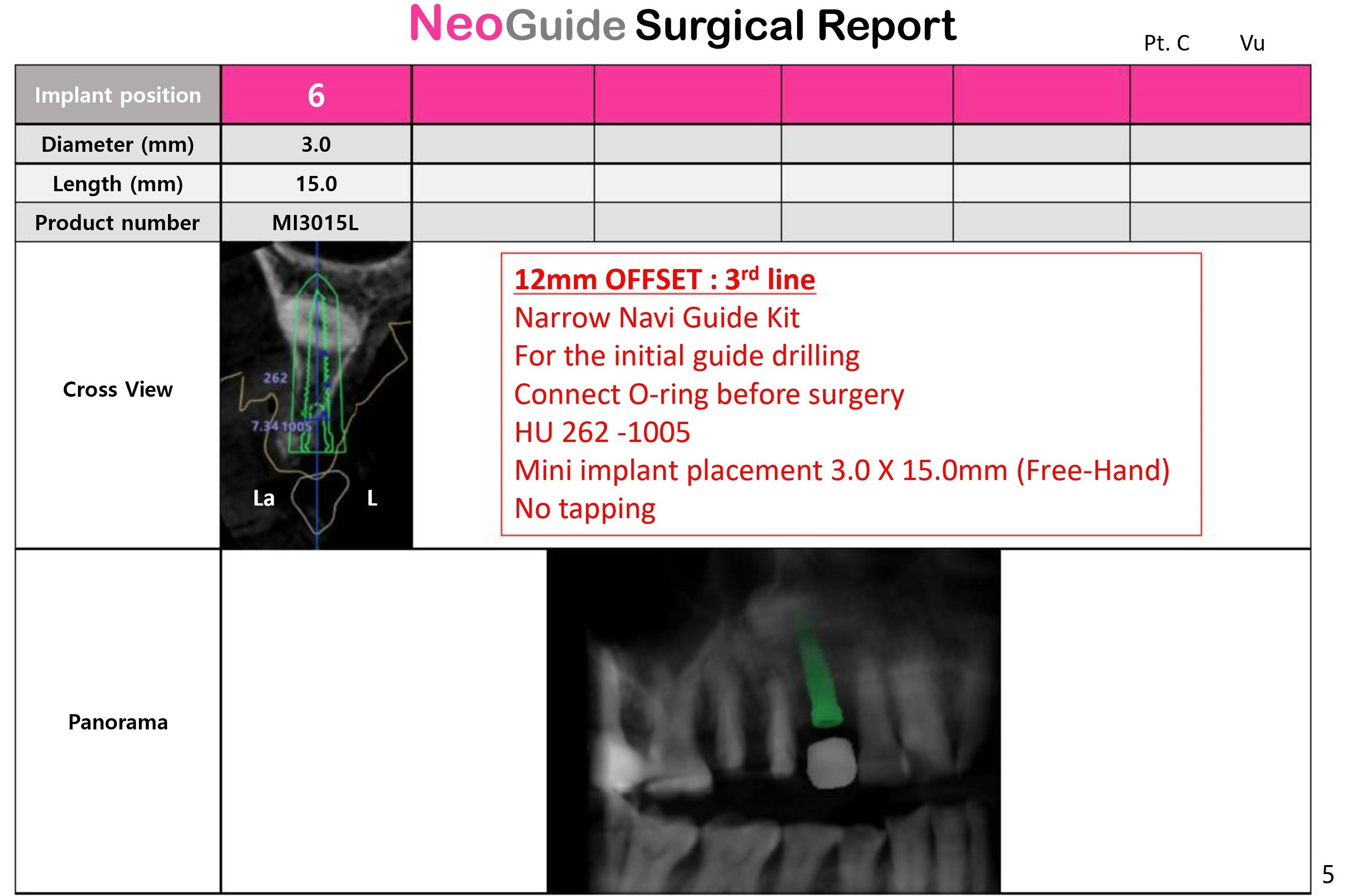 Because of the narrow ridge and short bone, try in the guide, anesthetize (double anesthetics), start initial osteotomy with the guide and lay flaps for #6 impacted tooth removal. Use IS mini implant kit to finish the osteotomy free hand, hopefully entering the upper border of the extraction socket for 2-pointed fixation. Find the surgical stent for possible new temporary FPD.