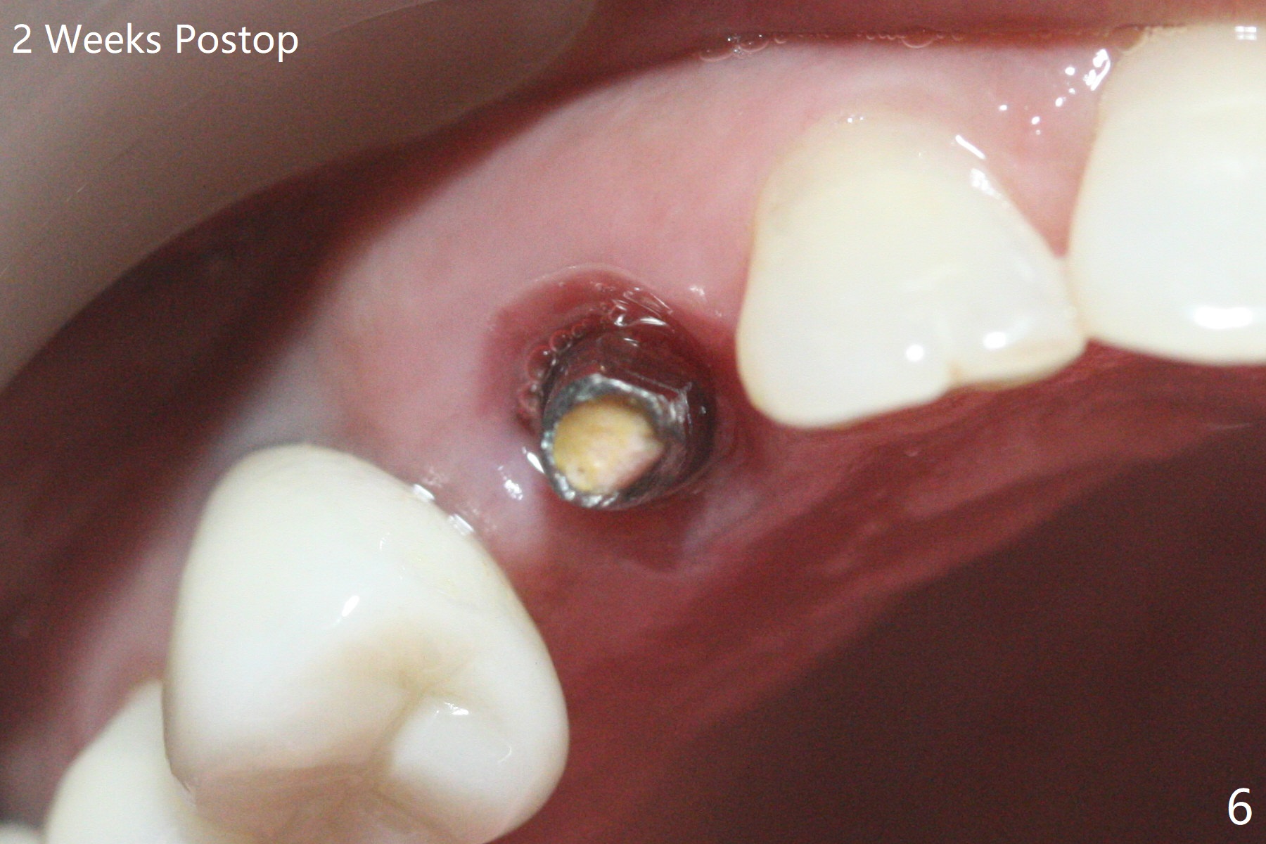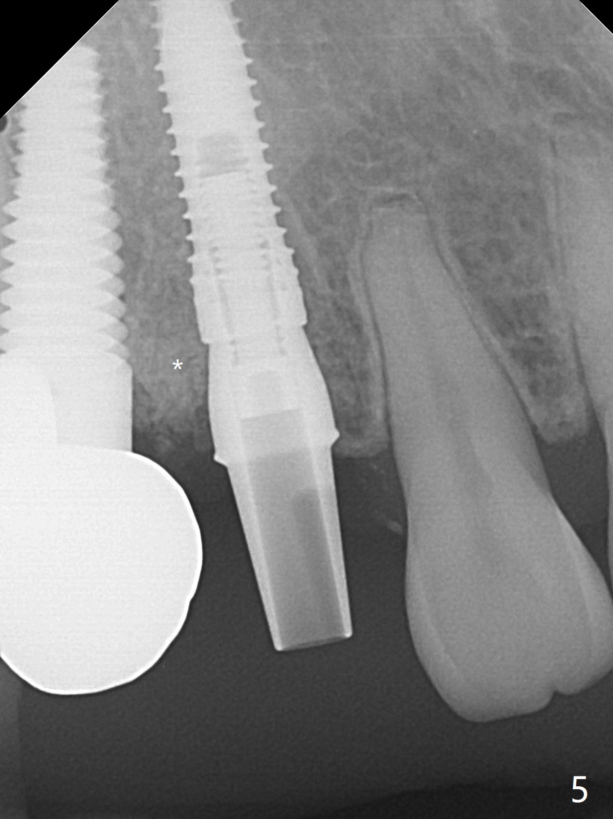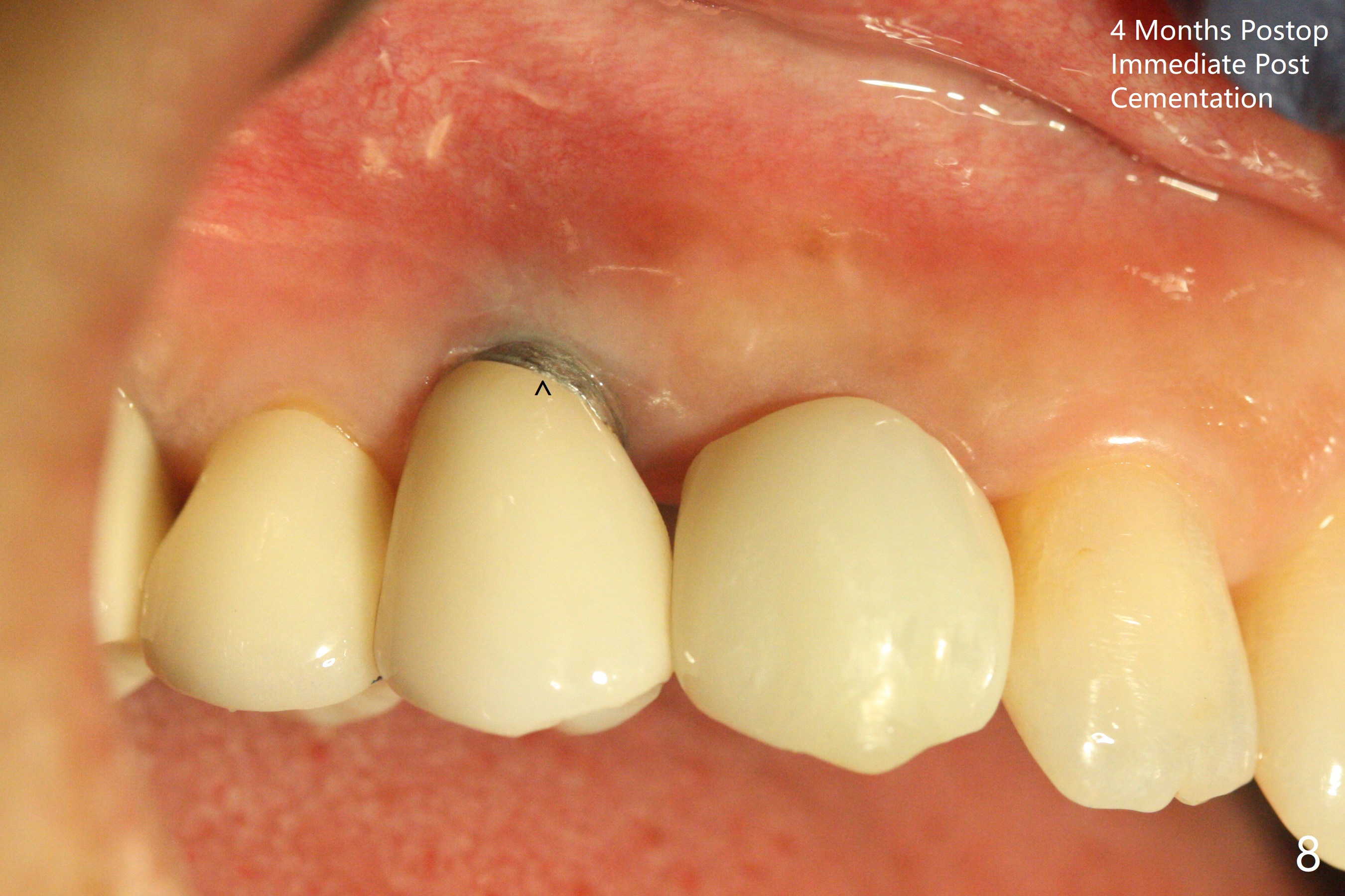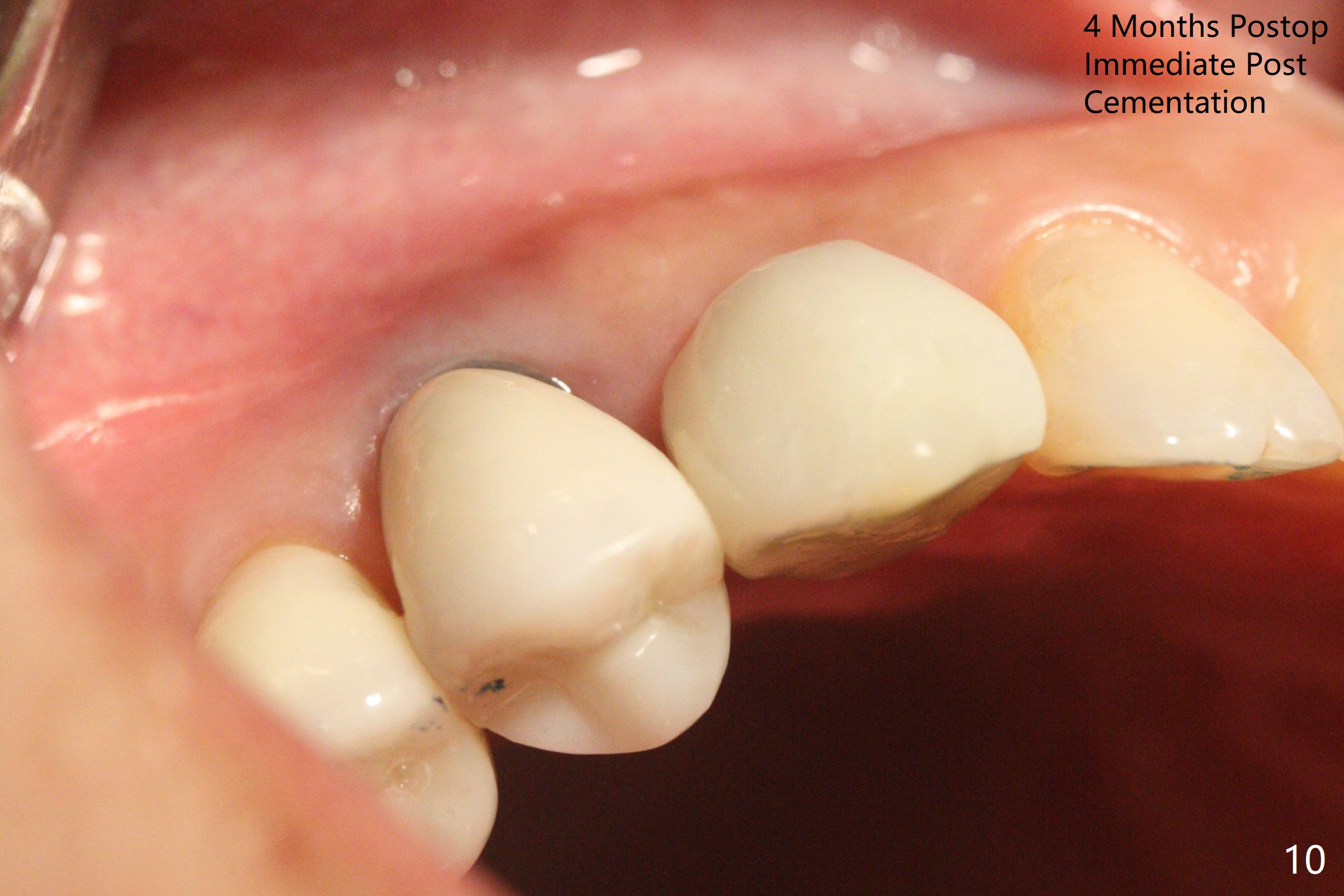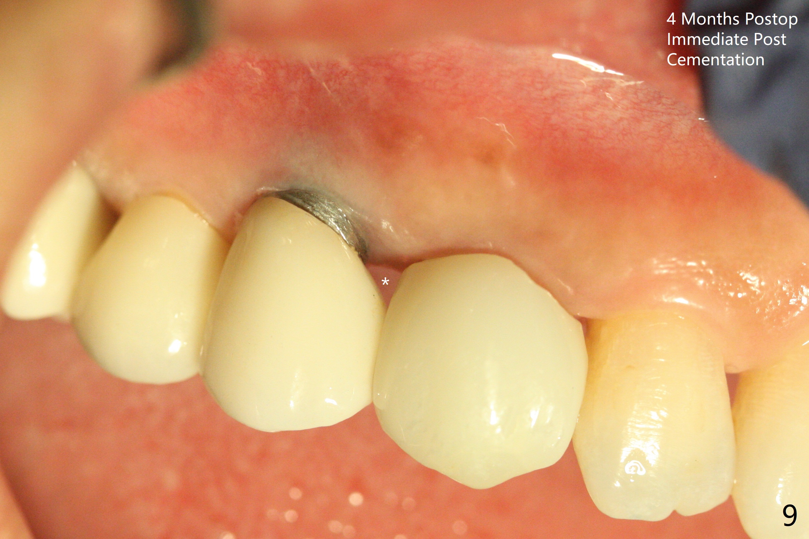 When the recemented crown at #6 is removed, the post is found to have been fractured. When the tooth is extracted, the socket walls are found intact. After moving the initial osteotomy (Fig.1) mesial, a 3.8x13 mm implant is placed (Fig.2). Clinically it appears supracrestal lingually. So the implant is placed deeper, but a cemented abutment is incompletely seated (Fig.3 <). When a longer abutment is used (easy grasping), it is seated completely (Fig.4). Then sticky bone is packed (Fig.5 *). When an immediate provisional is fabricated and seated, PRF membranes are inserted into the remaining gap between the gingiva and the provisional. Free hand surgery takes time and more intraop X-ray. It is inconvenient with nervous patients. The socket heals 2 weeks postop (Fig.6). The provisional will be next relined and reseated. It is difficult to insert gingival retraction cord 3.5 months postop because of the deep mesial margin. When an abutment with longer cuff is placed, the packing is easier (no biologic width violation, Fig.7 (^: resorbed mesial crest), as compared to Fig.5). When the crown is cemented (un-esthetic due to failure of use of temporary abutment), the metal shows at #5 with gingival recession because of buccal placement (Fig.8-10). Bone resorption is severe between #5 and 6 (Fig.7), as related to large gingival embrasure (Fig.9 *). When #5 crow is redone, move the gingival margin apical and fabricate provisional.