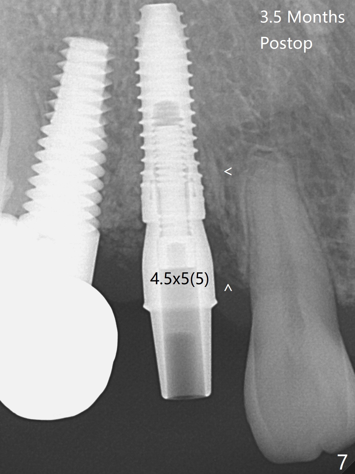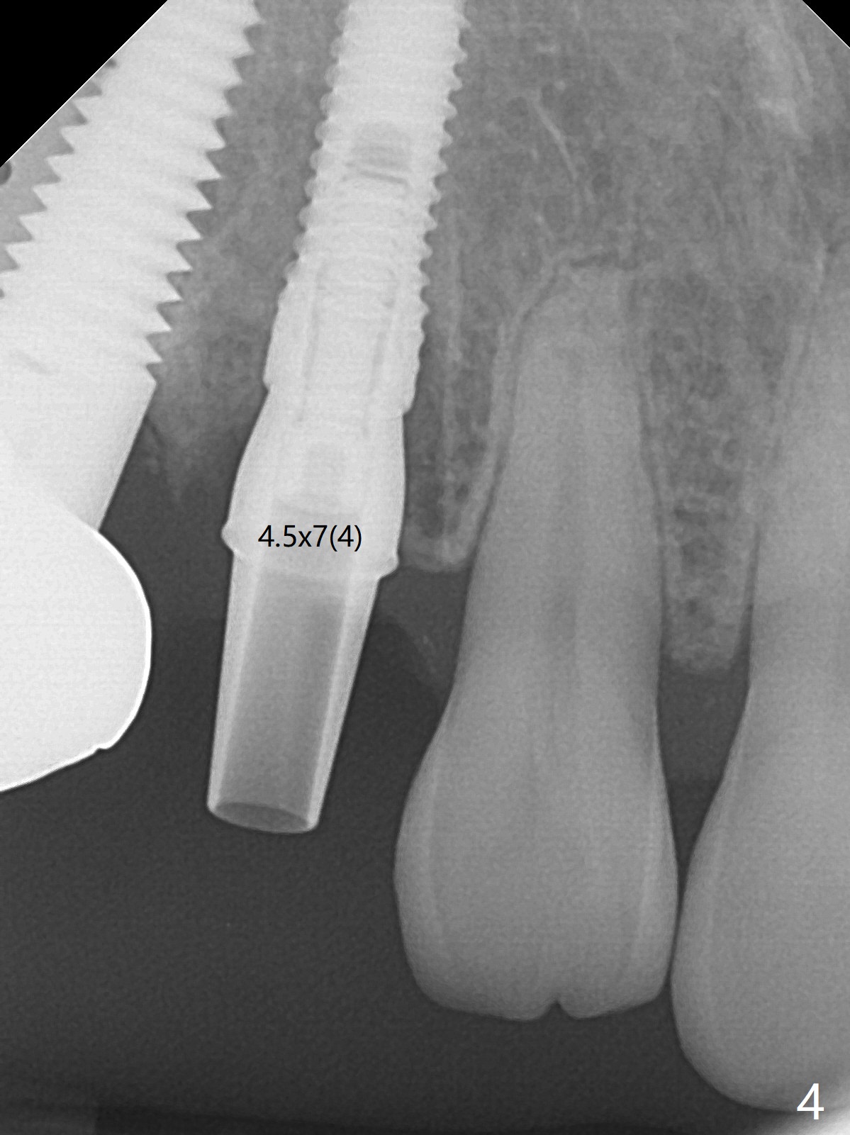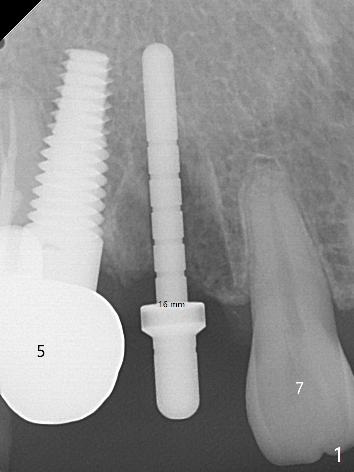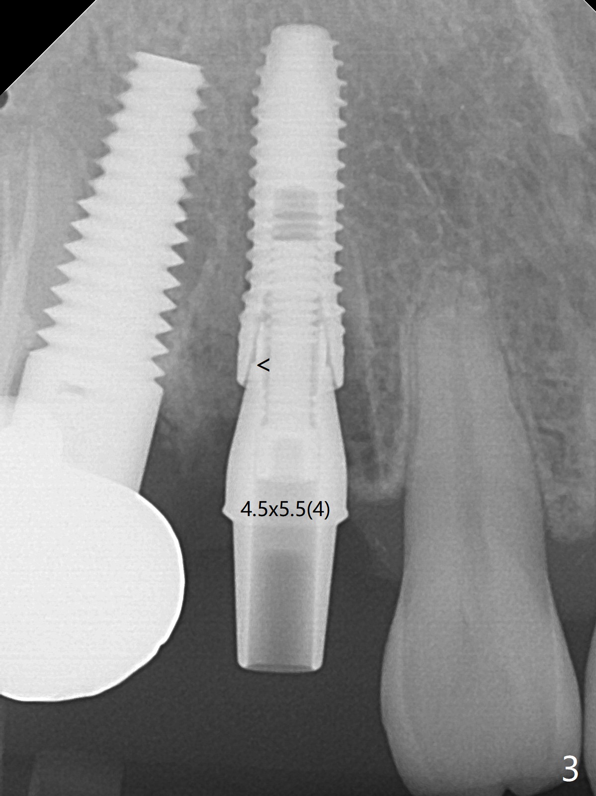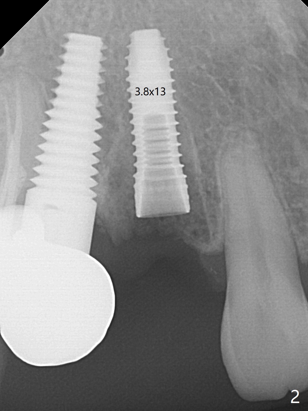 When the recemented crown at #6 is removed, the post is found to have been fractured. When the tooth is extracted, the socket walls are found intact. After moving the initial osteotomy (Fig.1) mesial, a 3.8x13 mm implant is placed (Fig.2). Clinically it appears supracrestal lingually. So the implant is placed deeper, but a cemented abutment is incompletely seated (Fig.3 <). When a longer abutment is used (easy grasping), it is seated completely (Fig.4). Then sticky bone is packed (Fig.5 *). When an immediate provisional is fabricated and seated, PRF membranes are inserted into the remaining gap between the gingiva and the provisional. Free hand surgery takes time and more intraop X-ray. It is inconvenient with nervous patients. The socket heals 2 weeks postop (Fig.6). The provisional will be next relined and reseated. It is difficult to insert gingival retraction cord 3.5 months postop because of the deep mesial margin. When an abutment with longer cuff is placed, the packing is easier (no biologic width violation, Fig.7 (^: resorbed mesial crest), as compared to Fig.5). When the crown is cemented (un-esthetic due to failure of use of temporary abutment), the metal shows at #5 with gingival recession because of buccal placement (Fig.8-10). Bone resorption is severe between #5 and 6 (Fig.7), as related to large gingival embrasure (Fig.9 *). When #5 crow is redone, move the gingival margin apical and fabricate provisional.