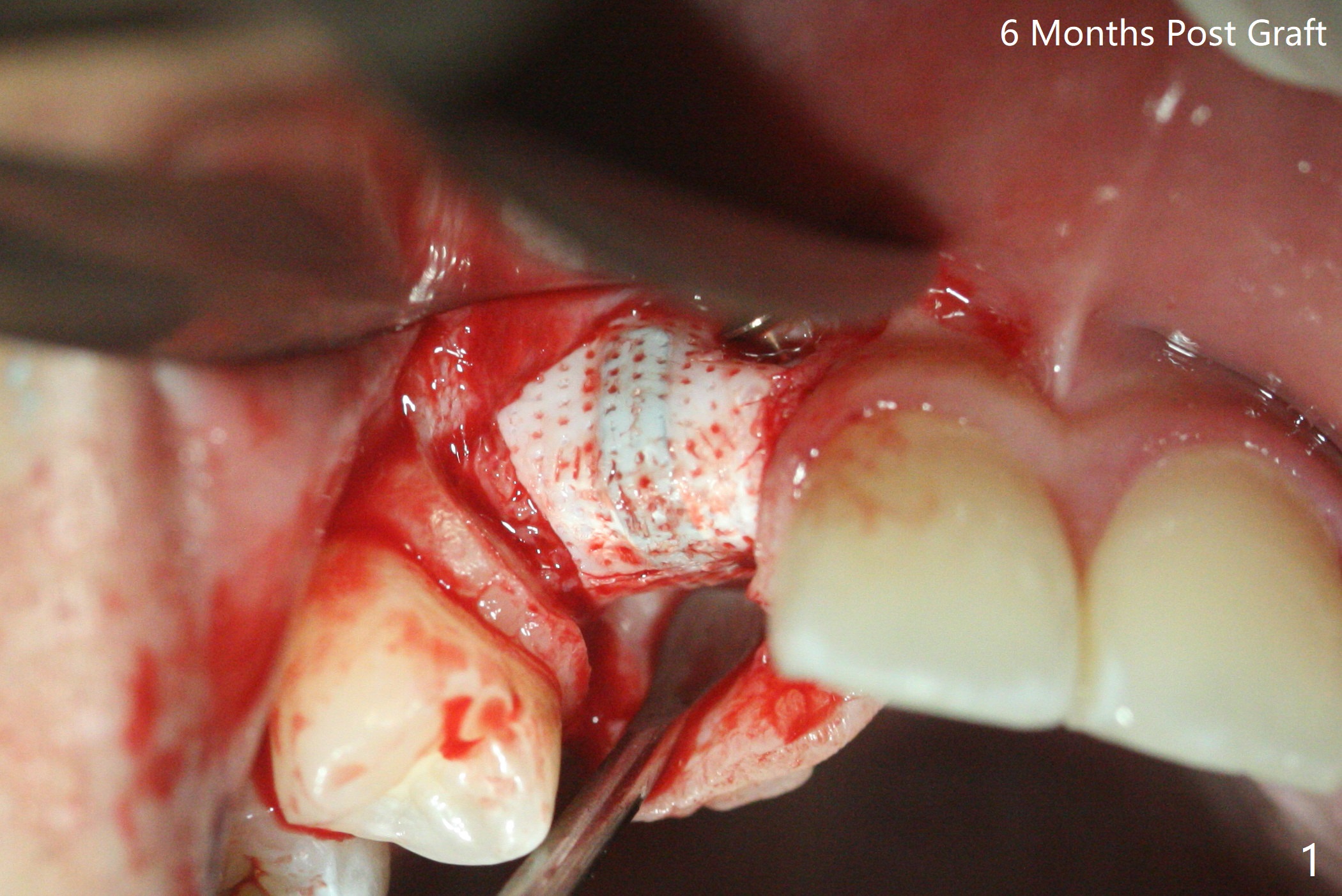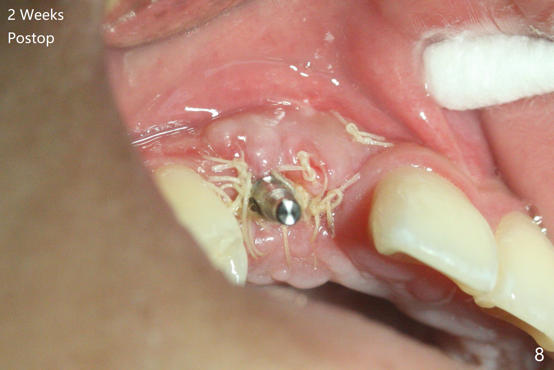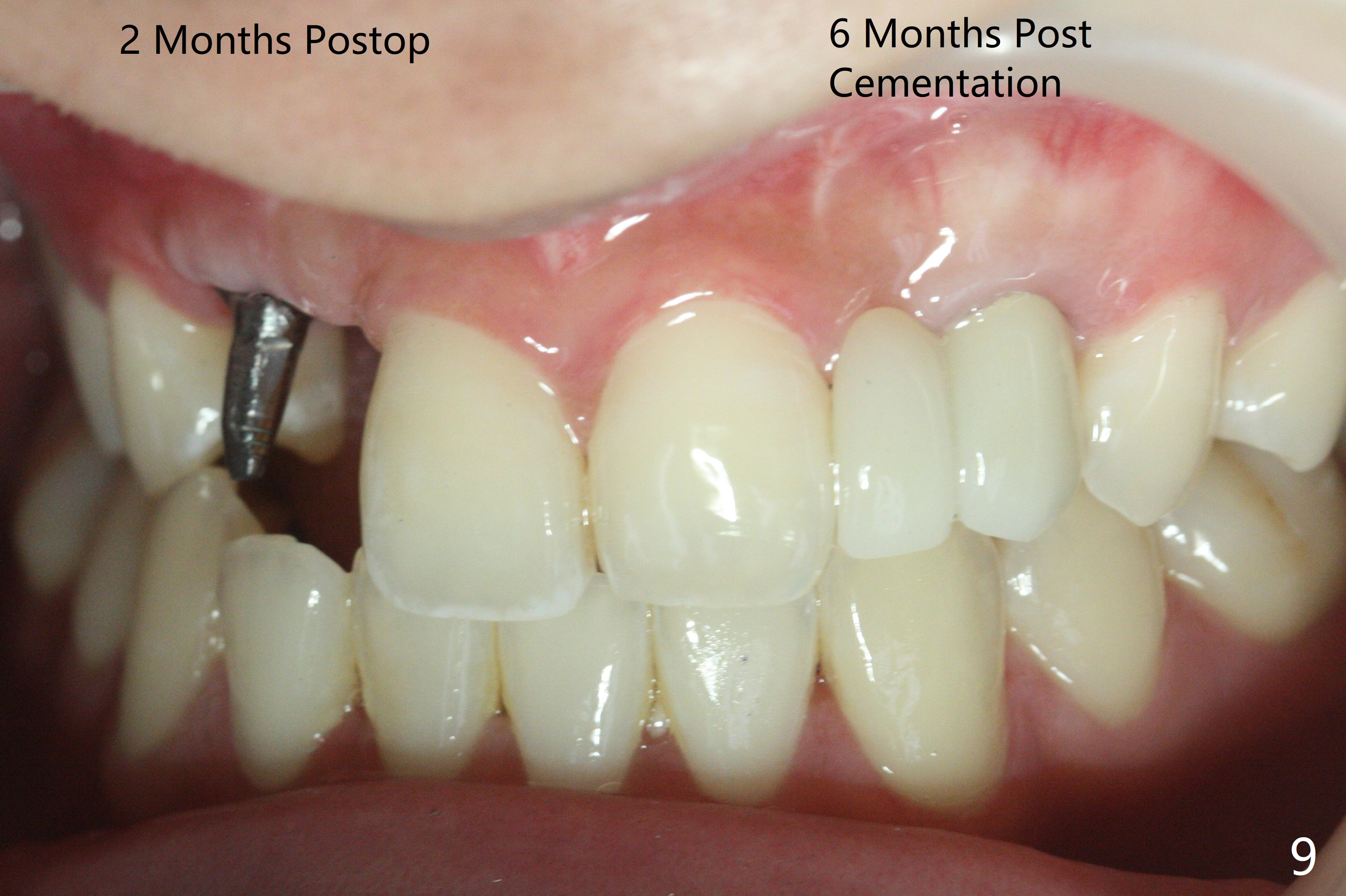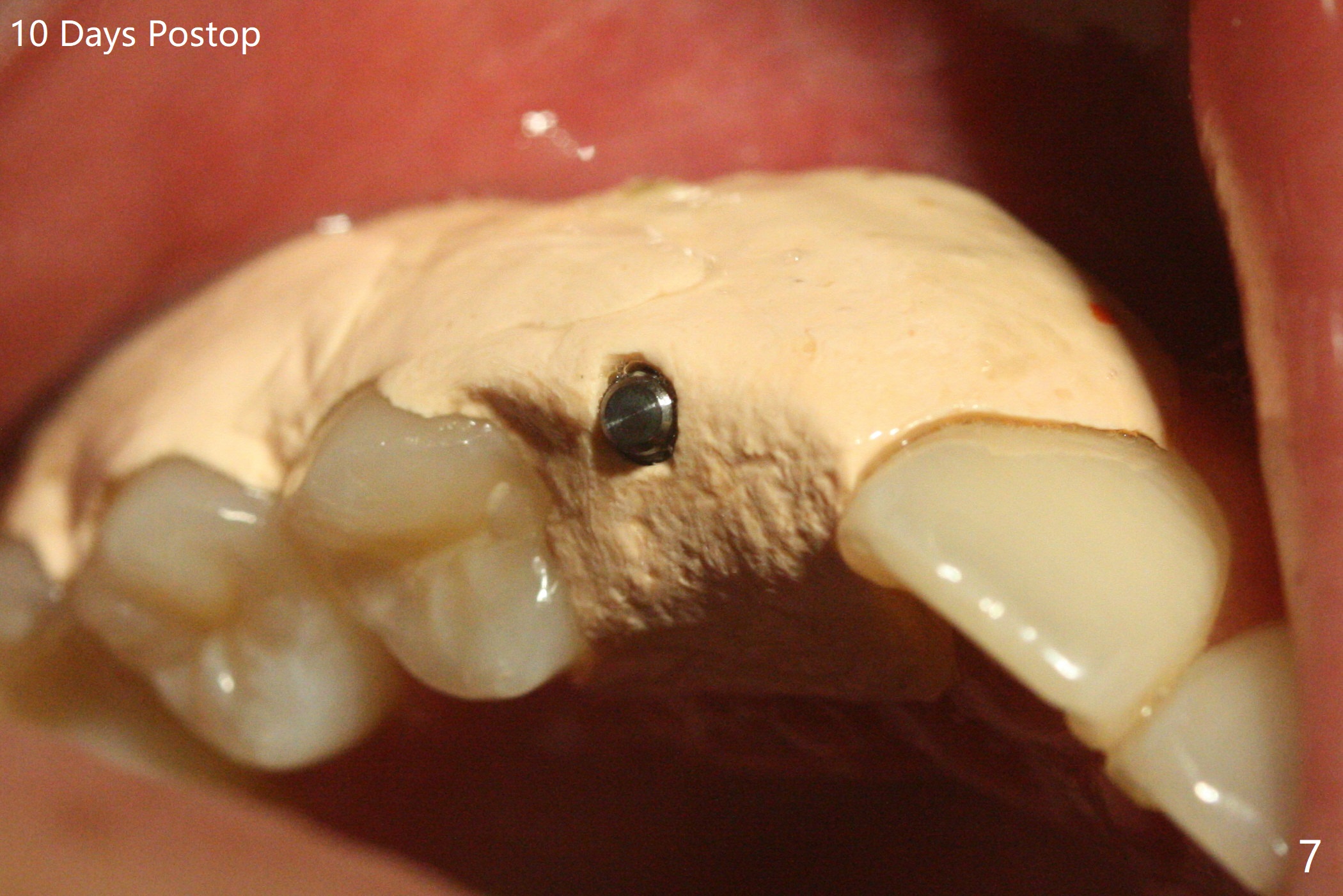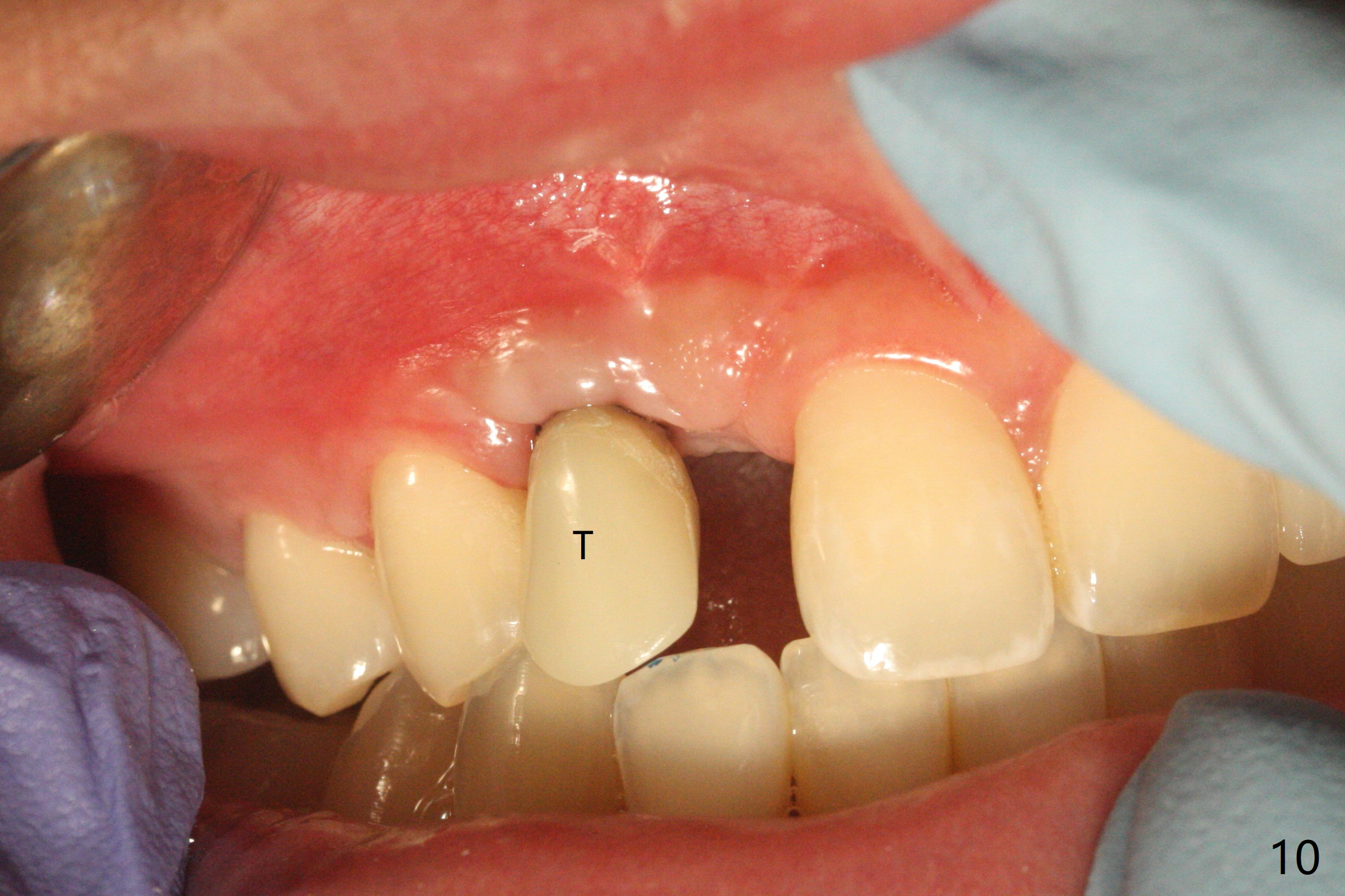 右上尖牙植体拔除,植骨后6个月,切开显示不可吸收膜覆盖的牙槽骨尚饱满(图一),不可吸收膜下面形成一个膜(可能是骨膜,图二:M),在导板指导下,植入3x12(2)毫米一段式植体,颊侧(图三),腭侧(图四)骨下,稍微穿过窦底(图五),植体覆盖粘性骨粉(图六)和PRF膜后,4-0 PGA缝合。伤口有一定张力,使用牙周敷料。术后10天没有疼痛(就没有骨坏死),由于基台存在,牙周敷料没有脱落迹象(图七),也没有撤除。敷料术后13天脱落,伤口好像正常愈合(图八)。由于病人即将回外州上学,提前取模。他喜欢左边牙冠修复形式(牙冠覆盖牙龈),而我们想让牙冠位于牙龈舌侧(图十:T(临时牙冠))。