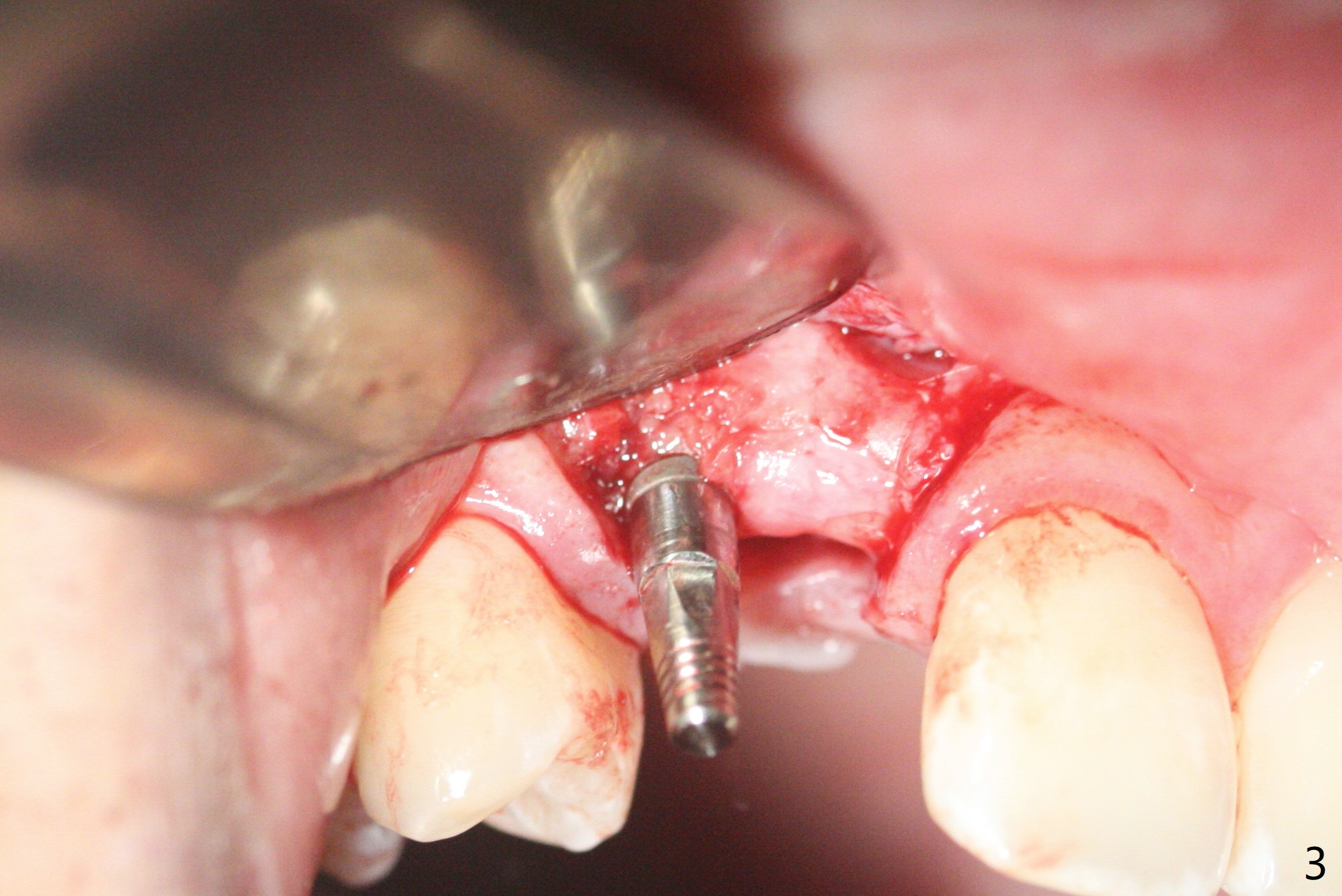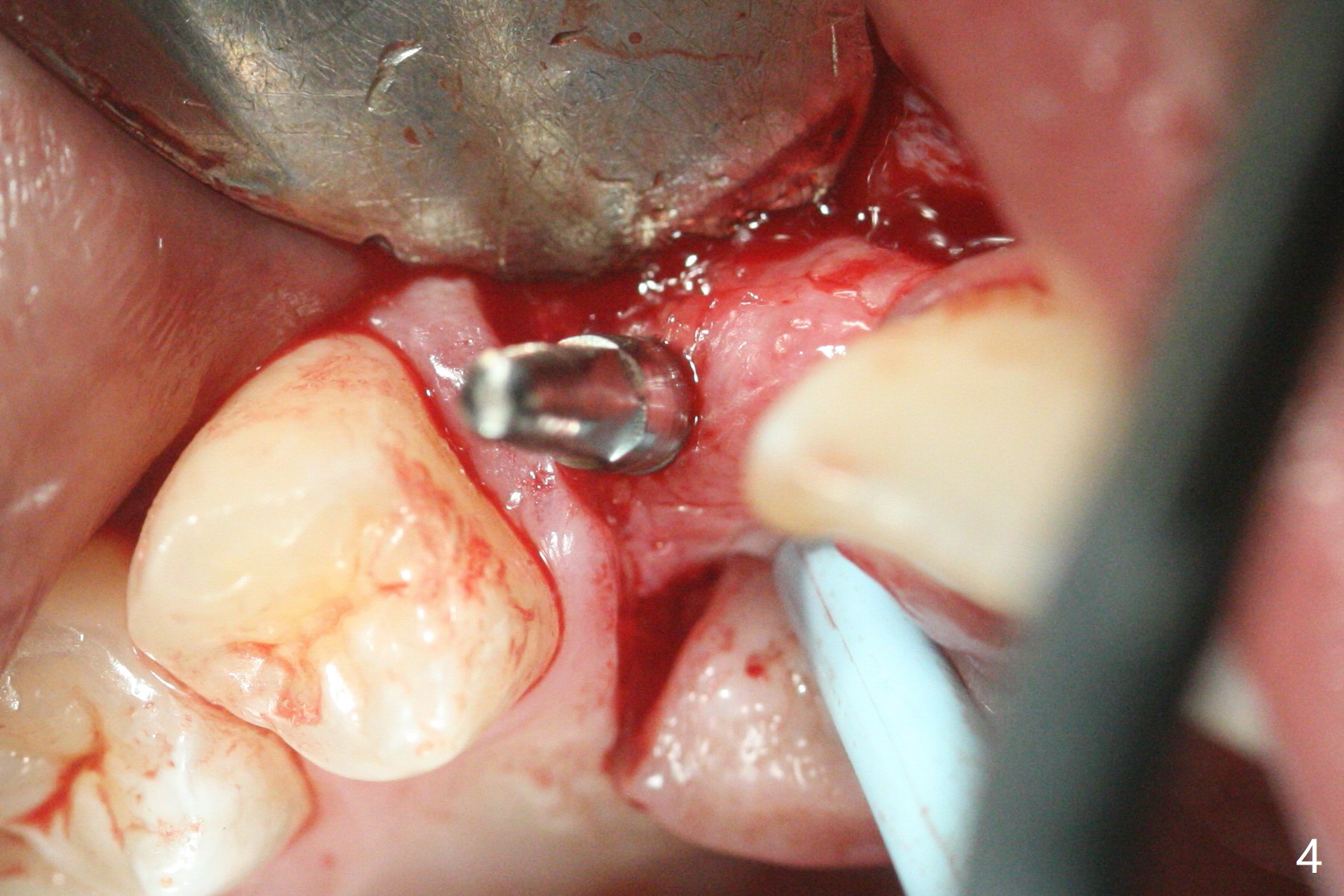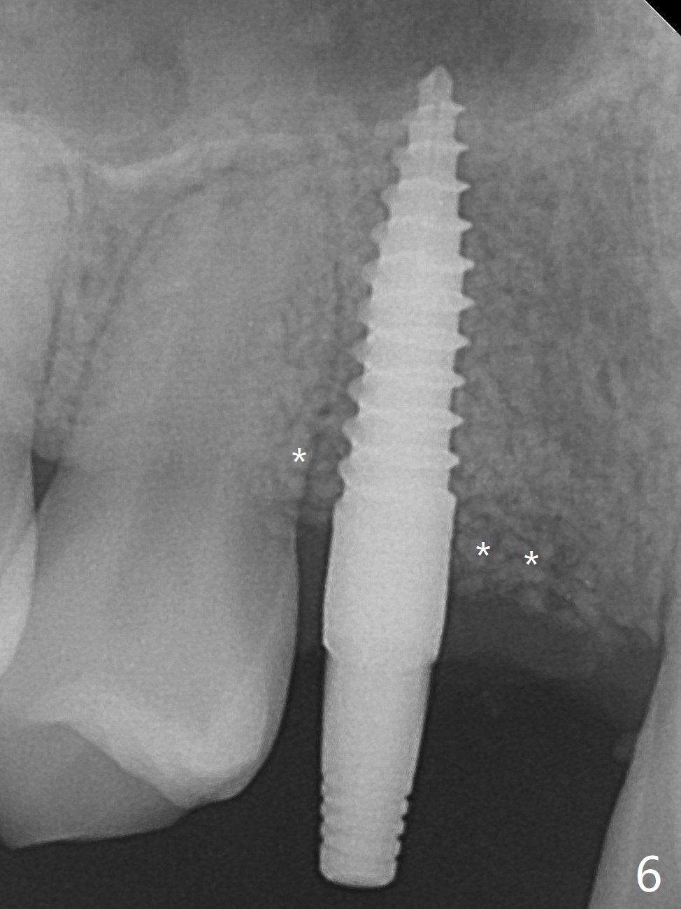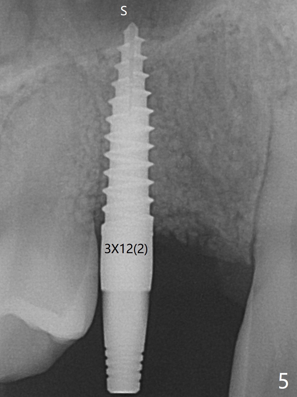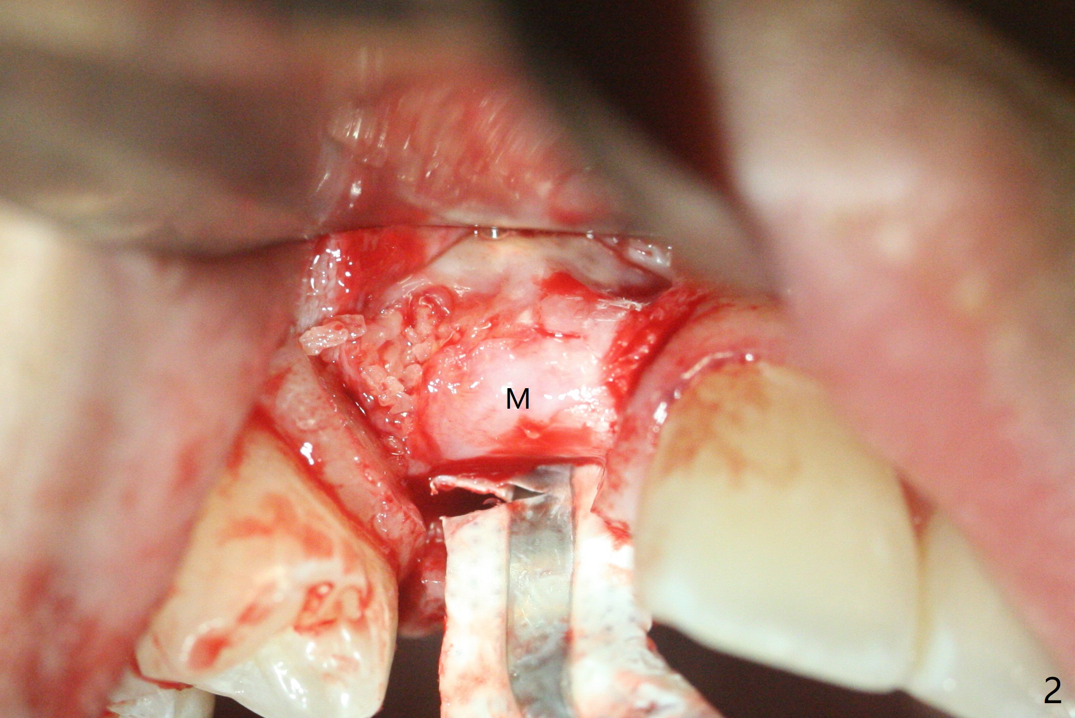 右上尖牙植体拔除,植骨后6个月,切开显示不可吸收膜覆盖的牙槽骨尚饱满(图一),不可吸收膜下面形成一个膜(可能是骨膜,图二:M),在导板指导下,植入3x12(2)毫米一段式植体,颊侧(图三),腭侧(图四)骨下,稍微穿过窦底(图五),植体覆盖粘性骨粉(图六)和PRF膜后,4-0 PGA缝合。伤口有一定张力,使用牙周敷料。术后10天没有疼痛(就没有骨坏死),由于基台存在,牙周敷料没有脱落迹象(图七),也没有撤除。敷料术后13天脱落,伤口好像正常愈合(图八)。由于病人即将回外州上学,提前取模。他喜欢左边牙冠修复形式(牙冠覆盖牙龈),而我们想让牙冠位于牙龈舌侧(图十:T(临时牙冠))。